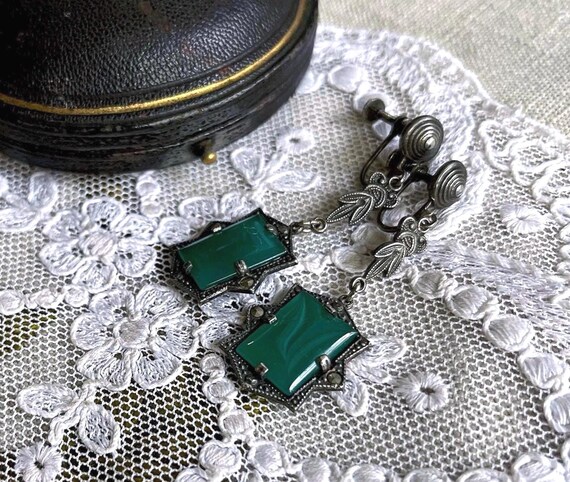 Antique 1920s Sterling Silver Onyx Marcasite Drop Earrings