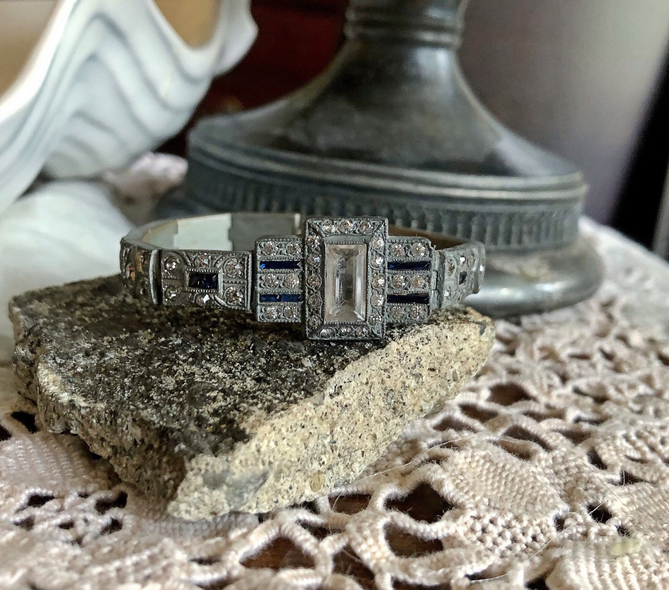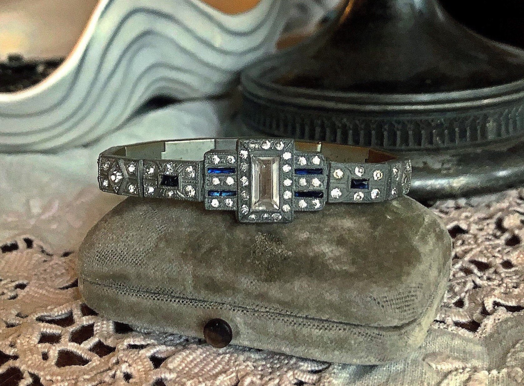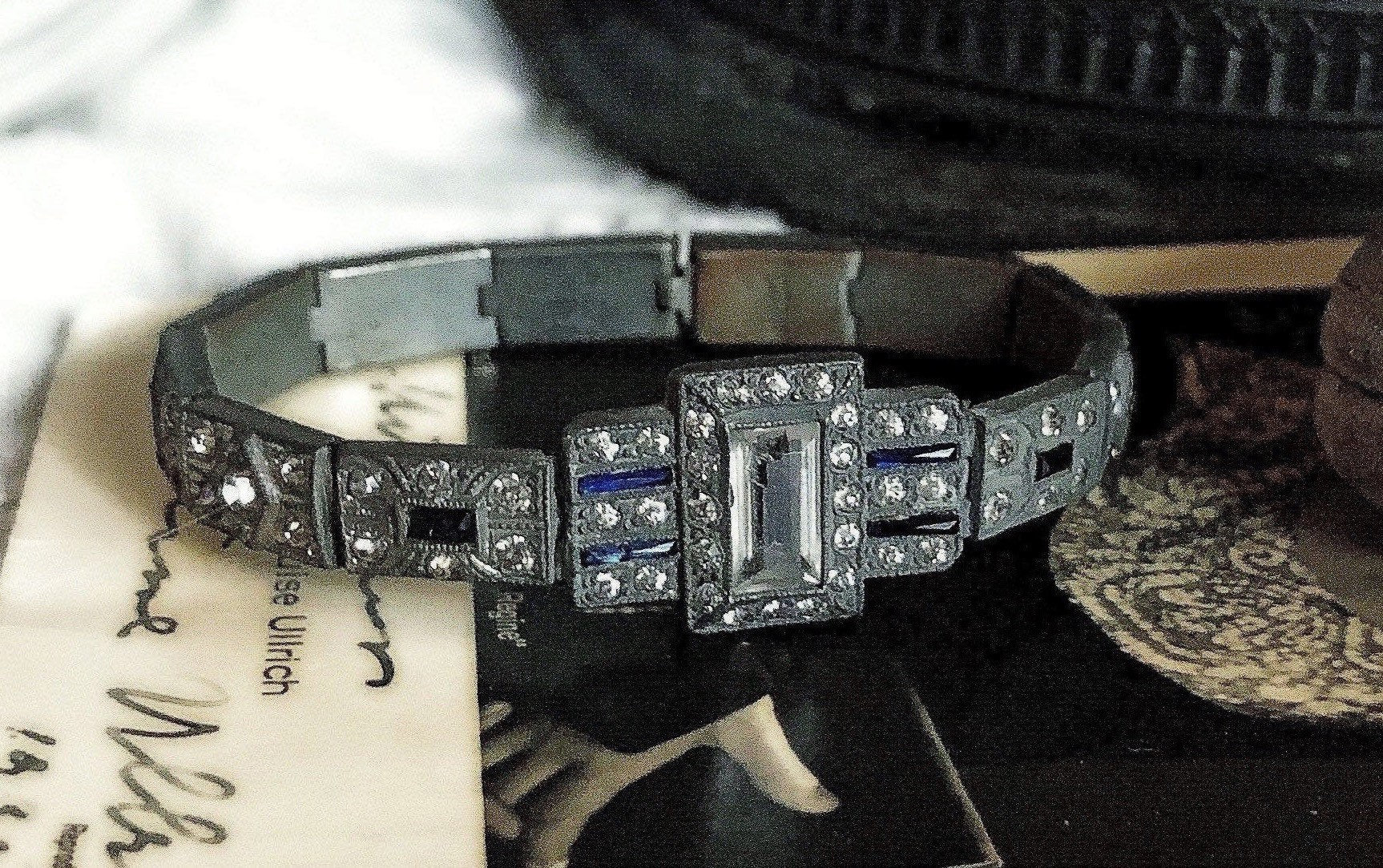Vintage Art Deco 1930s Nov-E-Line rhodium plated base metal ornate link bracelet featuring sparkling round and emerald cut Paste Rhinestones in closed back settings. Bracelet is in good vintage condition with working slide clasp, definite patina with all stones accounted for. This collectible vintage bracelet measures approximately 6 inches around at 10.8 grams respectively. The beautiful patina looks smashing on the arm, collectible and wearable!