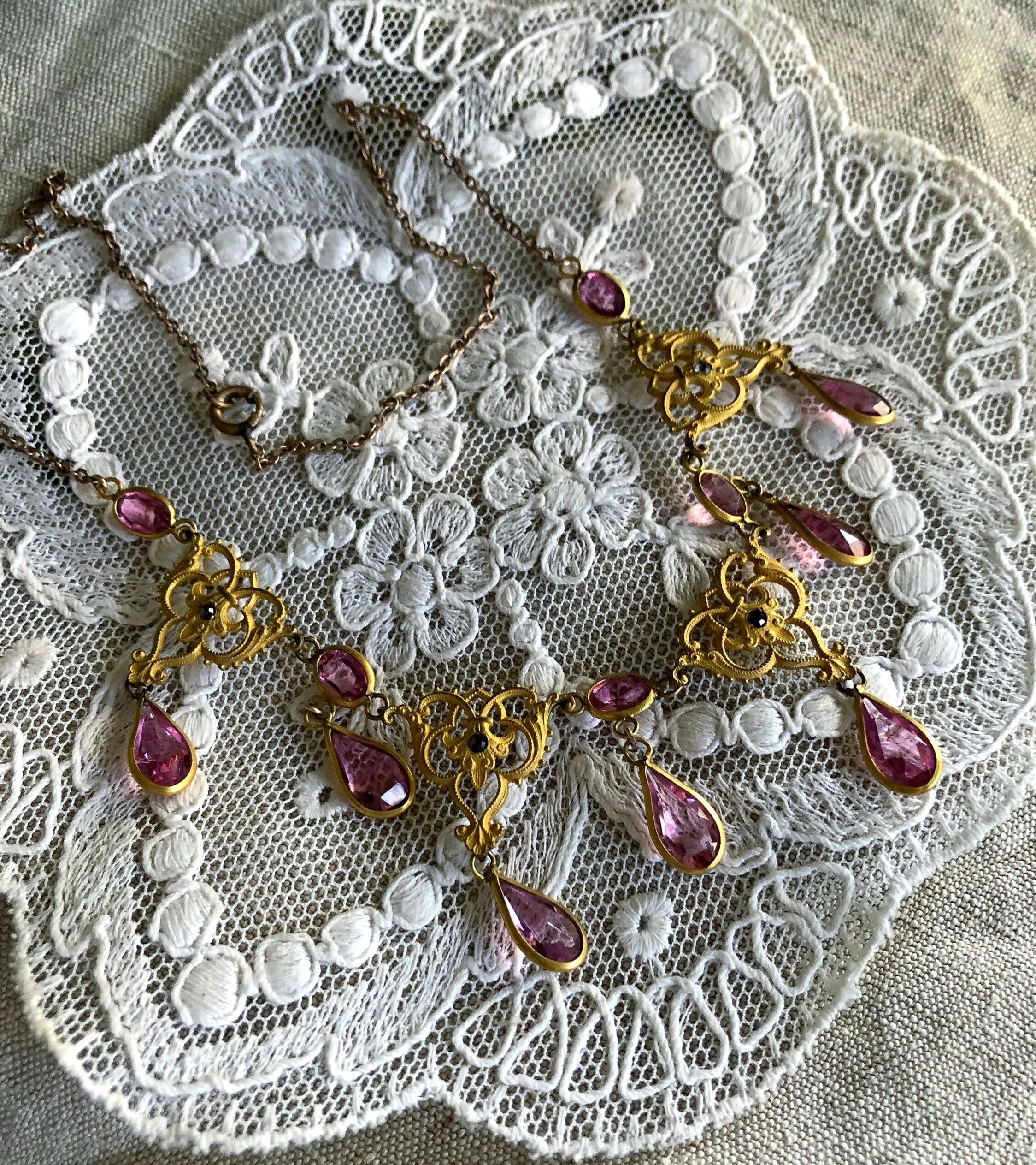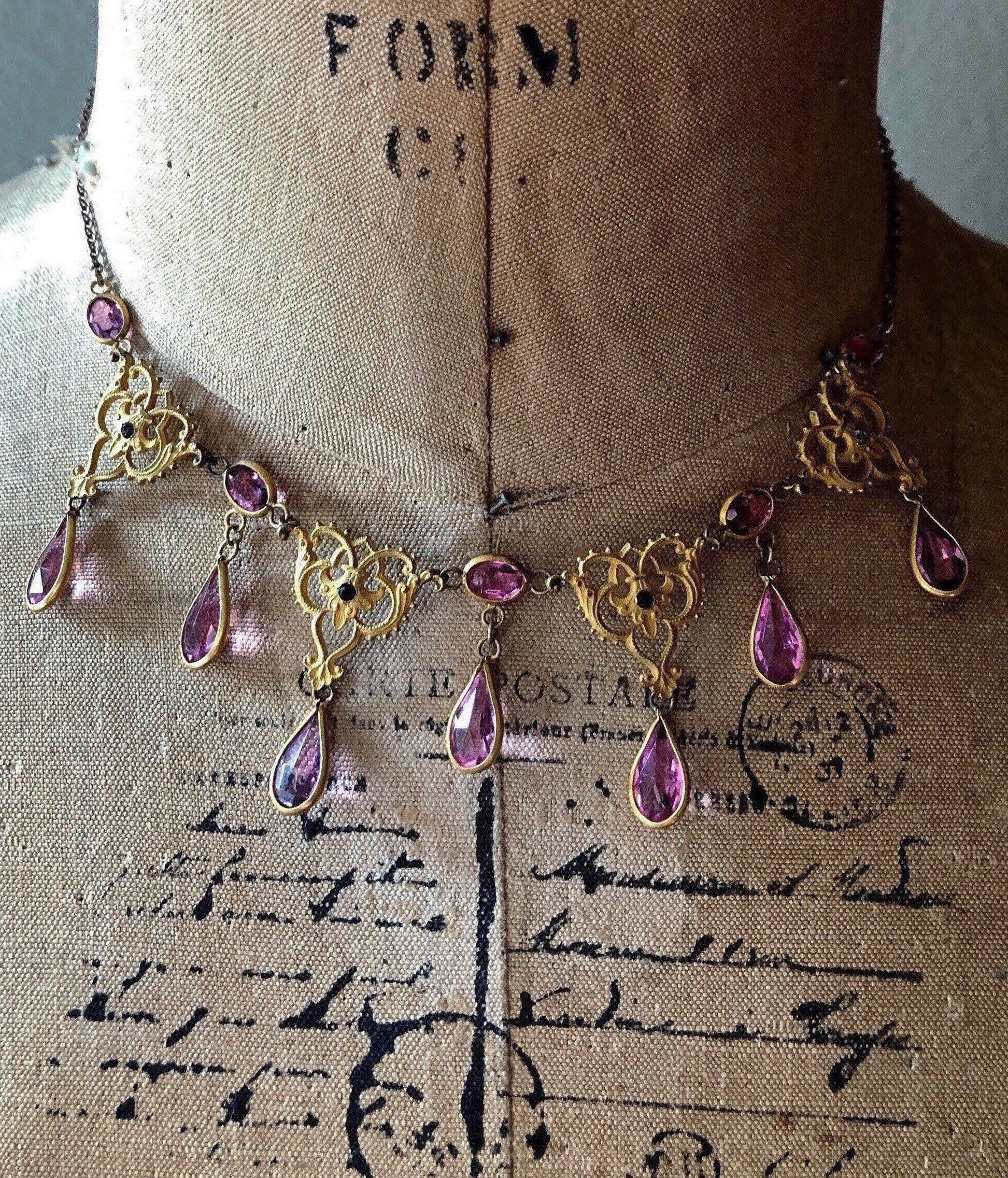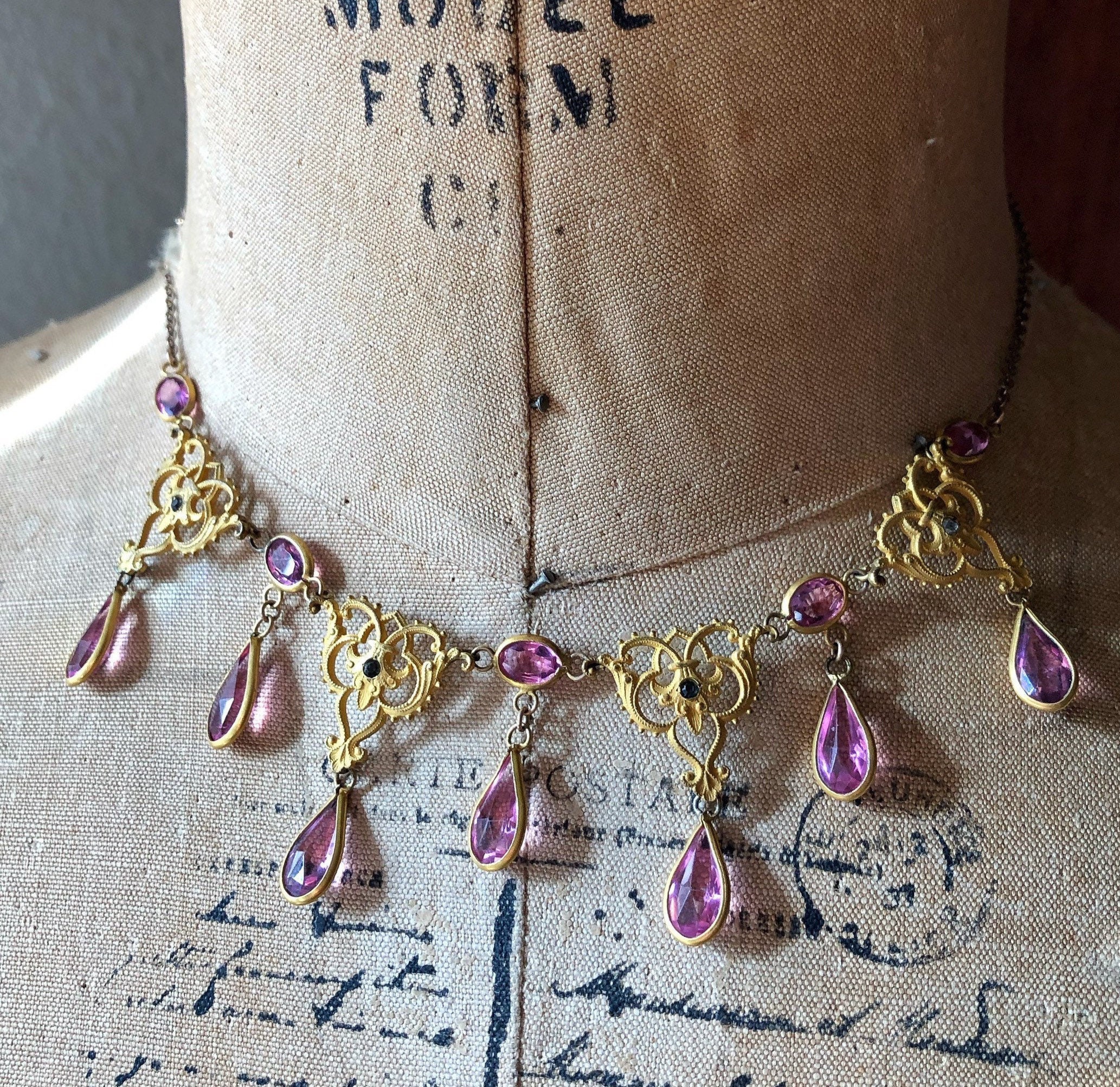 Featuring an absolutely gorgeous antique Victorian Aesthetic movement gold rolled gilded brass decorative bib choker necklace adorned with brilliant sparkling faceted Pink paste stone drops accented with round faceted paste stone accents. Necklace measures approximately 14 inches around at 10.1 grams respectively. This stately piece is in excellent antique condition with virtually no wear, a slight patina, a functional antique thumbless clasp with all stones intact and accounted for. This gorgeous necklace sits beautifully on the neck, an investment heirloom piece!