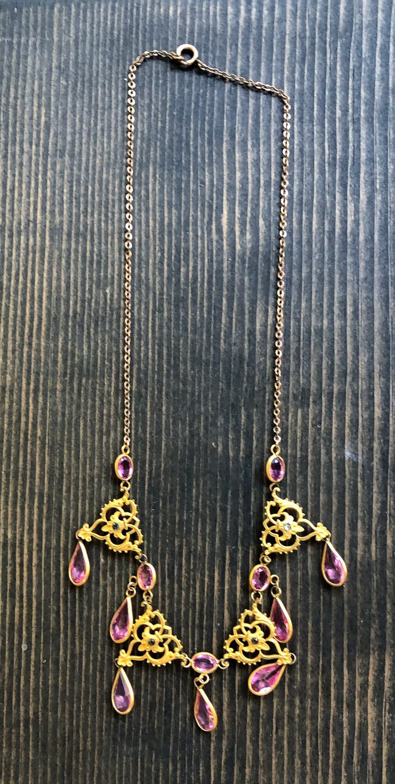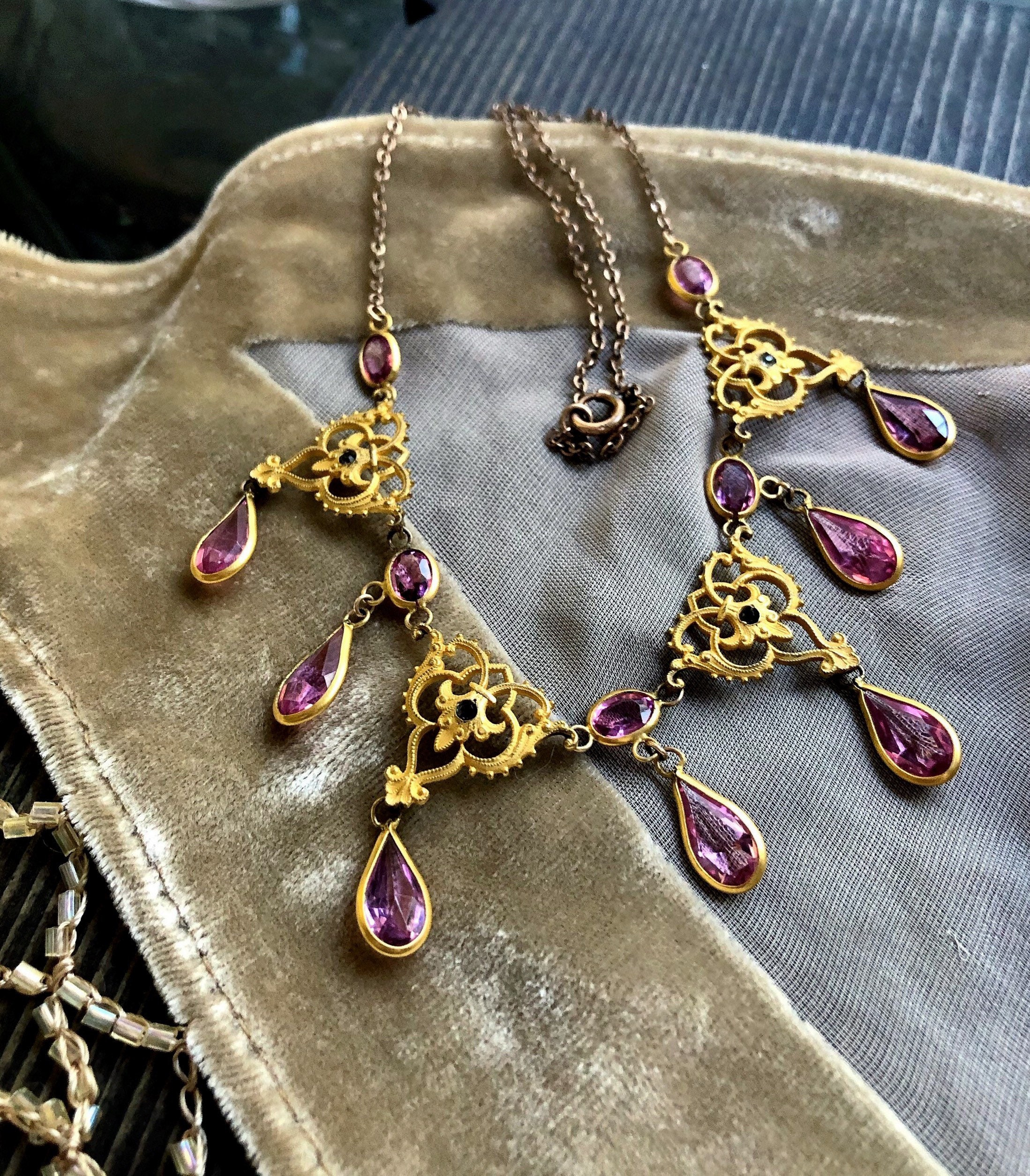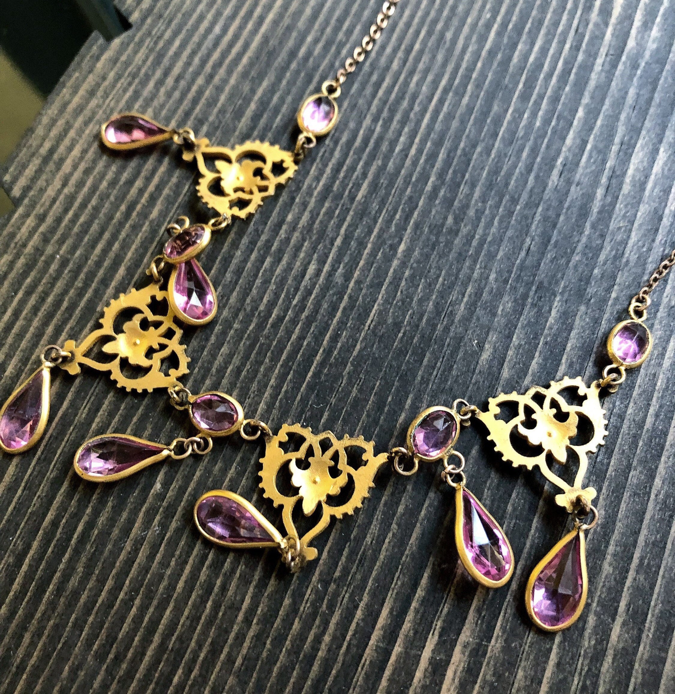 Featuring an absolutely gorgeous antique Victorian Aesthetic movement gold rolled gilded brass decorative bib choker necklace adorned with brilliant sparkling faceted Pink paste stone drops accented with round faceted paste stone accents. Necklace measures approximately 14 inches around at 10.1 grams respectively. This stately piece is in excellent antique condition with virtually no wear, a slight patina, a functional antique thumbless clasp with all stones intact and accounted for. This gorgeous necklace sits beautifully on the neck, an investment heirloom piece!