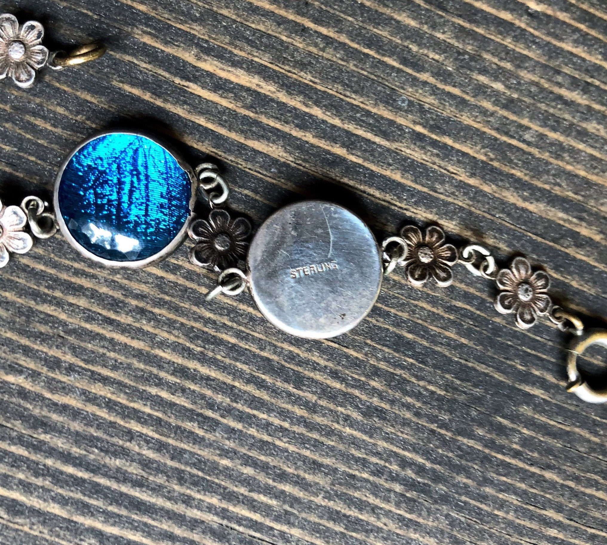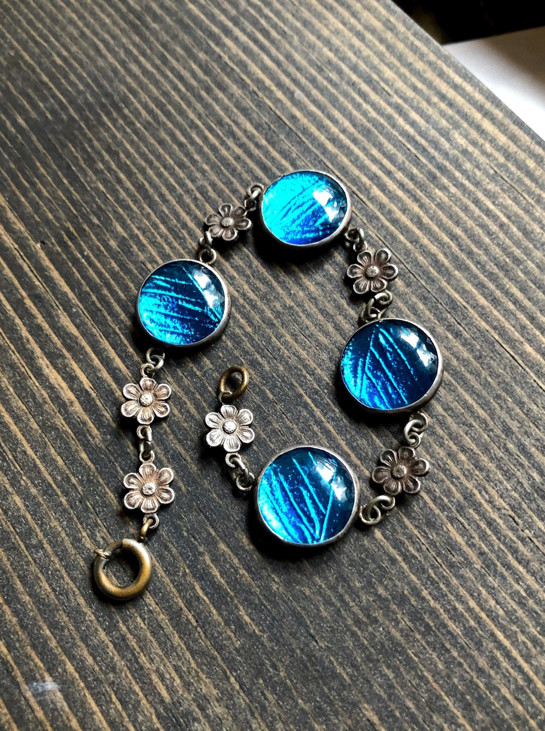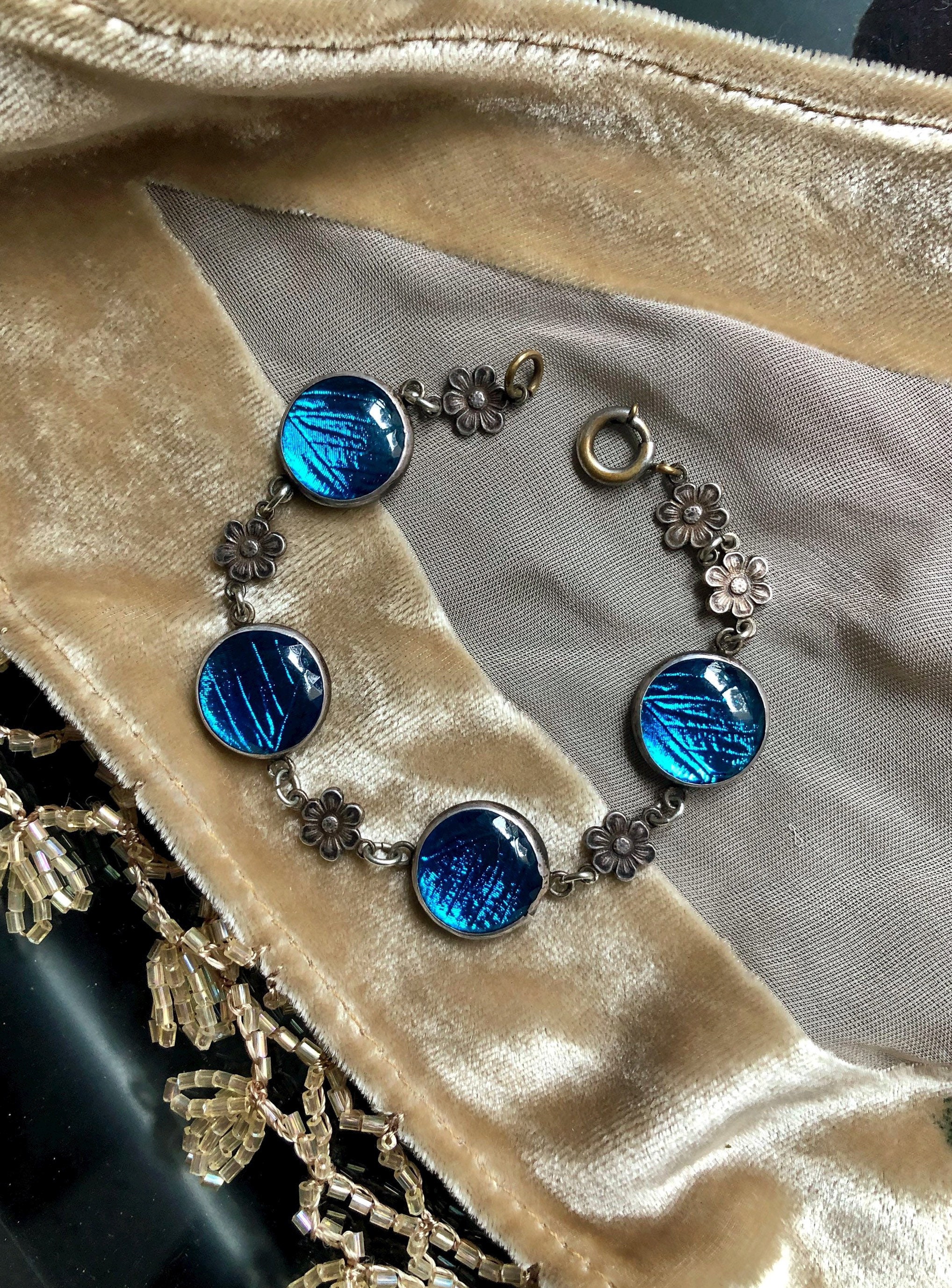 Featuring an ethereal antique Arts and Crafts Art Nouveau Bohemian 1900-1909 signed Sterling Silver link bracelet adorned with beautiful iridescent turquoise blue Morpho Butterfly wing round connectors with dainty sterling flower accents. Bracelet measures approximately 7 inches around at 3.4 grams respectively and is in excellent antique condition with working antique thumbless clasp. Minimal patina with all components intact. Such a unique and beautiful antique bracelet!