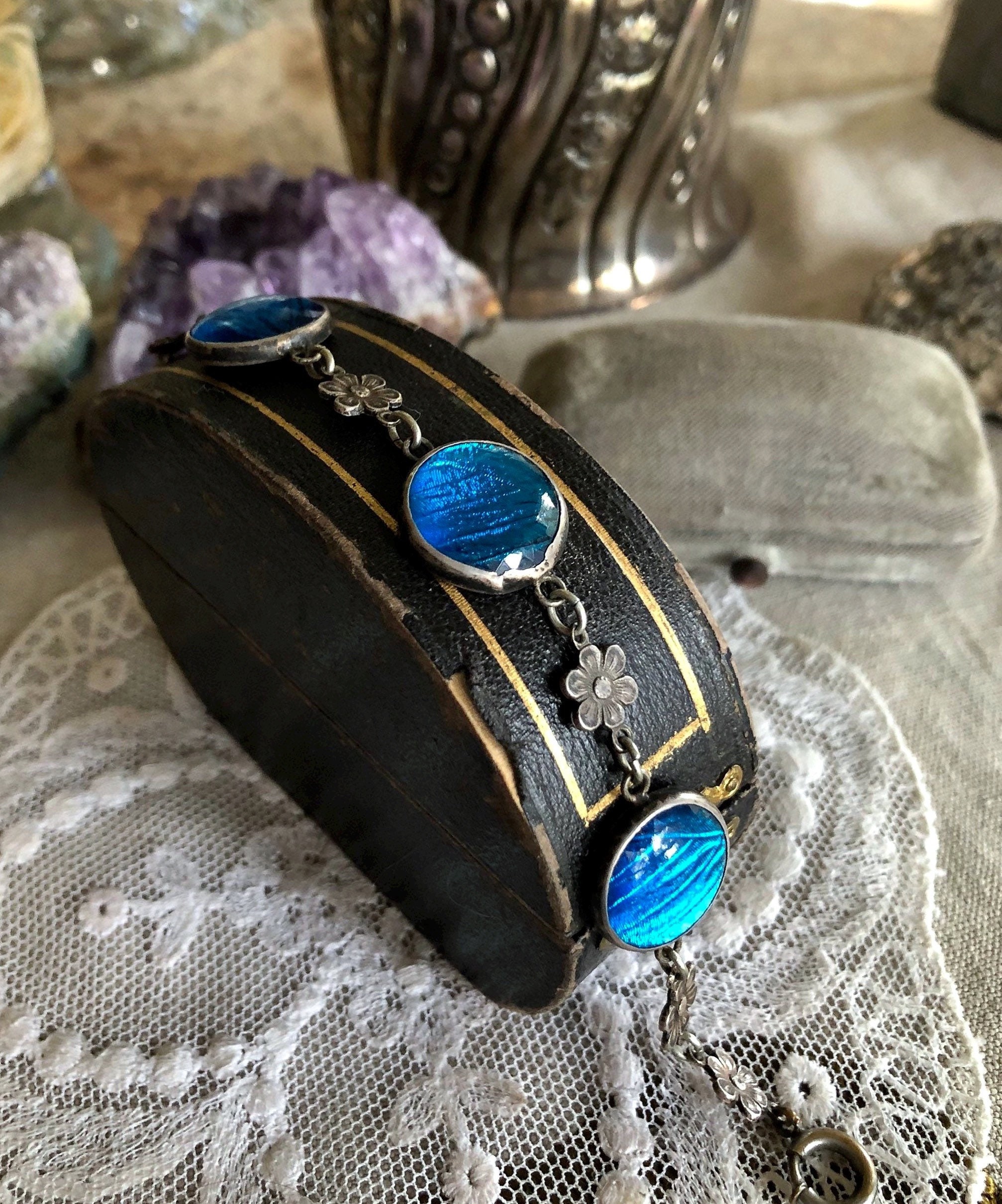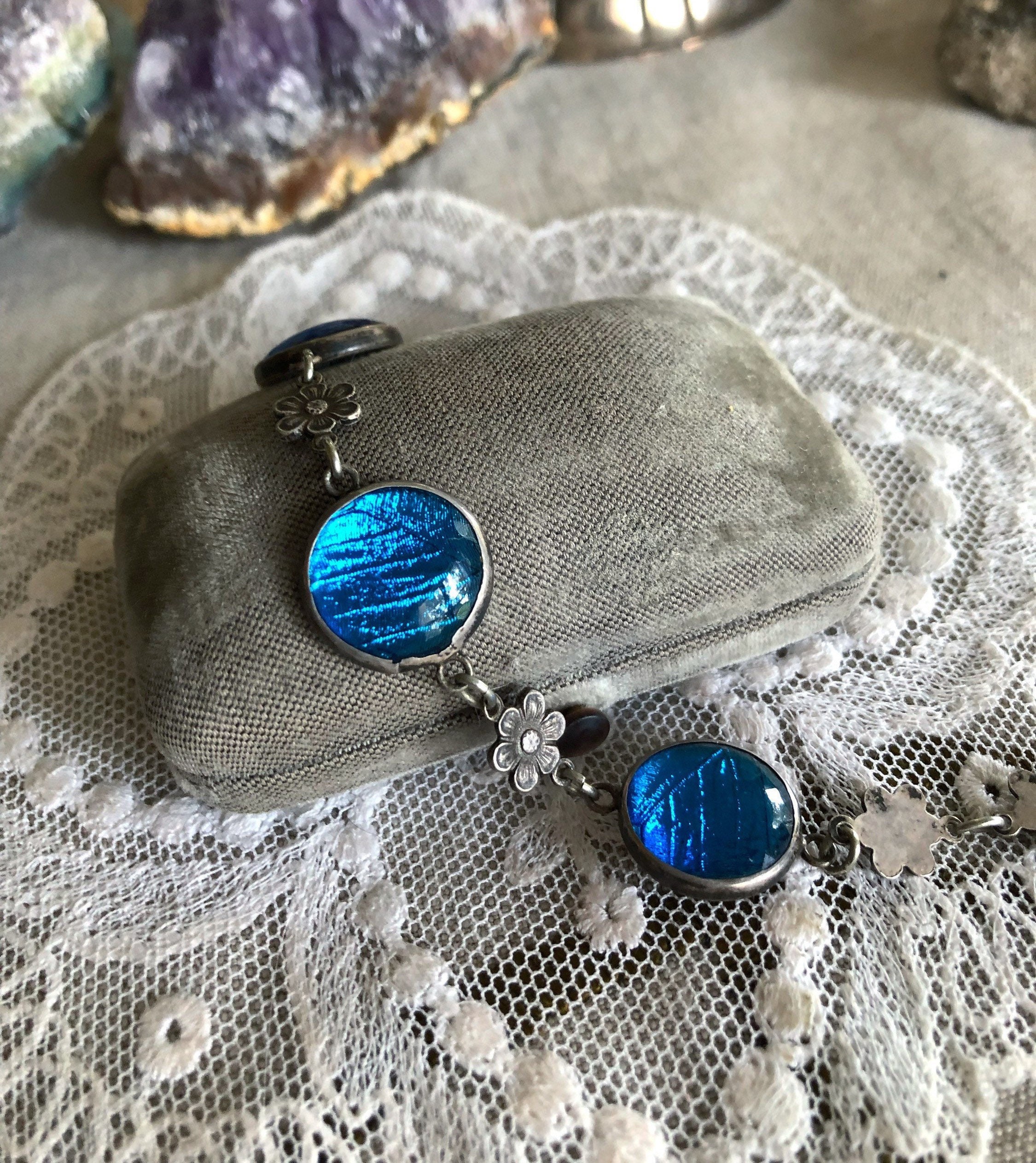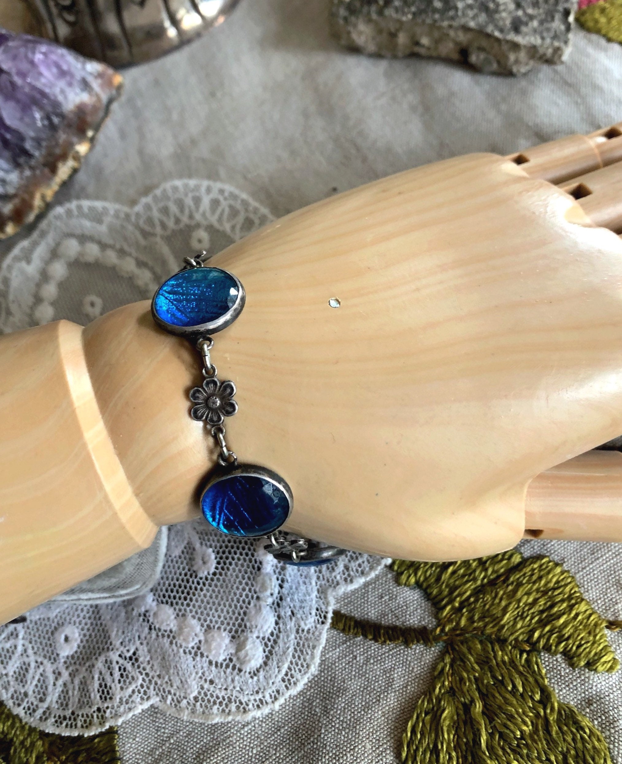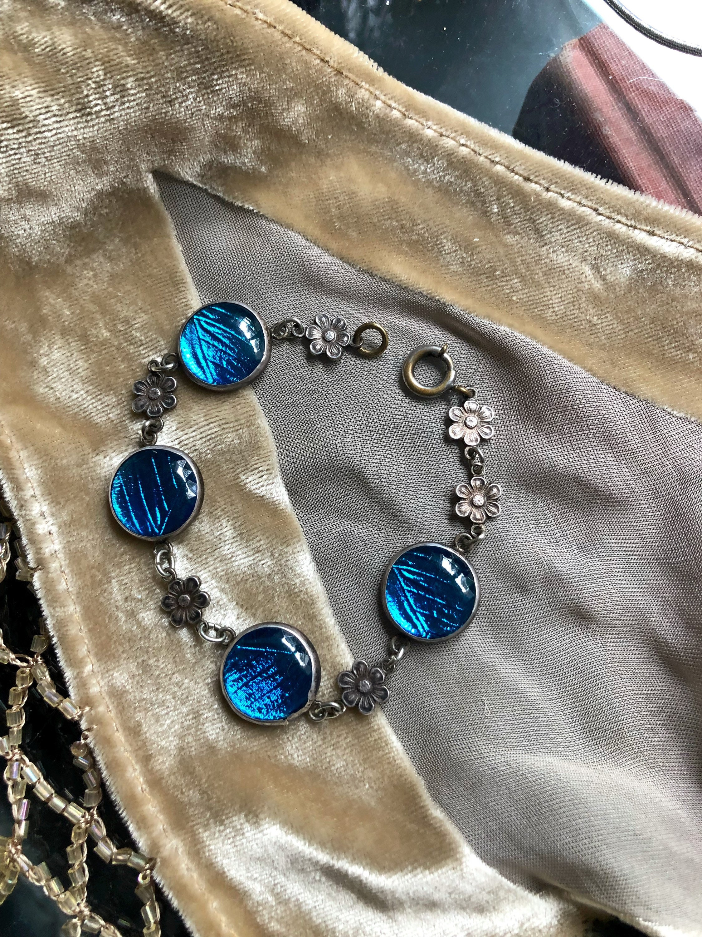 Featuring an ethereal antique Arts and Crafts Art Nouveau Bohemian 1900-1909 signed Sterling Silver link bracelet adorned with beautiful iridescent turquoise blue Morpho Butterfly wing round connectors with dainty sterling flower accents. Bracelet measures approximately 7 inches around at 3.4 grams respectively and is in excellent antique condition with working antique thumbless clasp. Minimal patina with all components intact. Such a unique and beautiful antique bracelet!