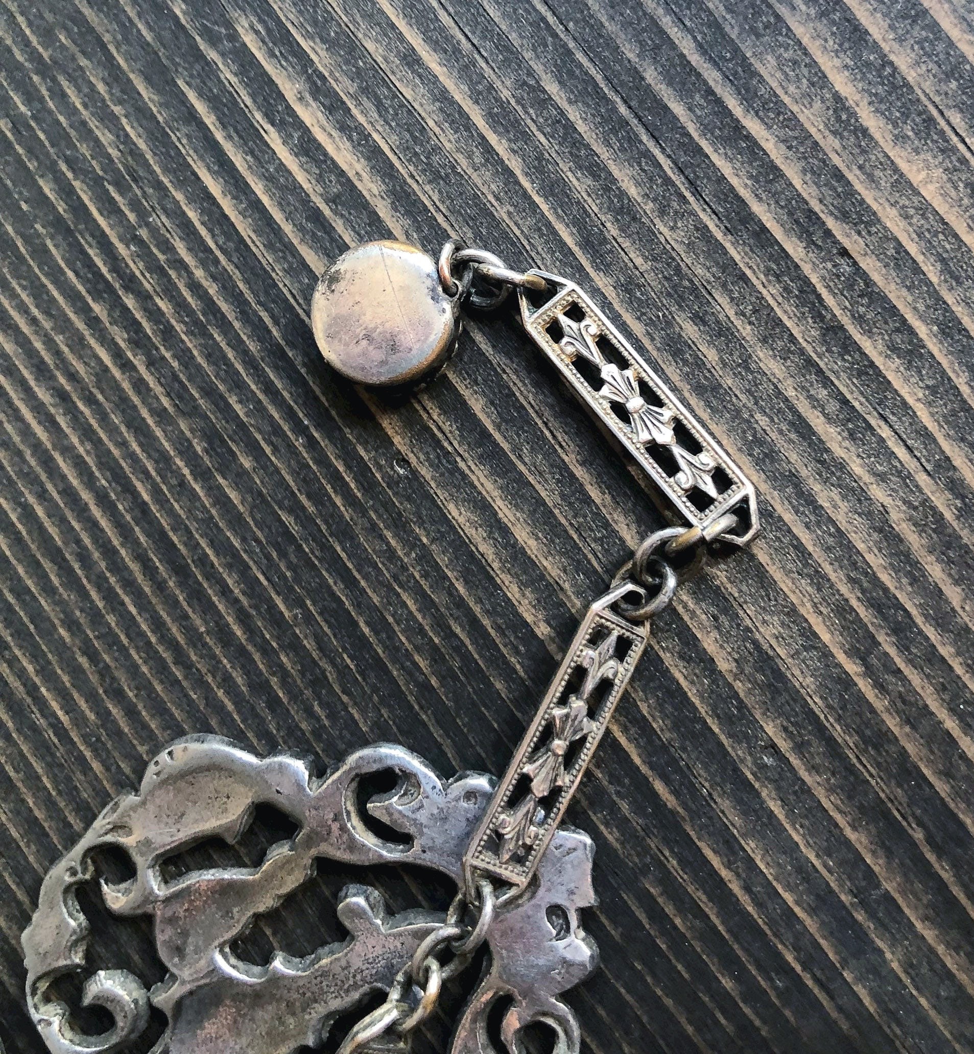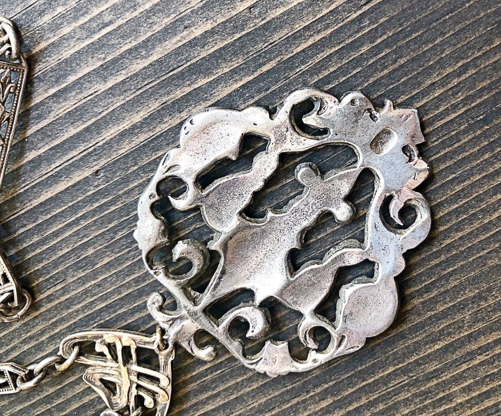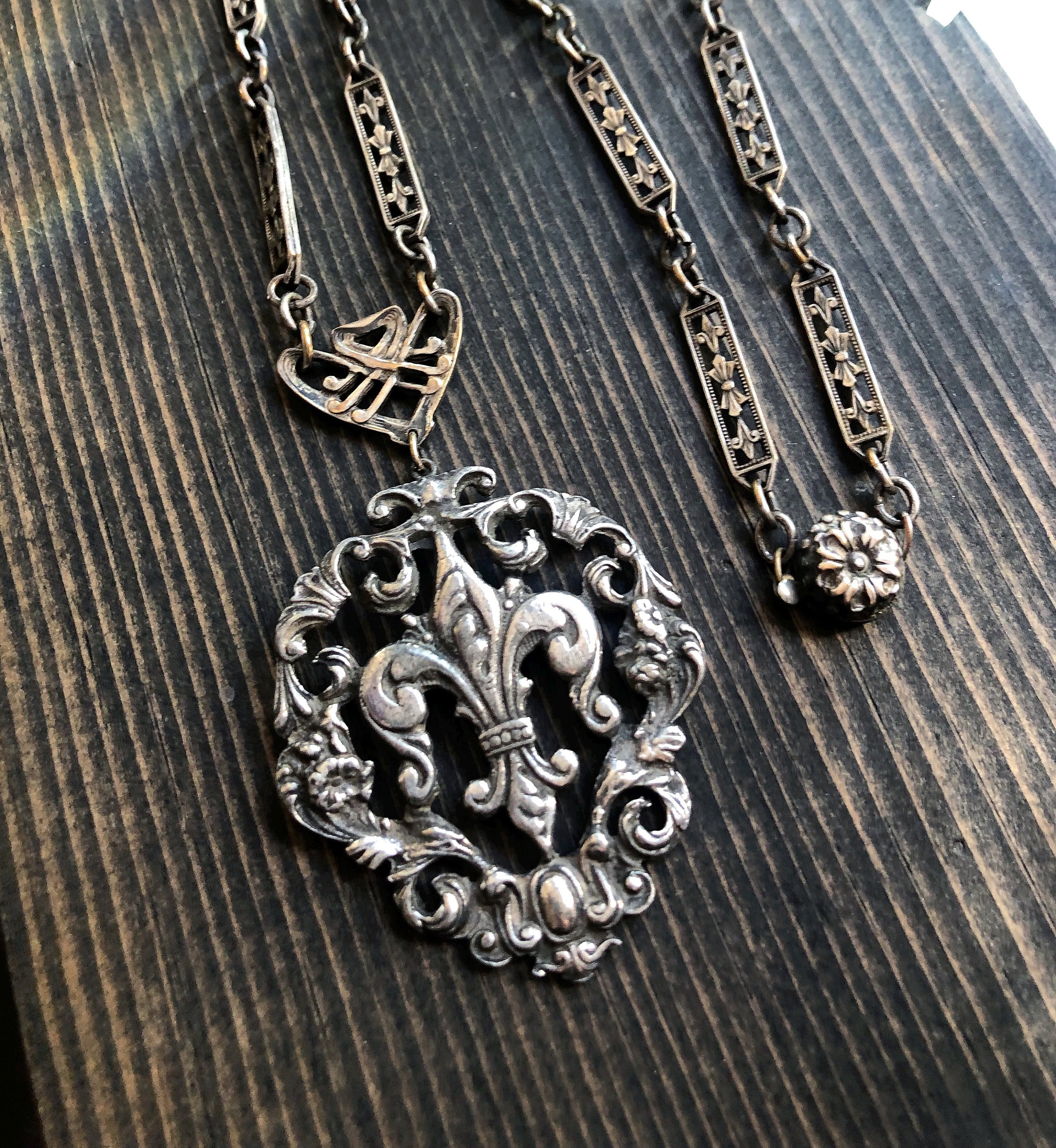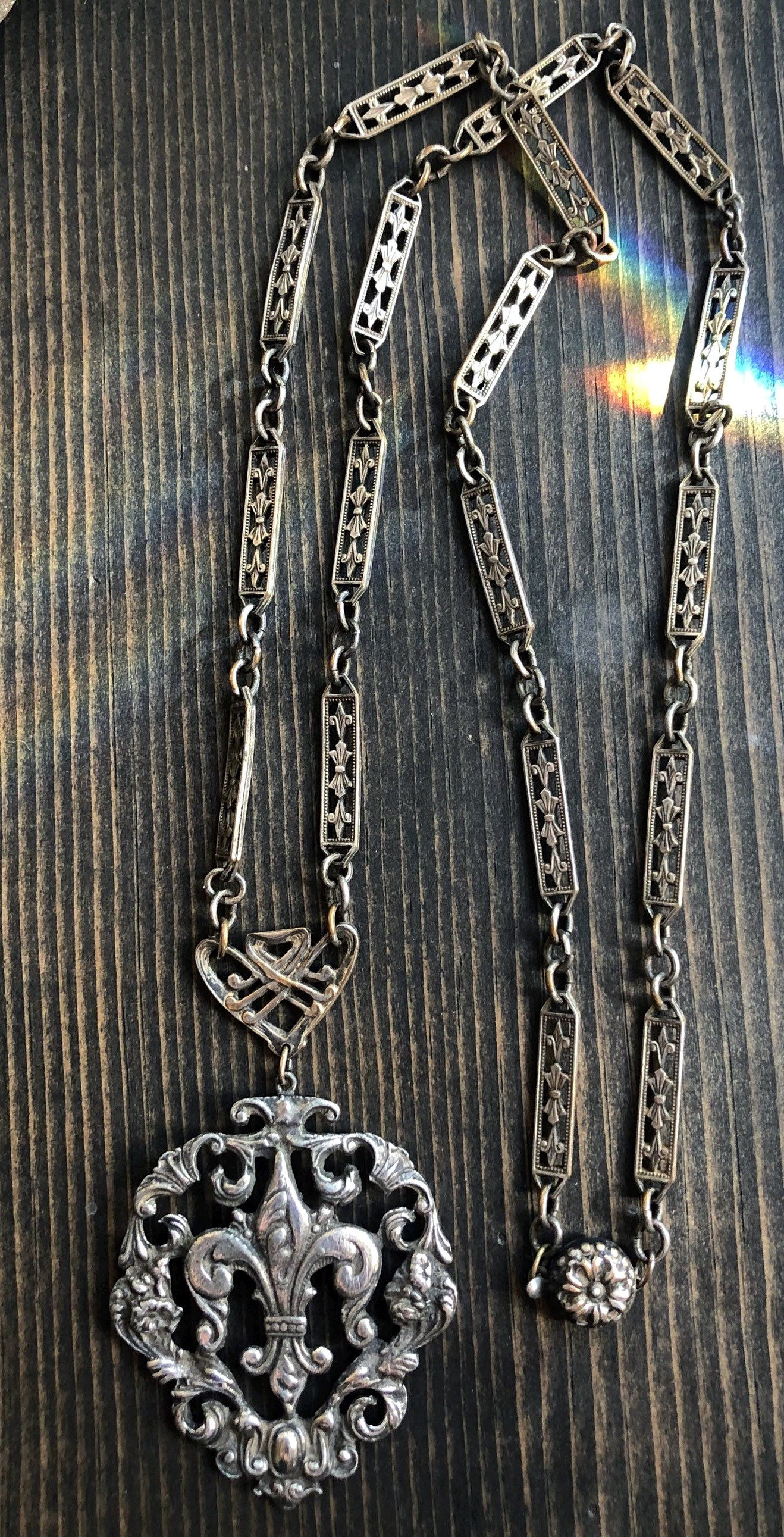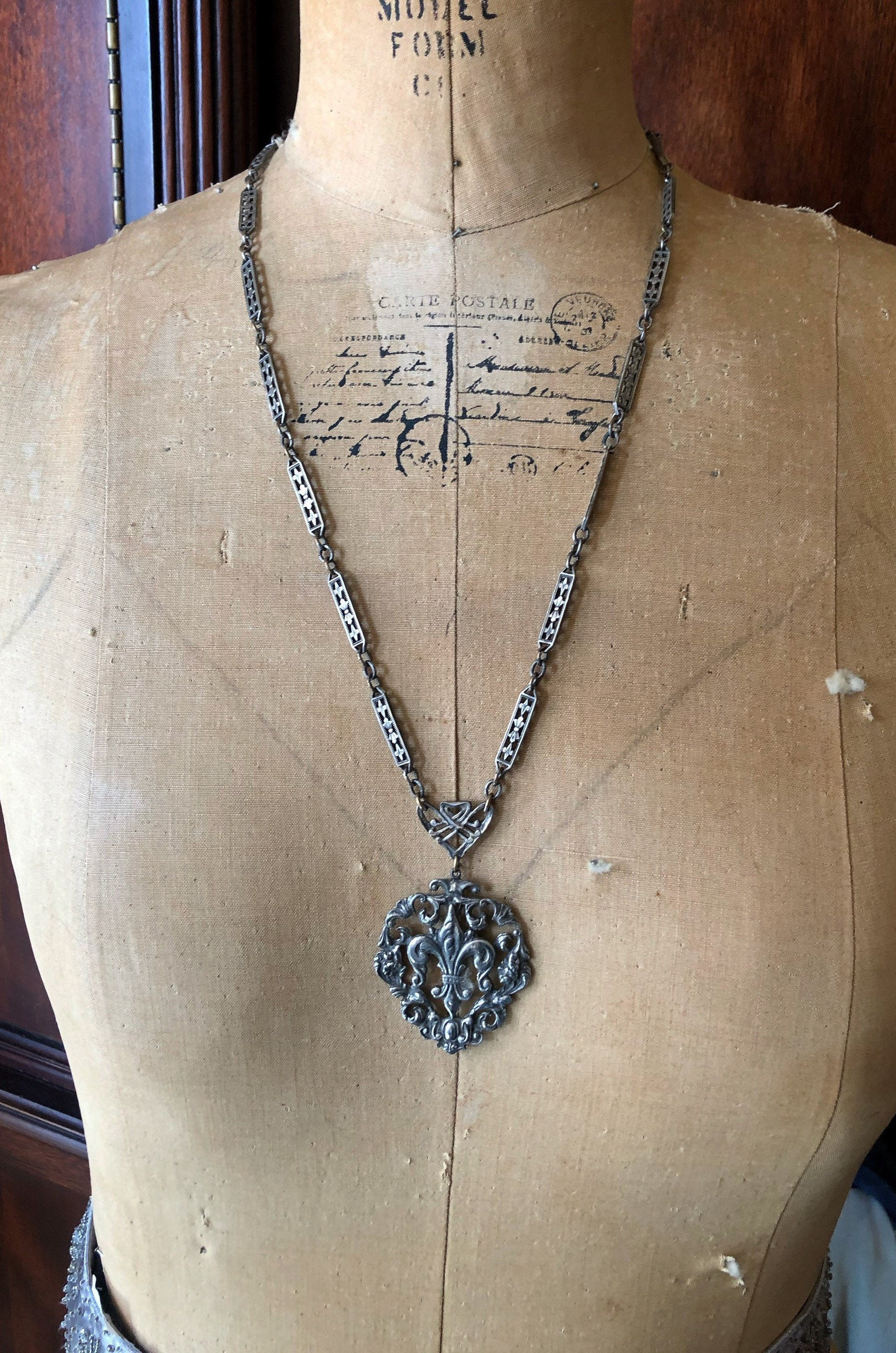Featuring a bold antique Italian Renaissance revival Peruzzi Coppini Style ornate opera length pendant necklace adorned with a gorgeous decorative ornate Fleur De Lis pendant accented with handcrafted floral motifs. Necklace measures approximately 24 inches around with a 3 inch pendant drop at 40.01 grams respectively. In excellent antique condition with a a beautiful flower adorned round slide clasp, a beautiful patina with stampings on the reverse. Such a remarkable Italian antique, beautifully designed and handcrafted over 100 years ago!