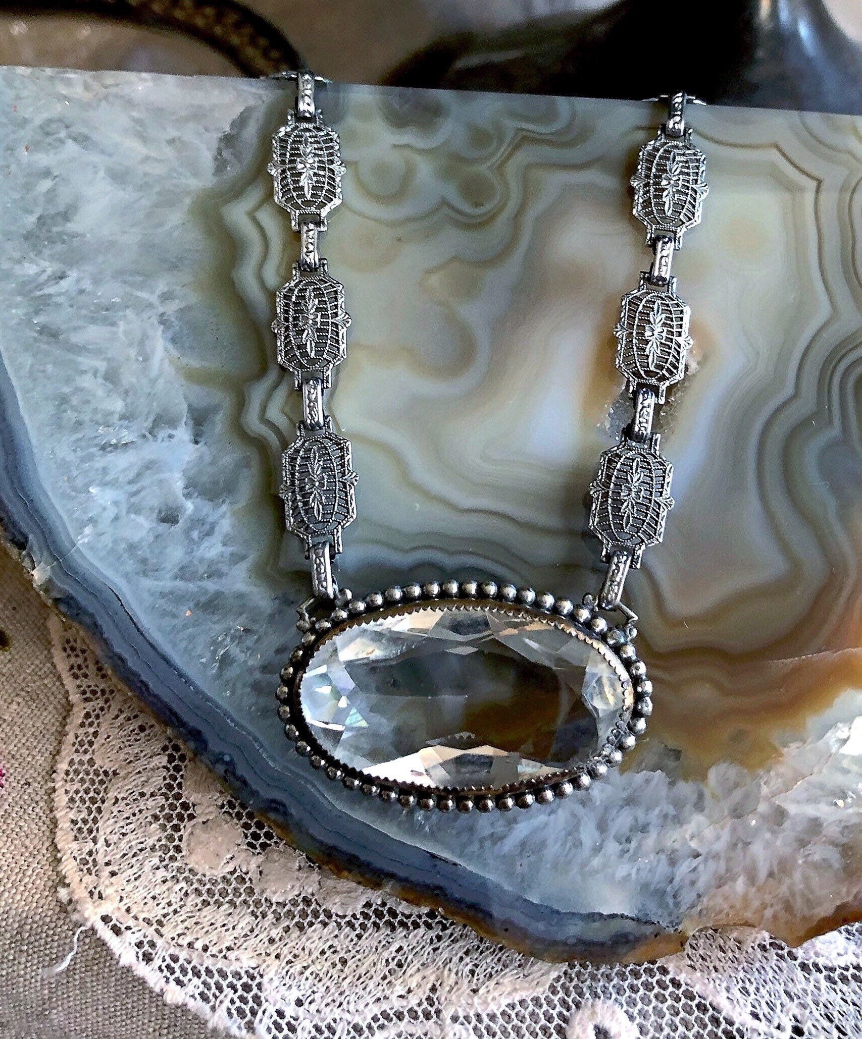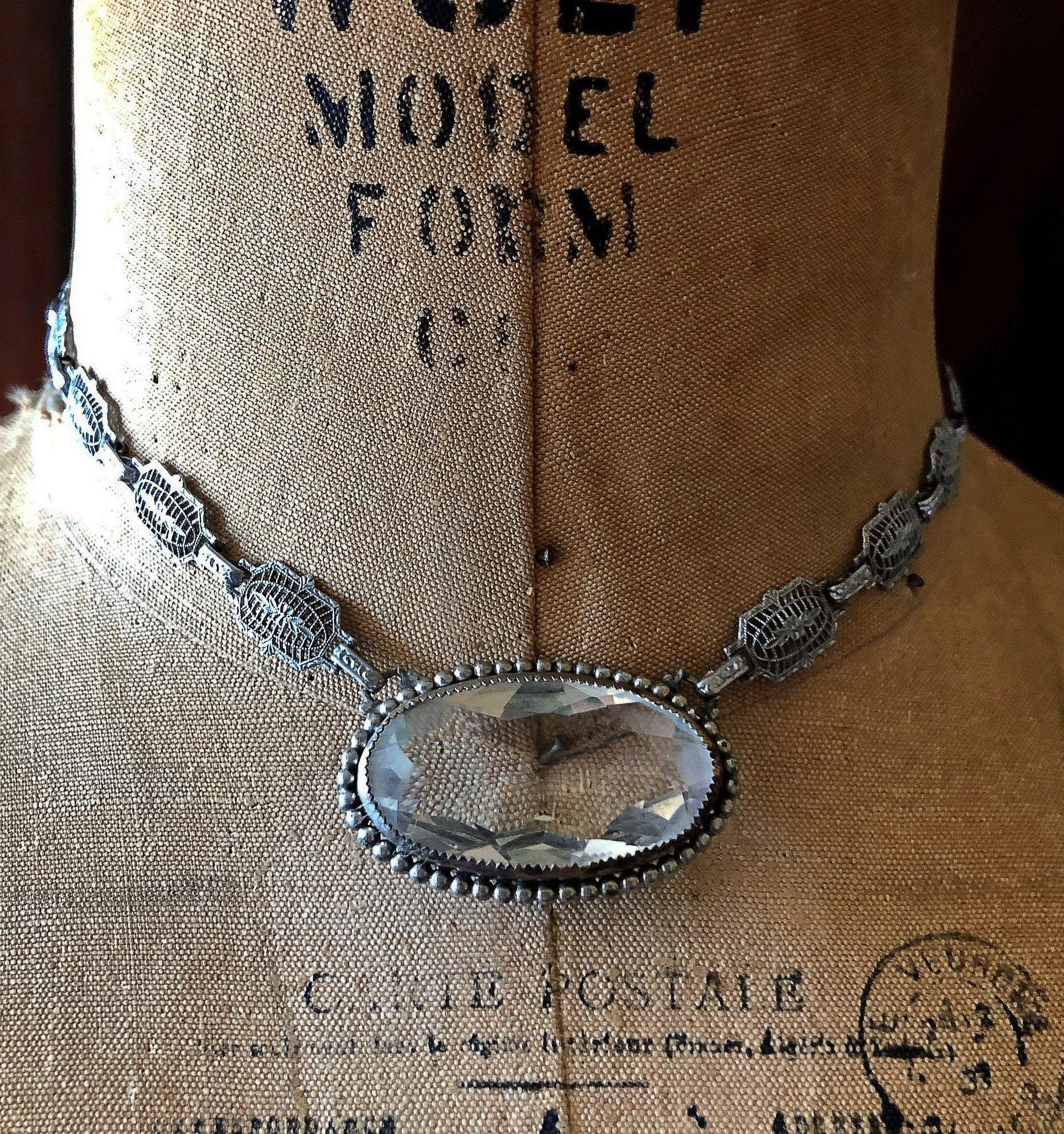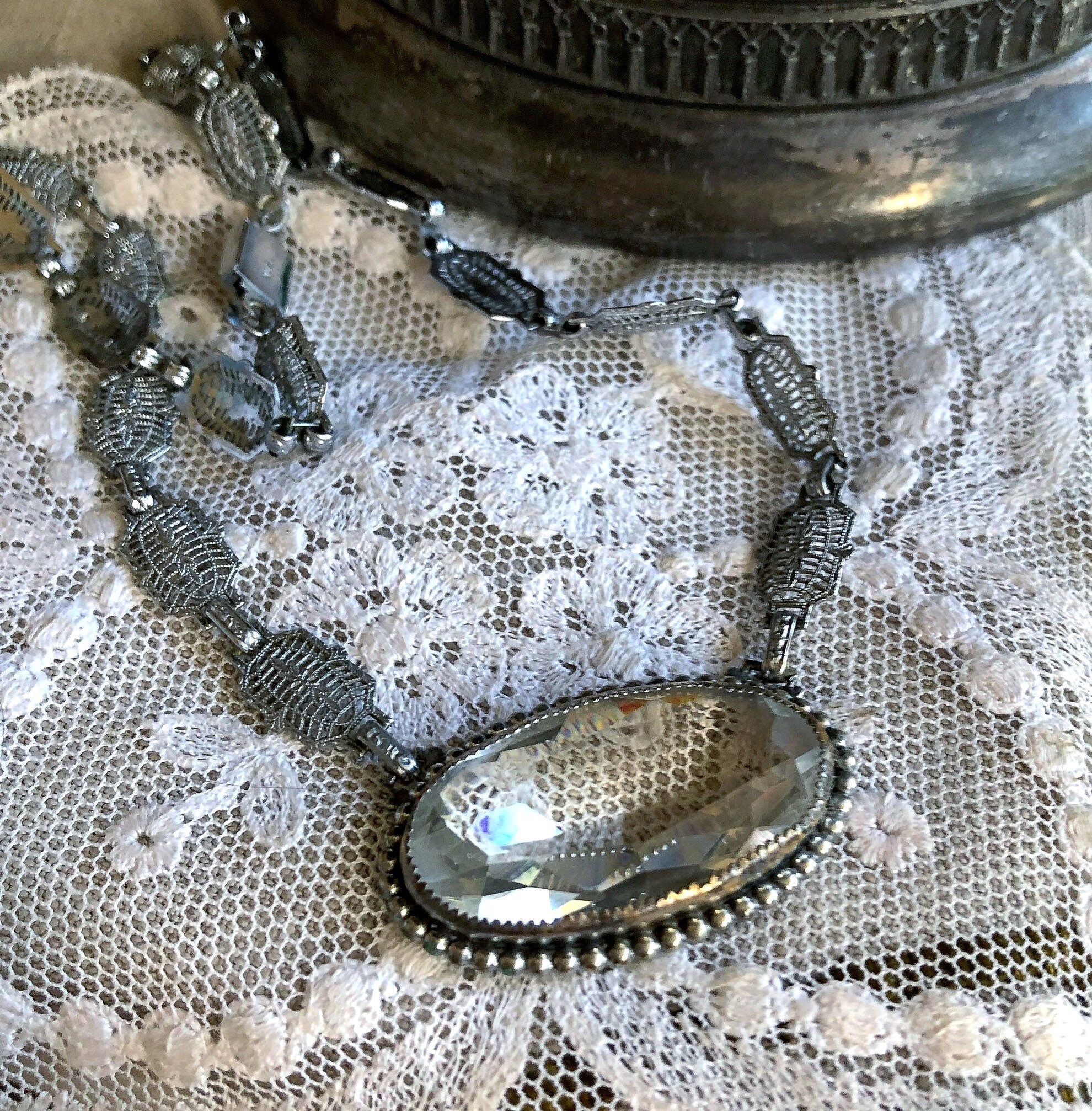 Featuring a gorgeous antique PSCO Plainville Stock Company pristine rhodium plated filigree necklace adorned with a brilliant oval faceted bezel set Paste Stone crystal. Necklace is in pristine antique condition with a stamped functional slide clasp, virtually no wear with all components intact and accounted for. Necklace measures approximately 15 inches around with pendant measuring 1 by .5 inches at 17.7 grams respectively. Stamped PSCO on the reverse of clasp. Just an outstanding antique piece!