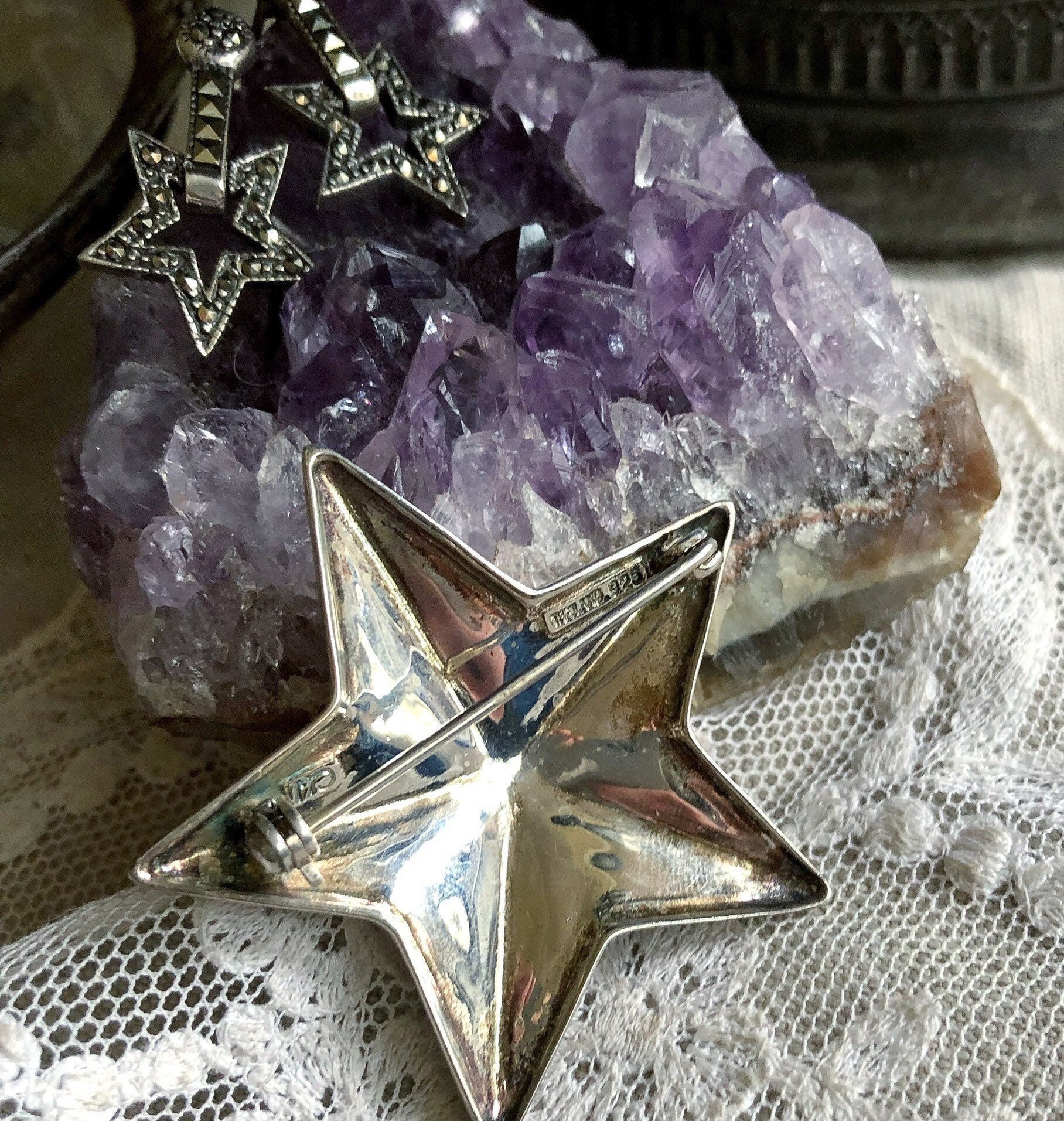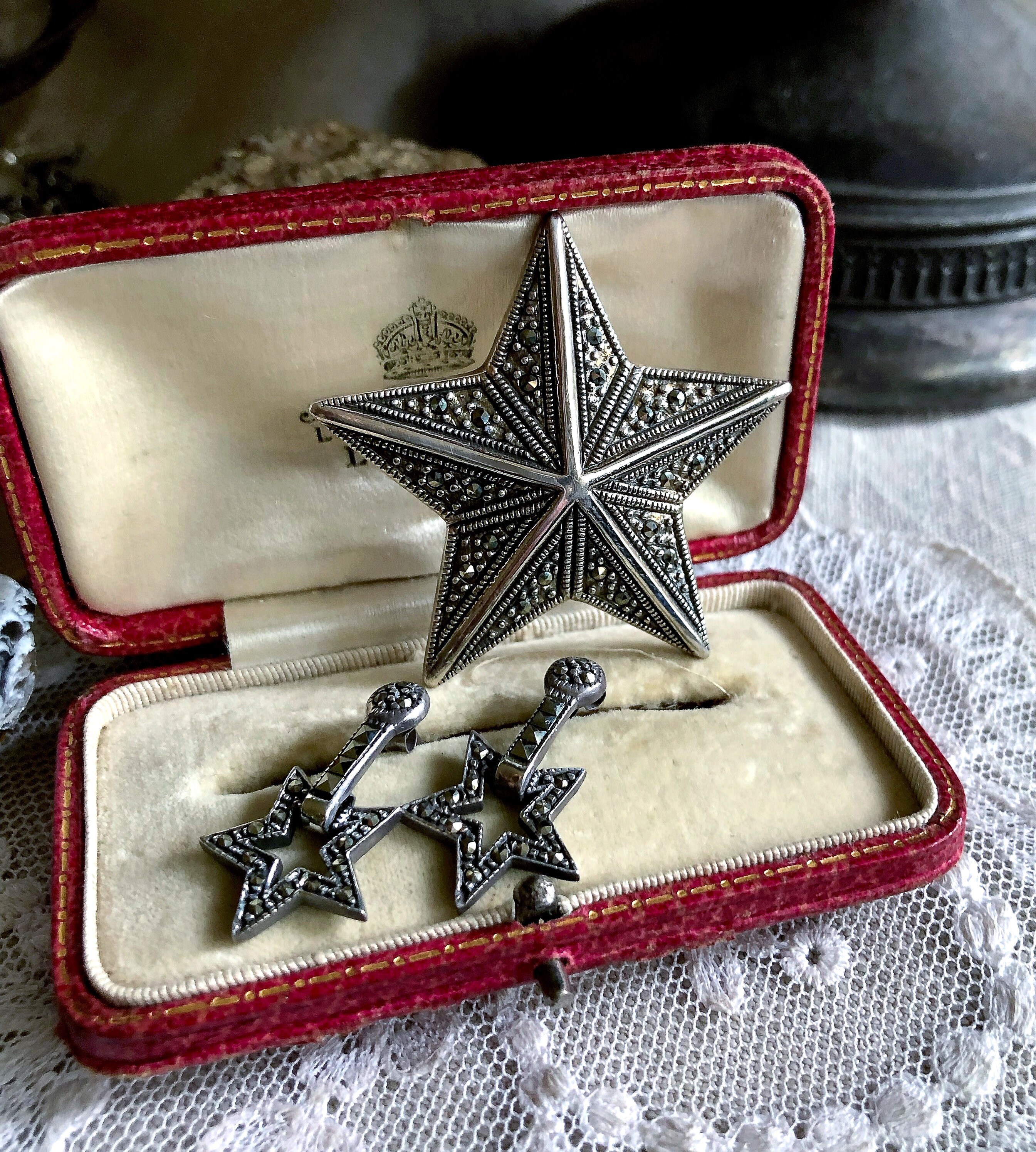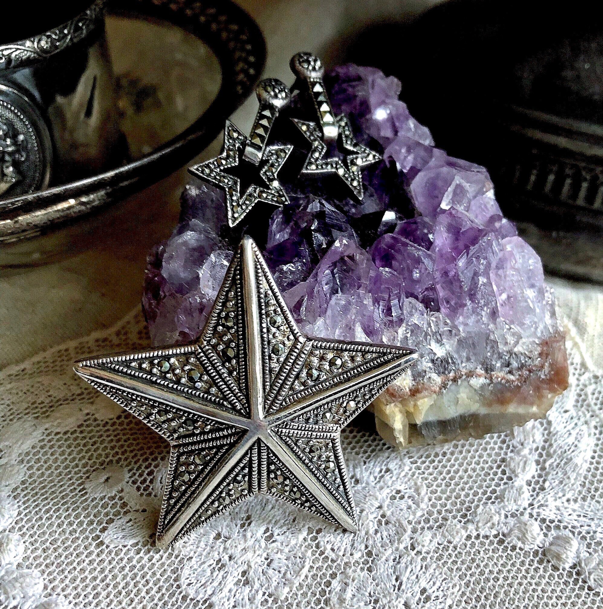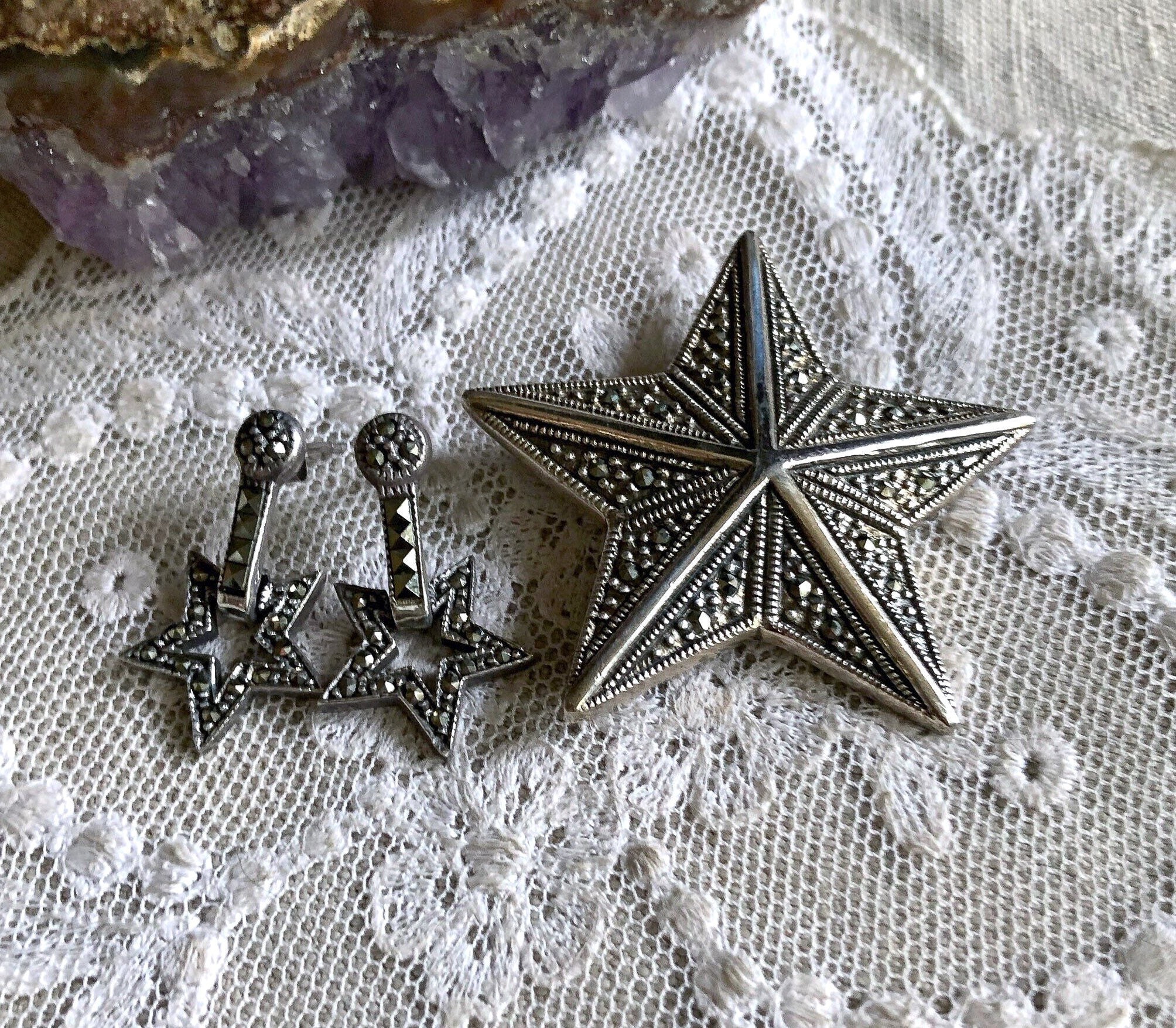 Featuring a unique vintage Art Deco revival sterling silver 925 Star shaped drop earrings and matching statement brooch adorned with brilliant sparkling faceted marcasite crystals set in sterling closed settings. All three pieces are in excellent vintage condition with functional clasp, original backings present, a nice patina with all stones intact and accounted for. Brooch measures approximately 2 inches in diameter at 11.6 grams respectively with earrings measuring 1.2 inches long at 5.1 grams respectively. All three pieces are stamped on the reverse. A unique one of a kind vintage set, ready to wear!