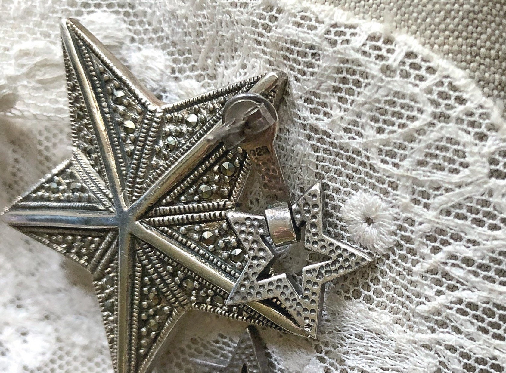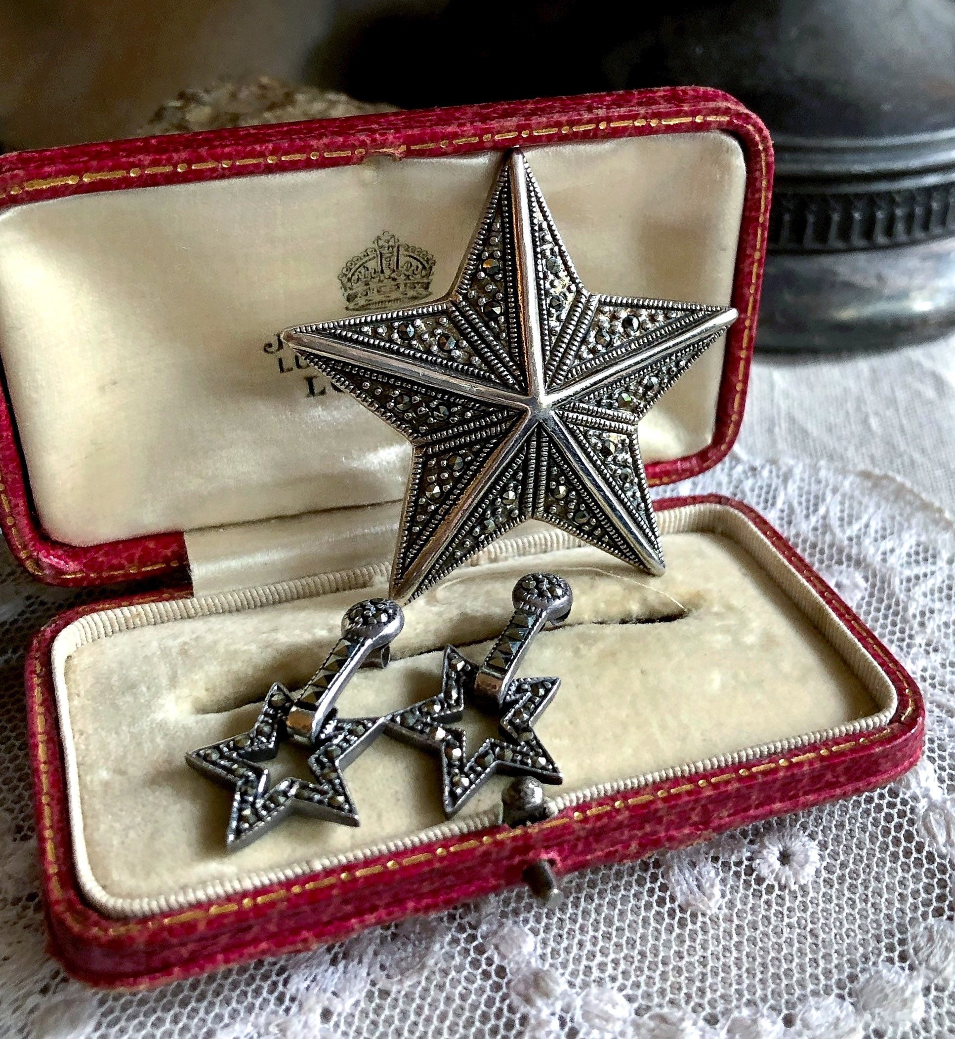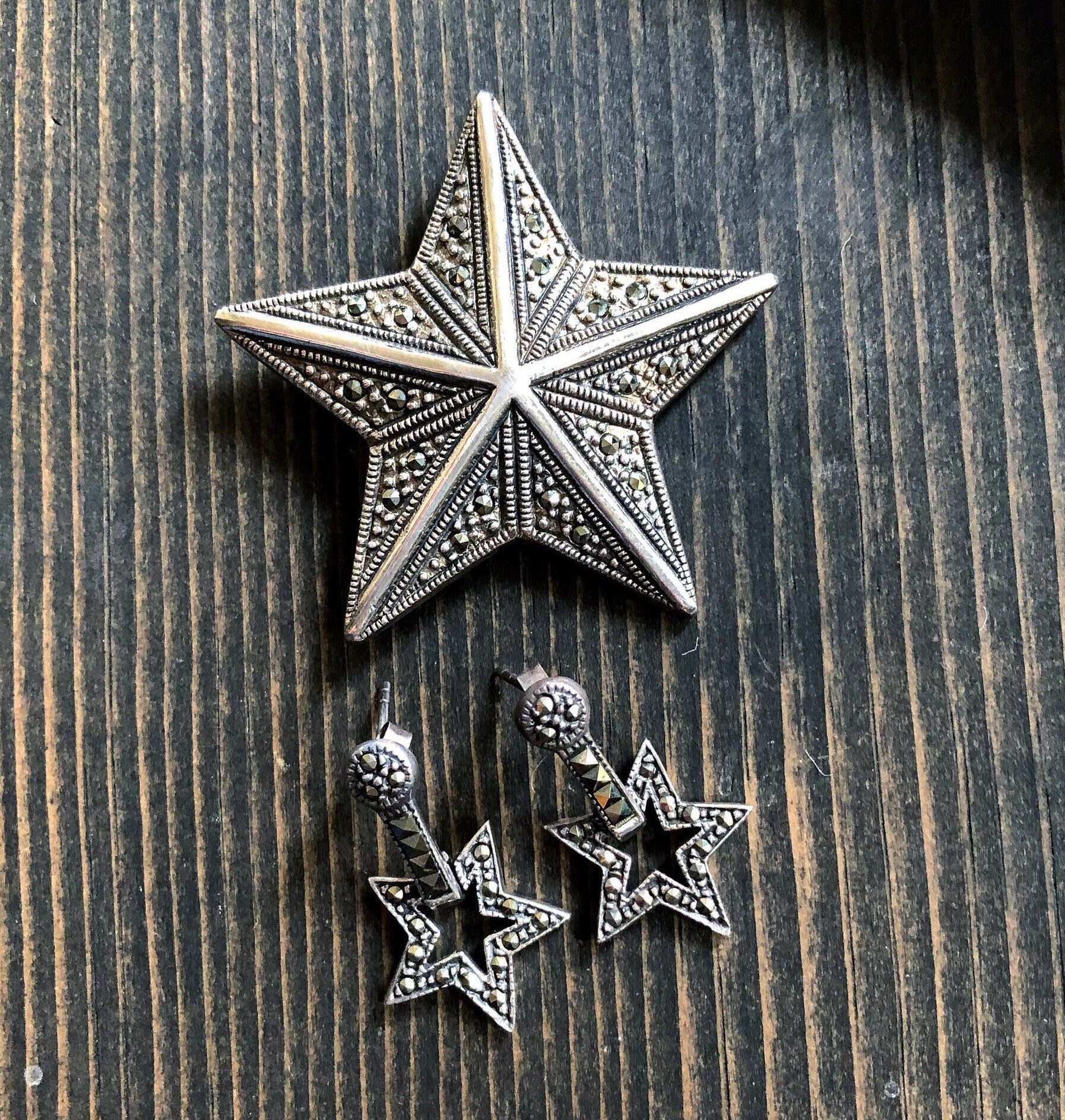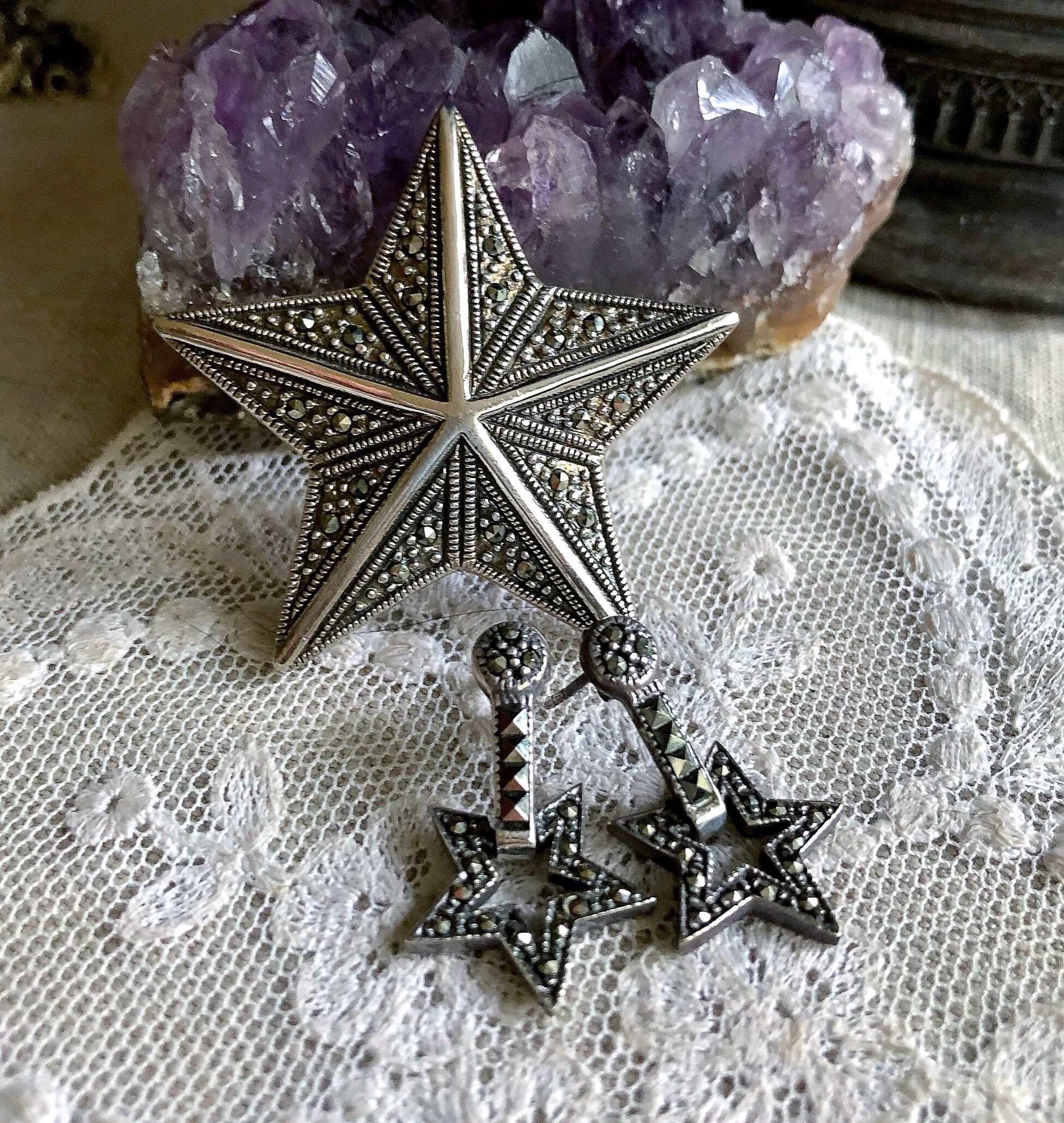Featuring a unique vintage Art Deco revival sterling silver 925 Star shaped drop earrings and matching statement brooch adorned with brilliant sparkling faceted marcasite crystals set in sterling closed settings. All three pieces are in excellent vintage condition with functional clasp, original backings present, a nice patina with all stones intact and accounted for. Brooch measures approximately 2 inches in diameter at 11.6 grams respectively with earrings measuring 1.2 inches long at 5.1 grams respectively. All three pieces are stamped on the reverse. A unique one of a kind vintage set, ready to wear!