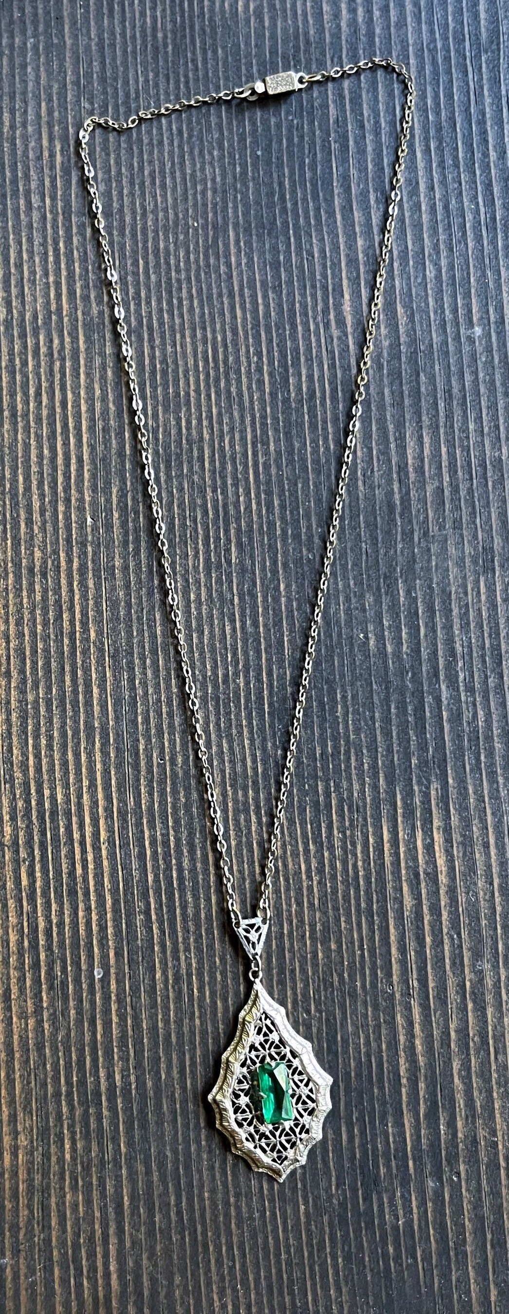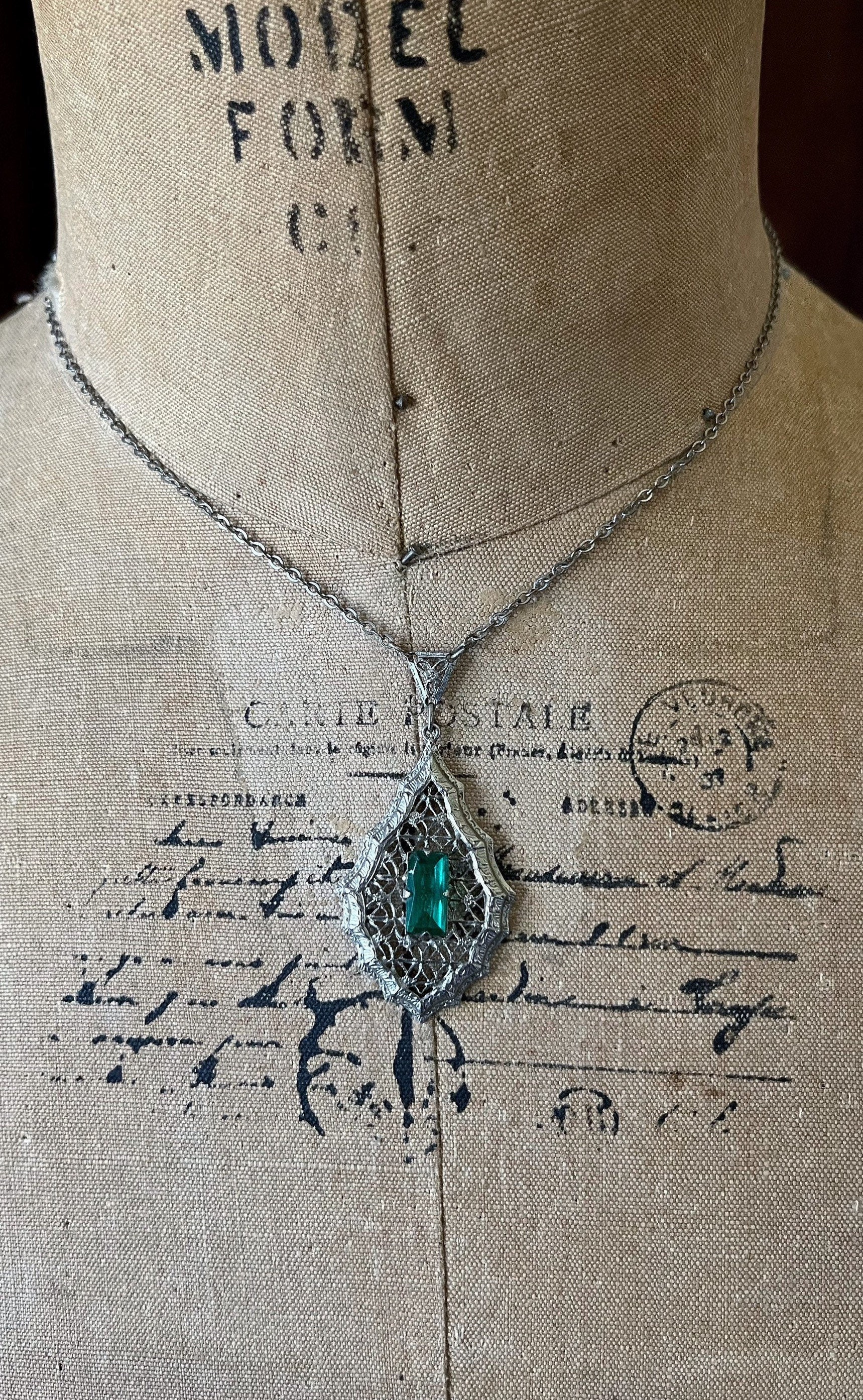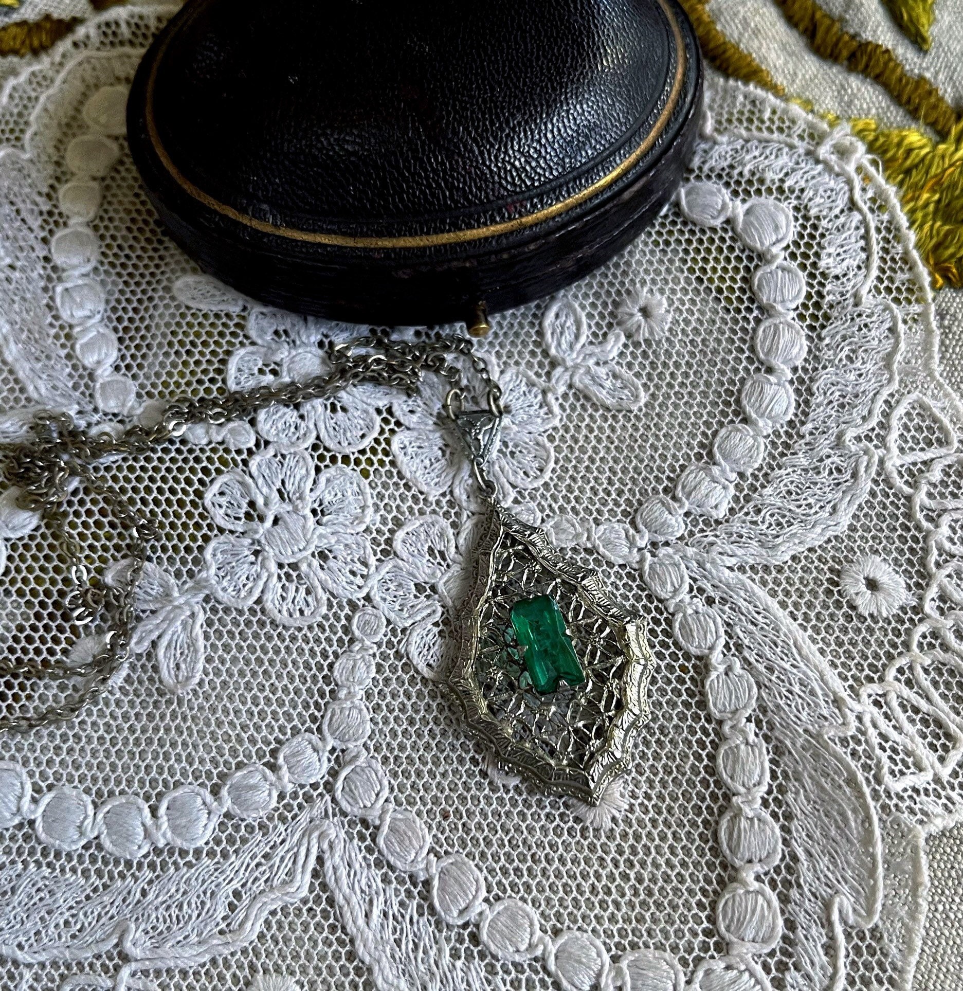 Featuring a lovely dainty antique 1910s Edwardian Era Rhodium plated filigree necklace adorned with a striking emerald green faceted paste stone set in an intricate open back setting. Necklace measures approximately 15.5 inches around with pendant drop measuring around 1.7 inches respectively. Necklace is in excellent antique condition with a functional slide clasp, minimal wear with stone shiny and intact. A wonderful feminine piece, delicate and ready to wear!