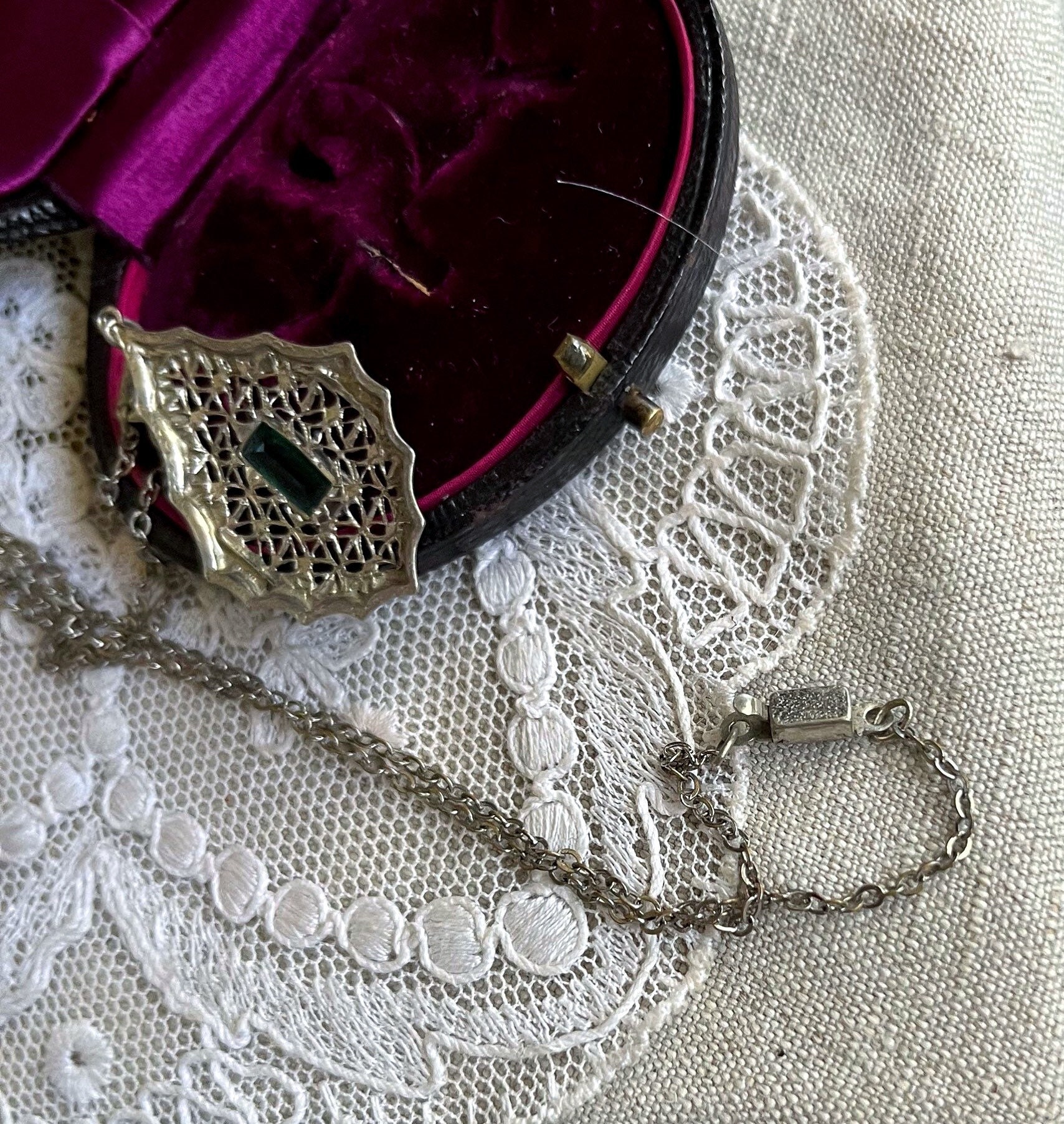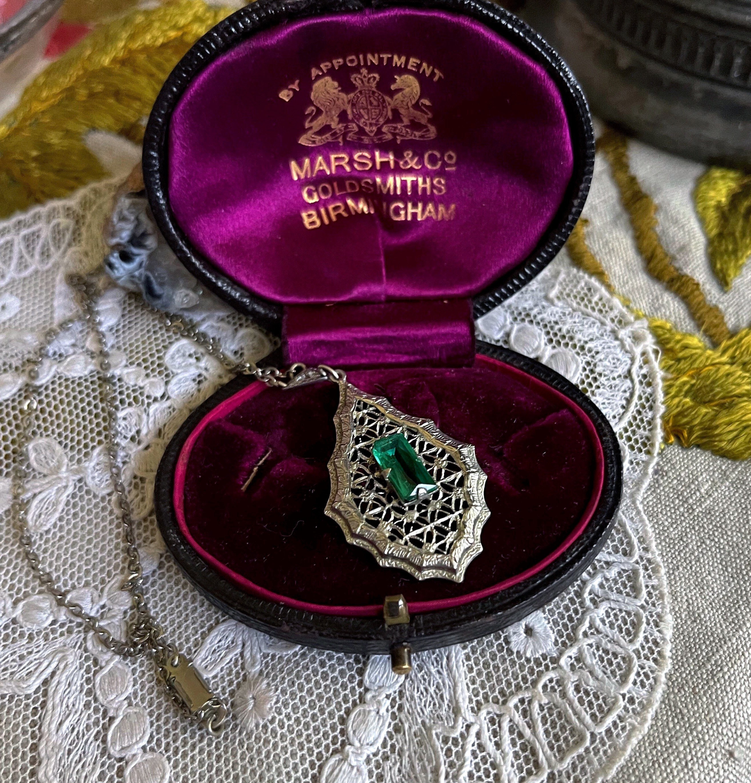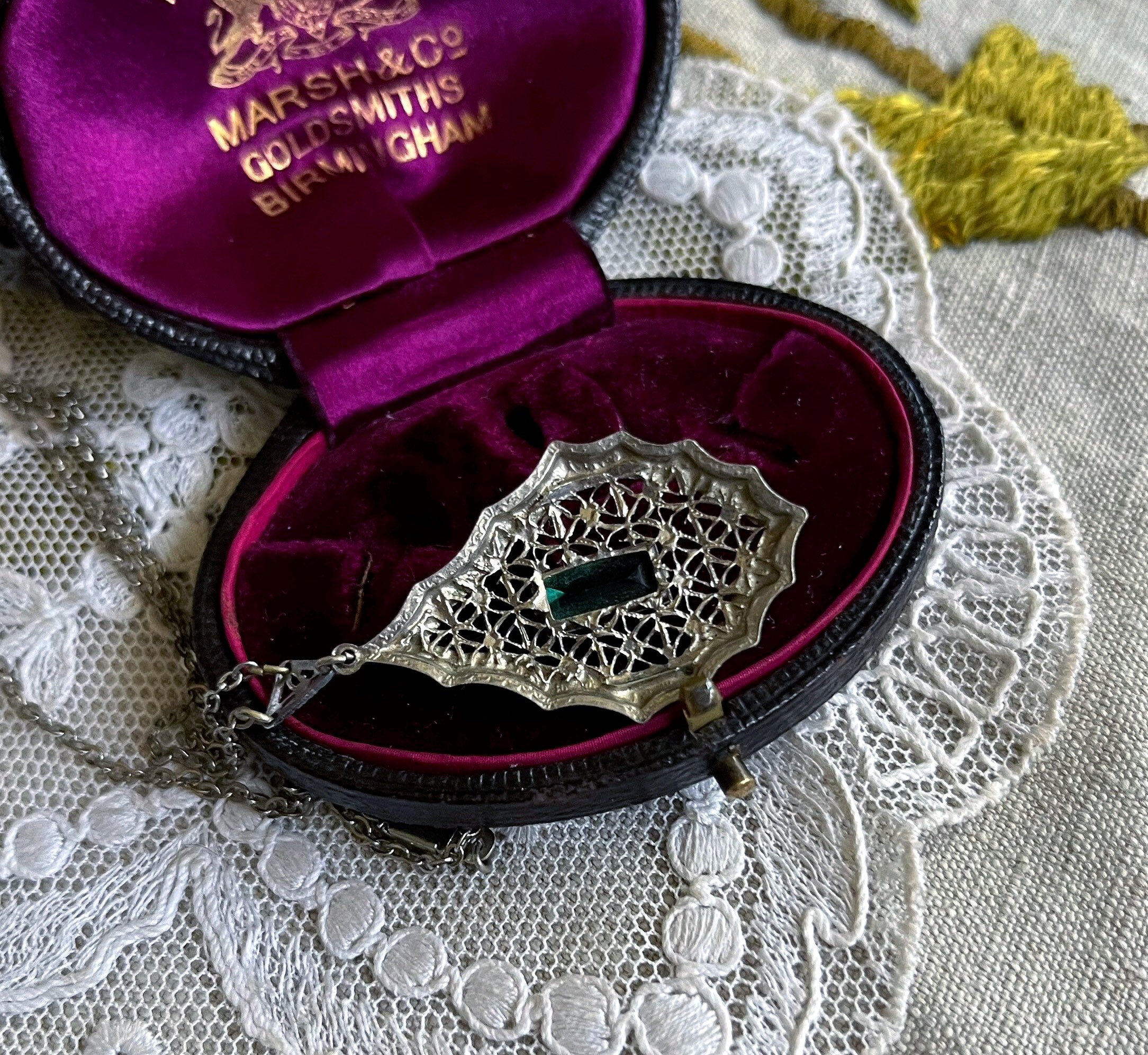 Featuring a lovely dainty antique 1910s Edwardian Era Rhodium plated filigree necklace adorned with a striking emerald green faceted paste stone set in an intricate open back setting. Necklace measures approximately 15.5 inches around with pendant drop measuring around 1.7 inches respectively. Necklace is in excellent antique condition with a functional slide clasp, minimal wear with stone shiny and intact. A wonderful feminine piece, delicate and ready to wear!
