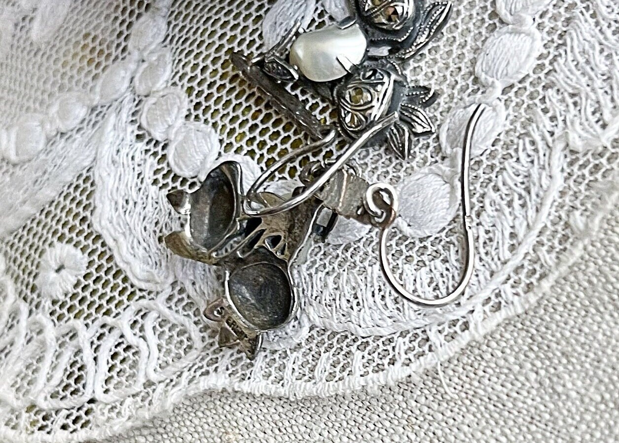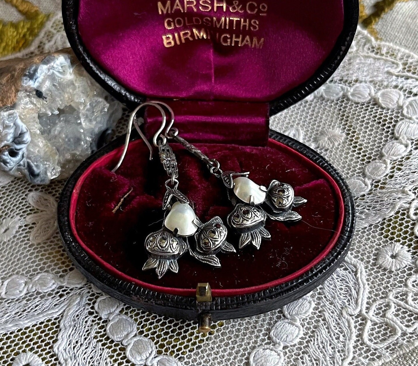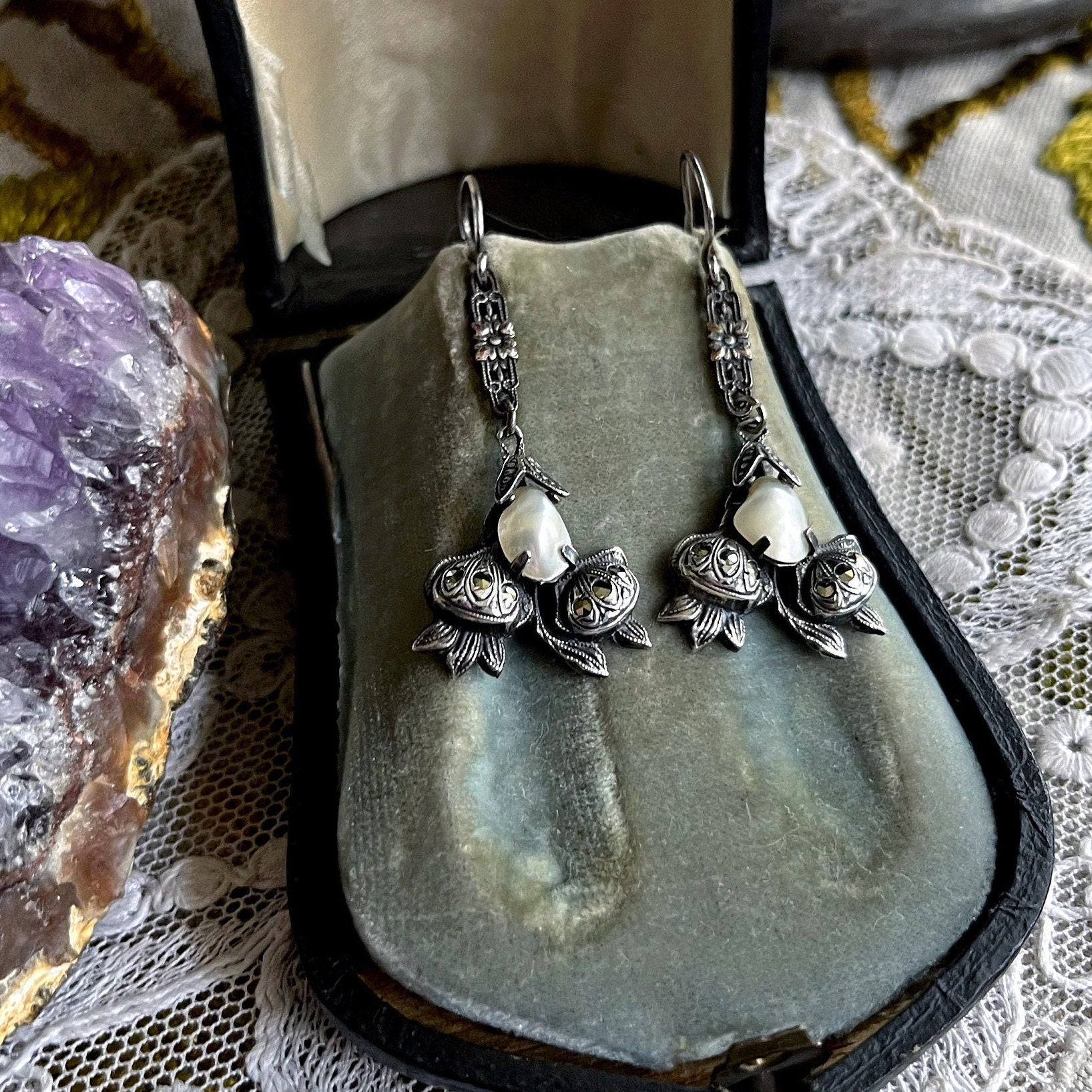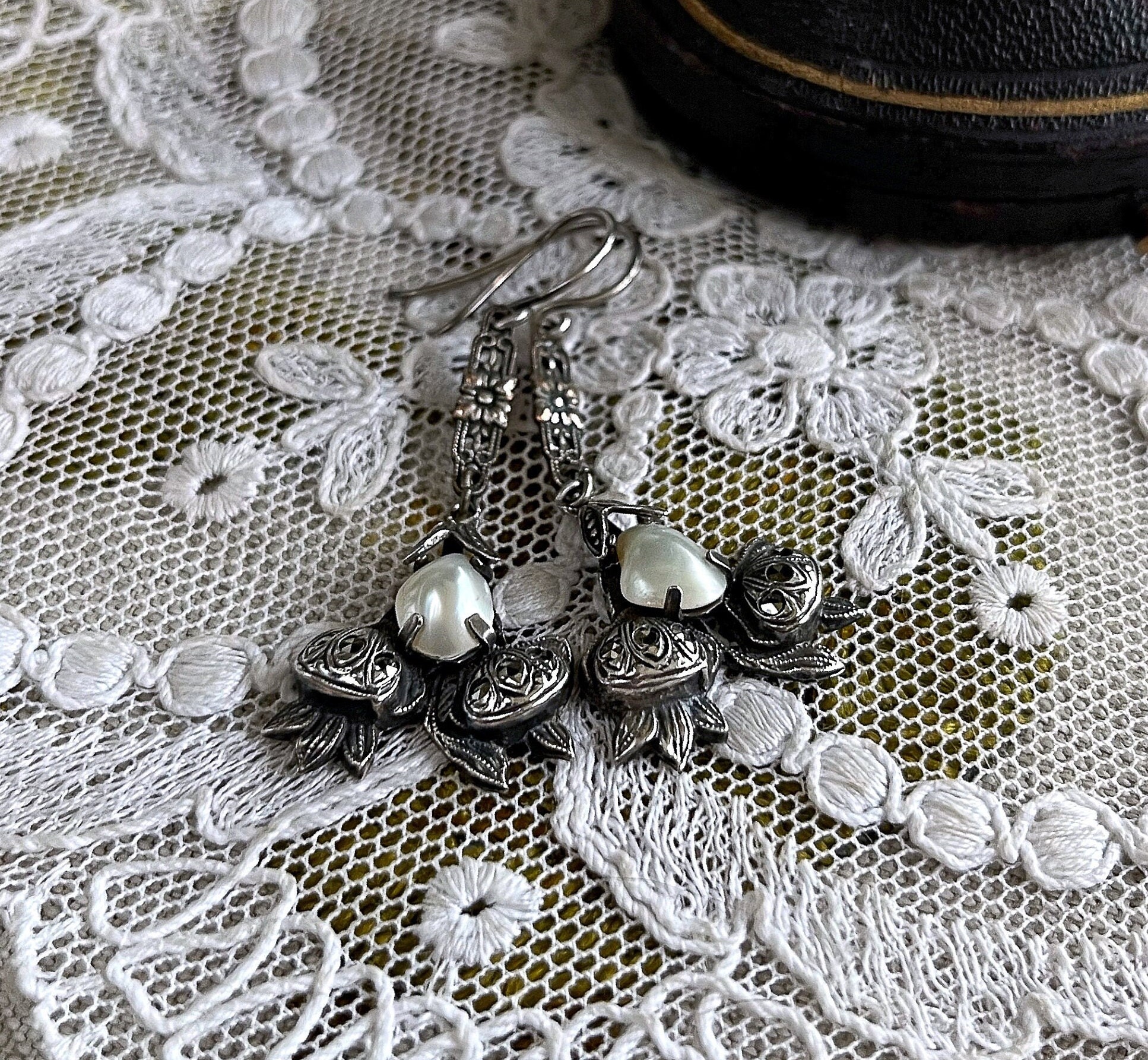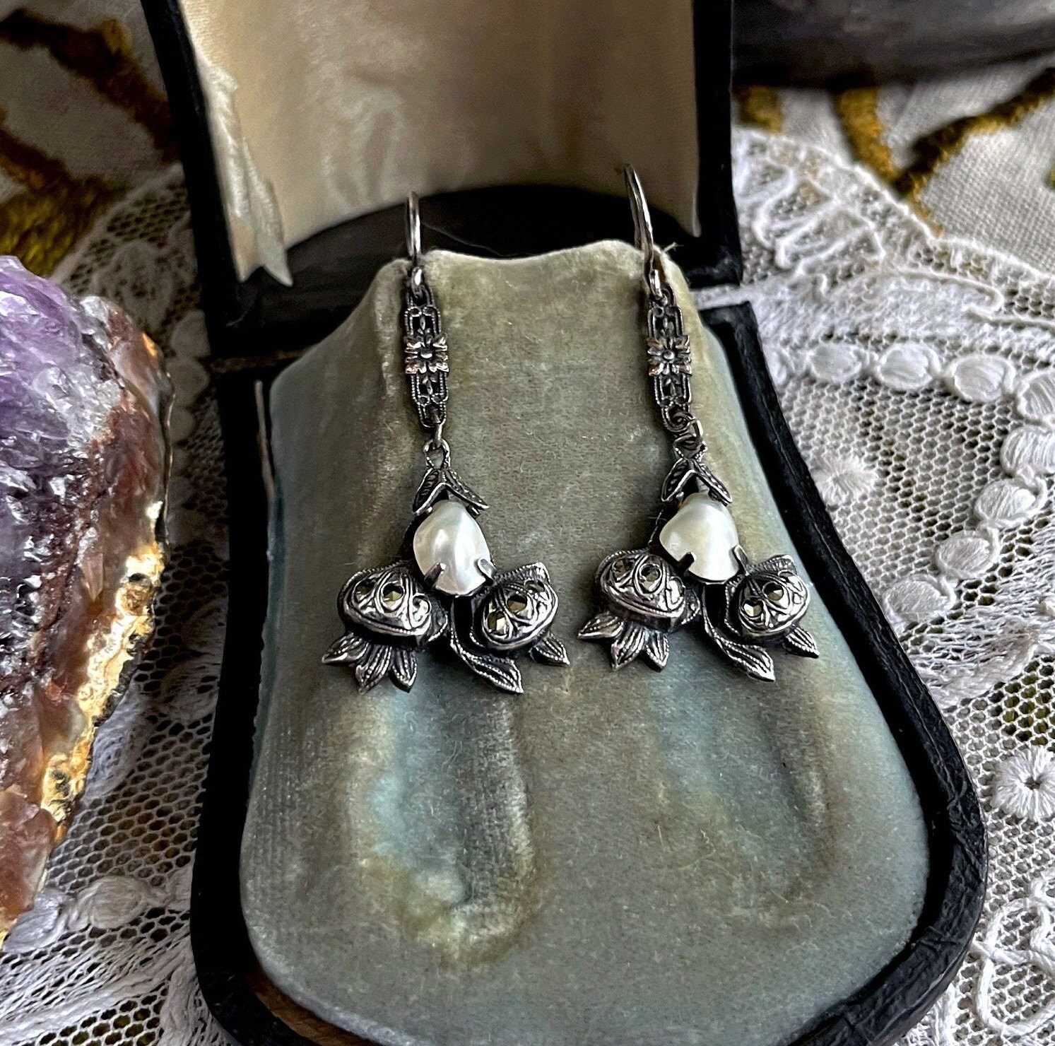 Featuring a fabulous pair of antique sterling silver pierced drop earrings adorned with genuine luminous baroque pearls accented with brilliant faceted marcasite crystals. Earrings measure approximately 2 inches long at 4.6 grams respectively, both pieces hallmarked STERLING on the reverse. These beauties are in excellent antique condition with normal wear, a beautiful patina with all stones intact and accounted for. Beautifully designed and handcrafted and ready to wear!