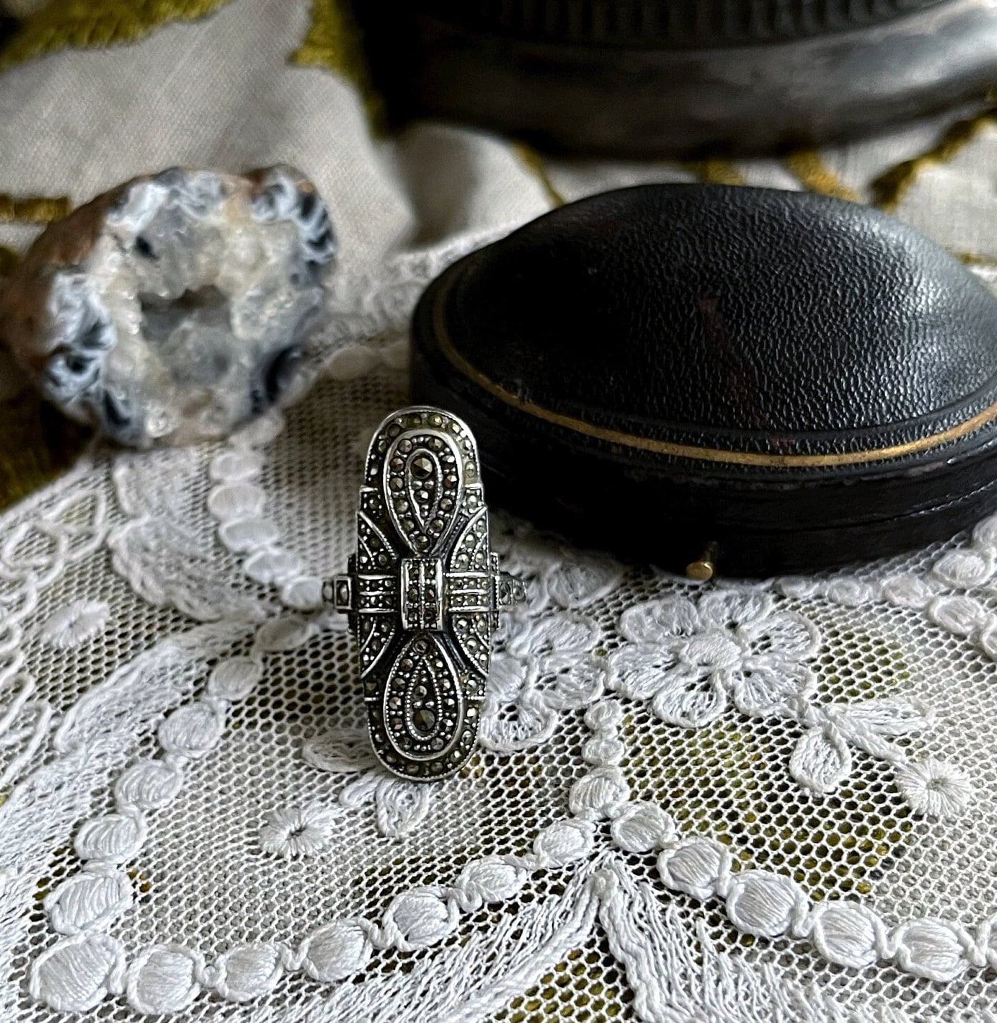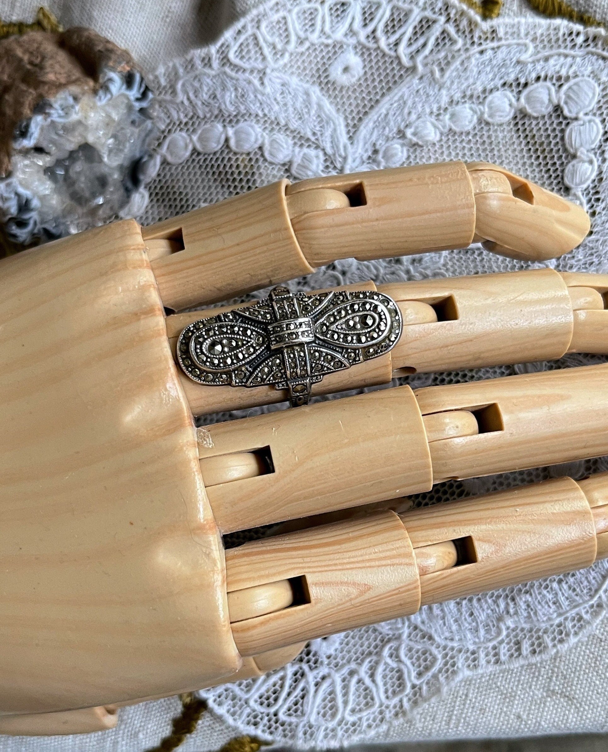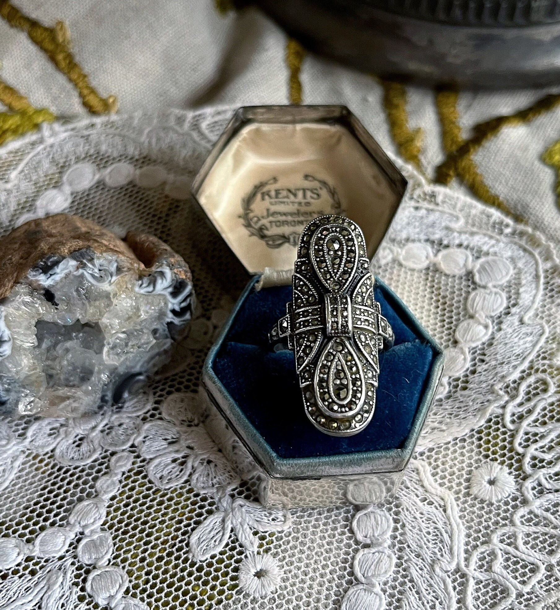 Featuring a dazzling antique 1920s Art Deco Era solid sterling silver decorative statement ring accented with brilliant faceted marcasite crystals. Ring is in excellent antique condition with a beautiful patina with all stones intact and accounted for. At approximately size 7 at 5.8 grams respectively a rare size for the times is hallmarked STERL on the inside of band. Beautifully designed and handcrafted over 100 years ago, a gorgeous wearable Heirloom investment piece!