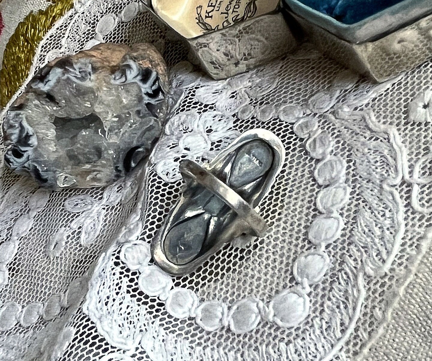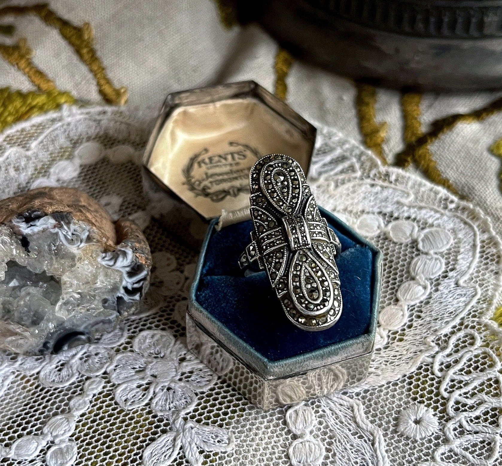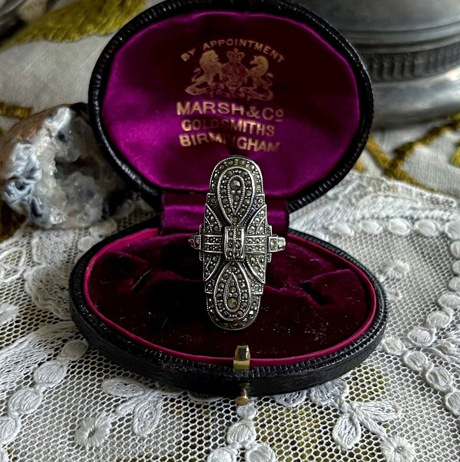 Featuring a dazzling antique 1920s Art Deco Era solid sterling silver decorative statement ring accented with brilliant faceted marcasite crystals. Ring is in excellent antique condition with a beautiful patina with all stones intact and accounted for. At approximately size 7 at 5.8 grams respectively a rare size for the times is hallmarked STERL on the inside of band. Beautifully designed and handcrafted over 100 years ago, a gorgeous wearable Heirloom investment piece!