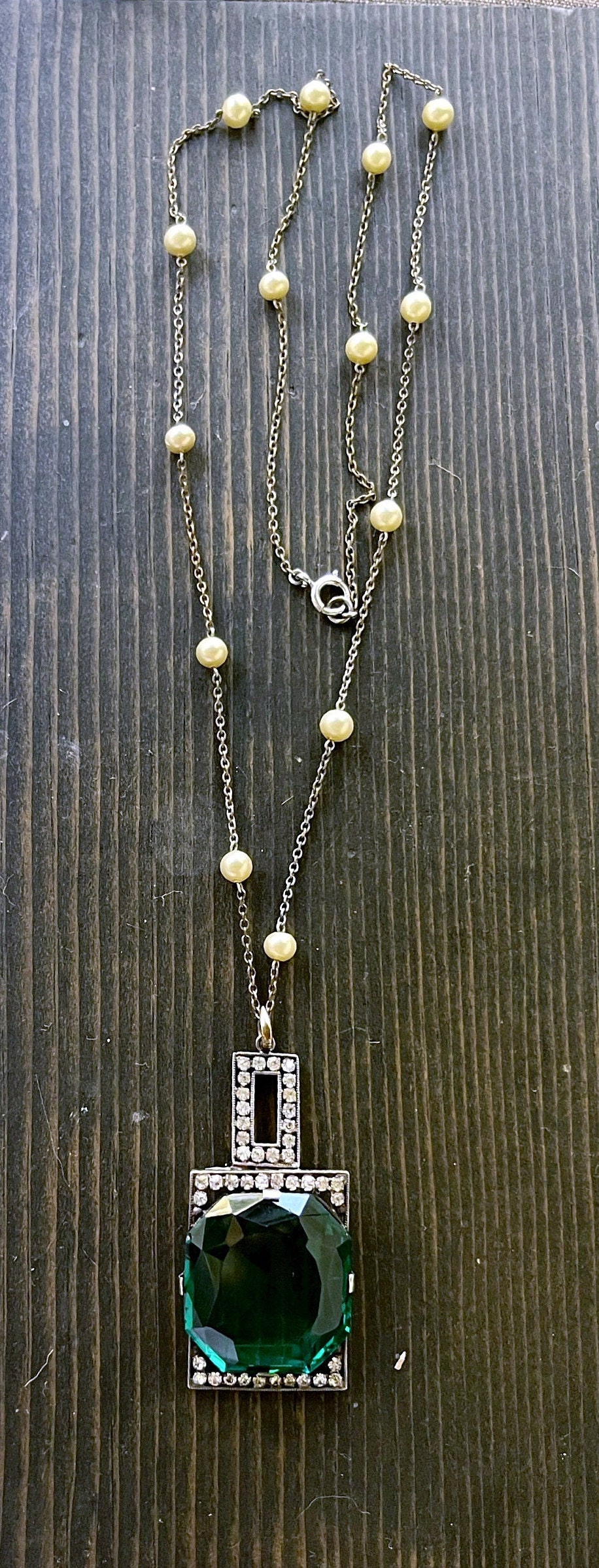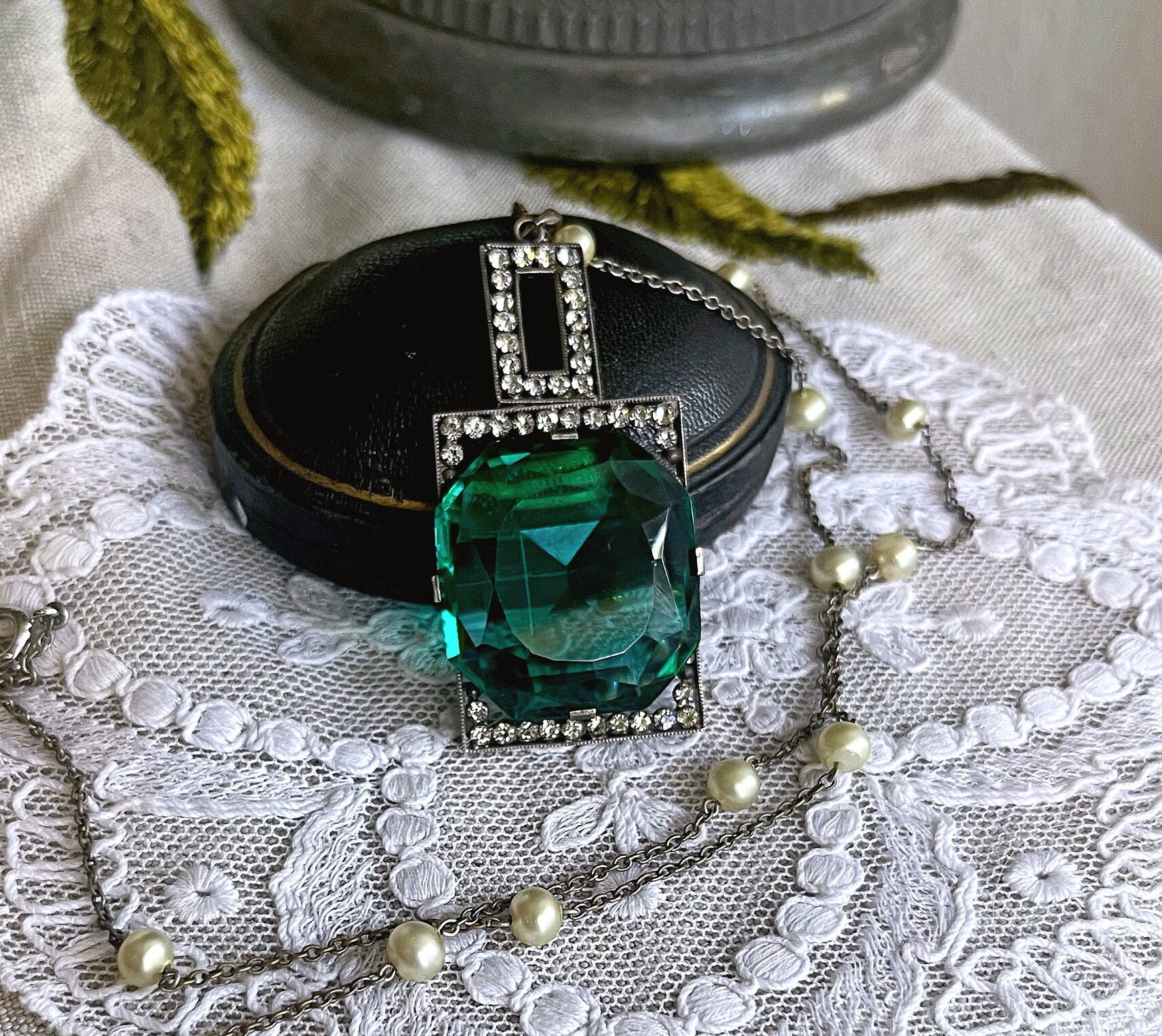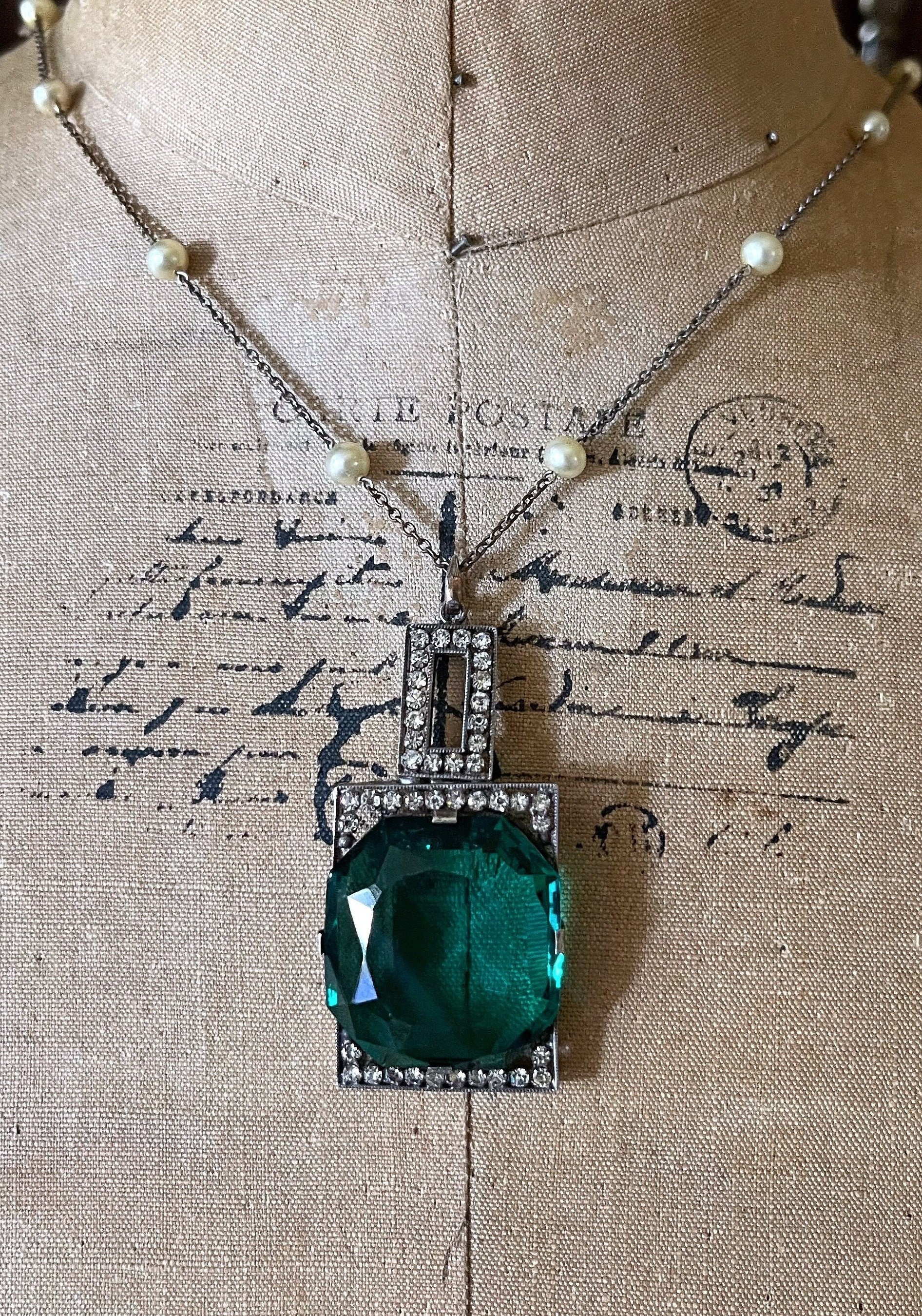 Featuring a fabulous vintage Art Deco glamorous matinee length pendant necklace adorned with a large luminous emerald green open back bezel set paste stone accented with faceted round white paste with beautiful faux pearls. Necklace measures approximately 22 inches long with a pendant drop of 2 inches respectively. In excellent vintage condition with a functional C spring clasp, normal wear with all stones intact and accounted for. A classic Art Deco piece, beautifully designed and ready to wear!