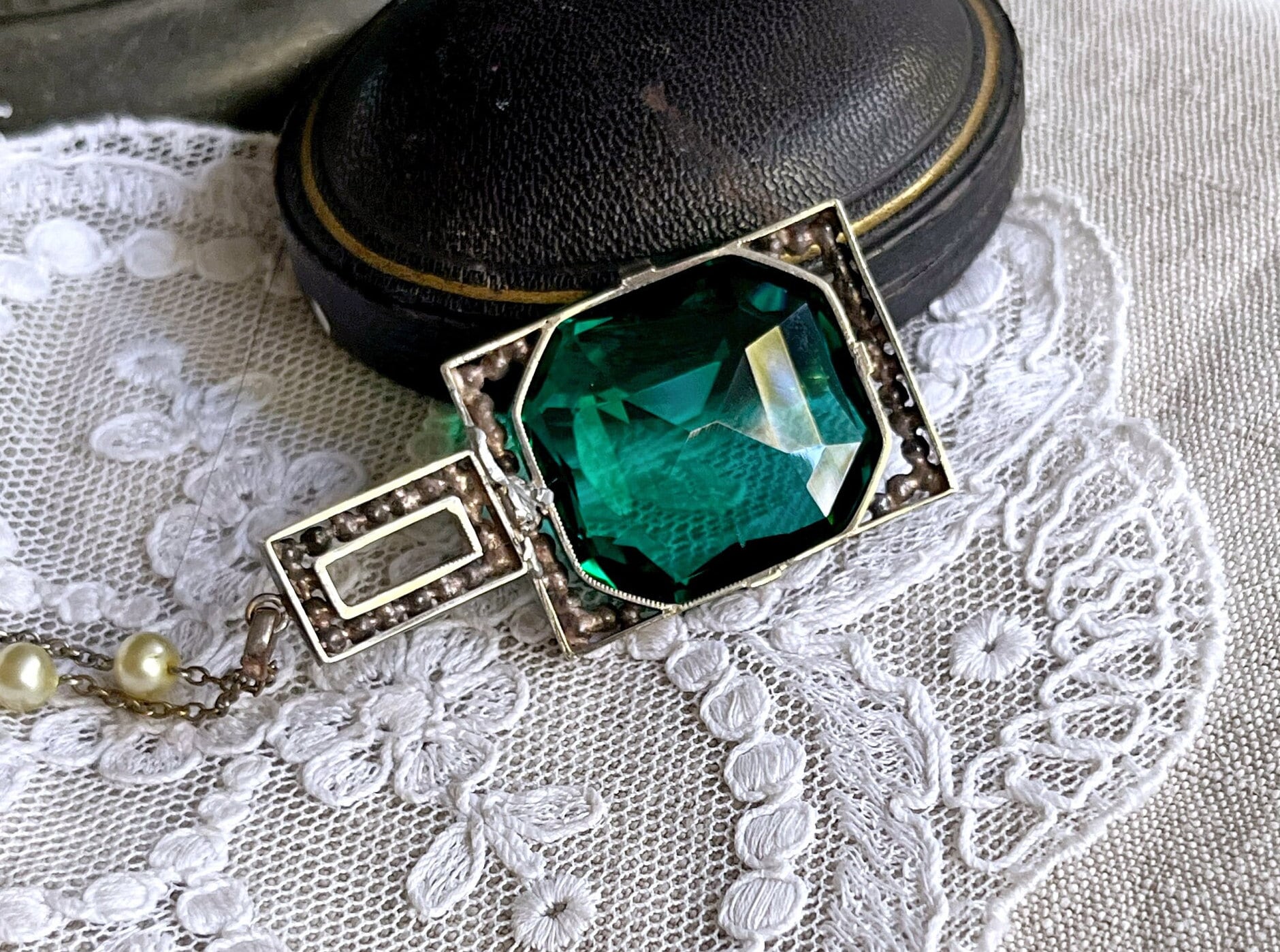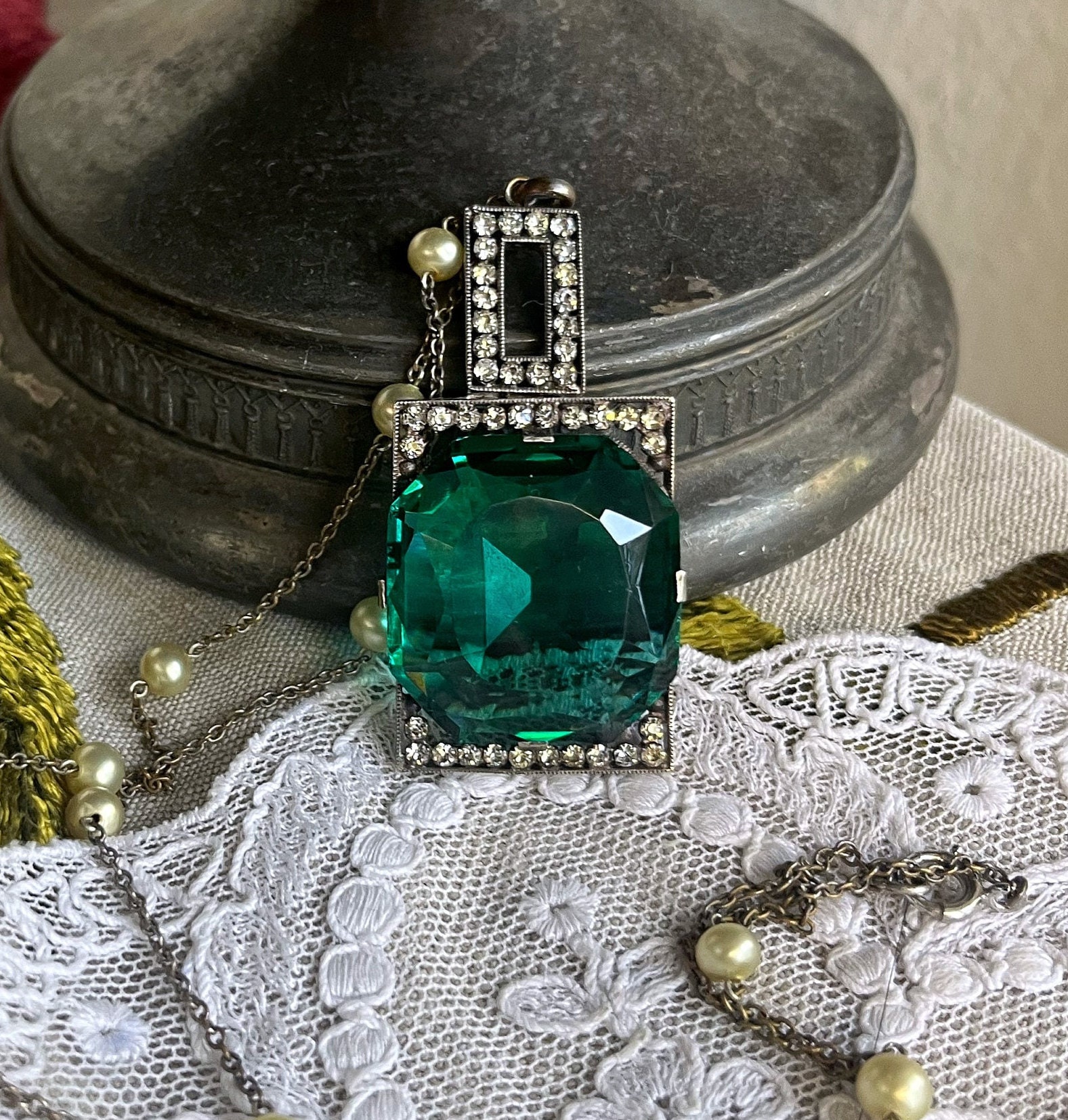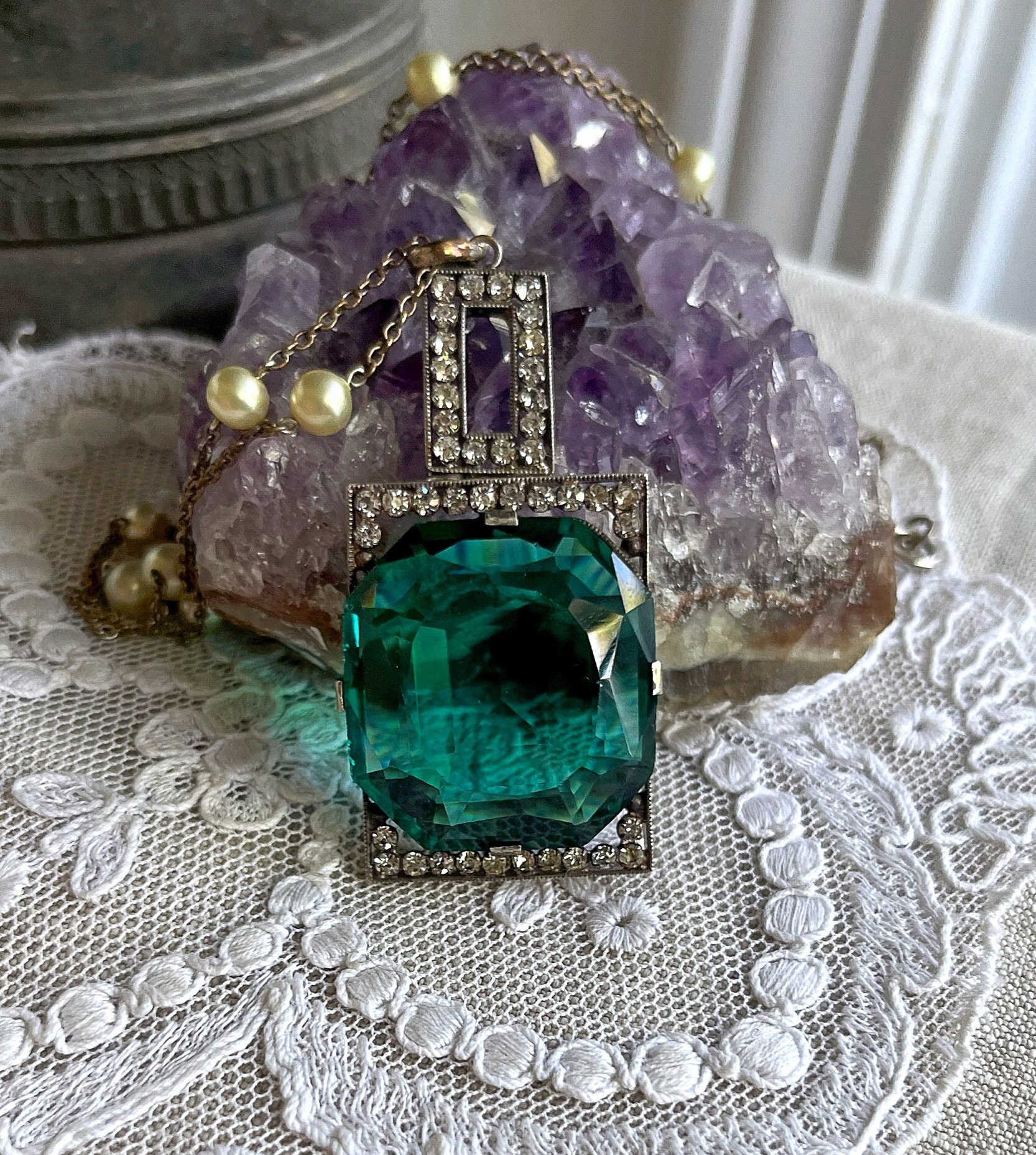 Featuring a fabulous vintage Art Deco glamorous matinee length pendant necklace adorned with a large luminous emerald green open back bezel set paste stone accented with faceted round white paste with beautiful faux pearls. Necklace measures approximately 22 inches long with a pendant drop of 2 inches respectively. In excellent vintage condition with a functional C spring clasp, normal wear with all stones intact and accounted for. A classic Art Deco piece, beautifully designed and ready to wear!