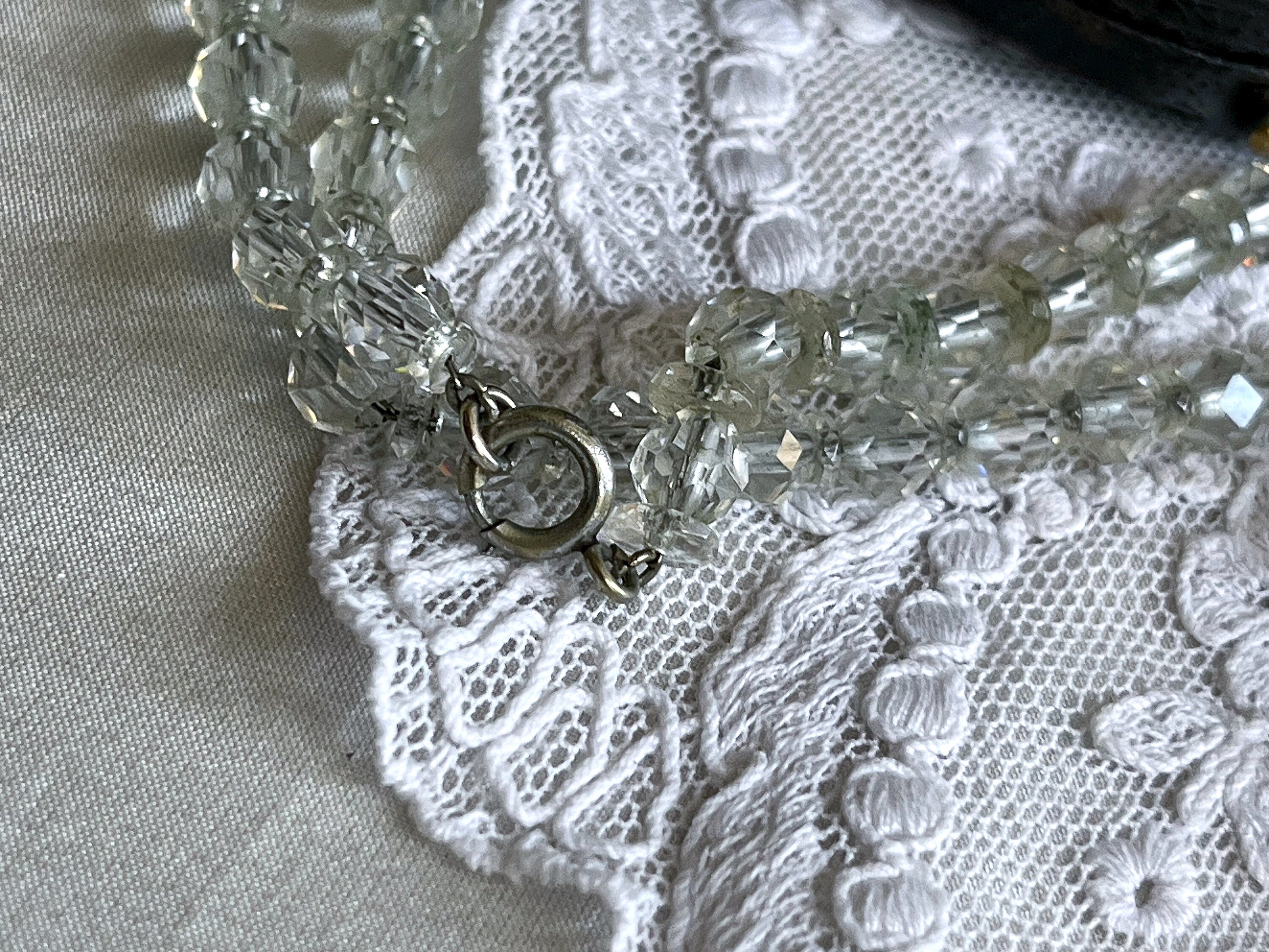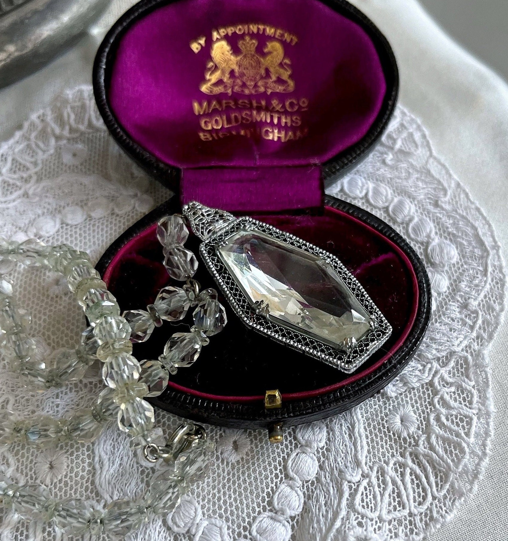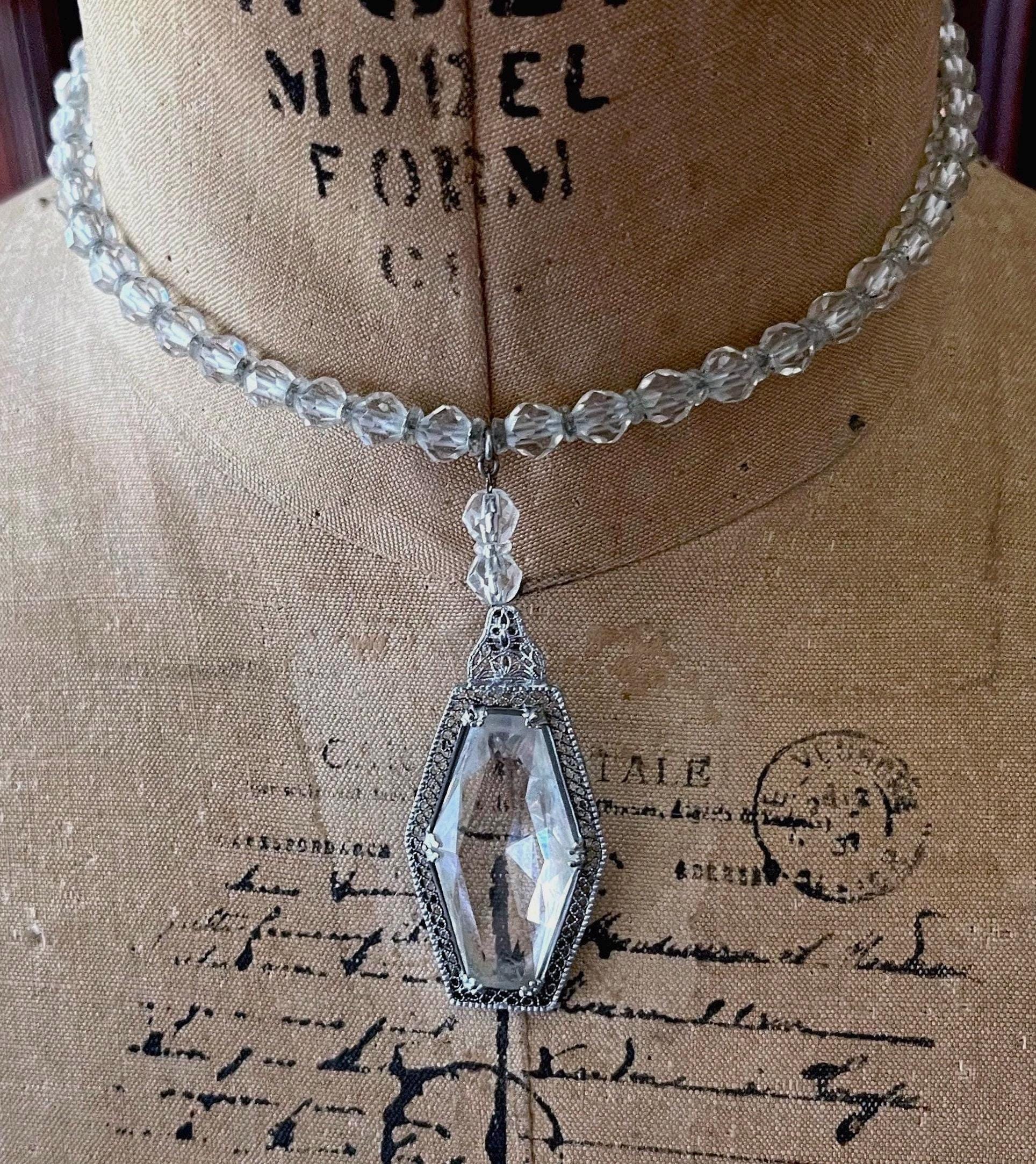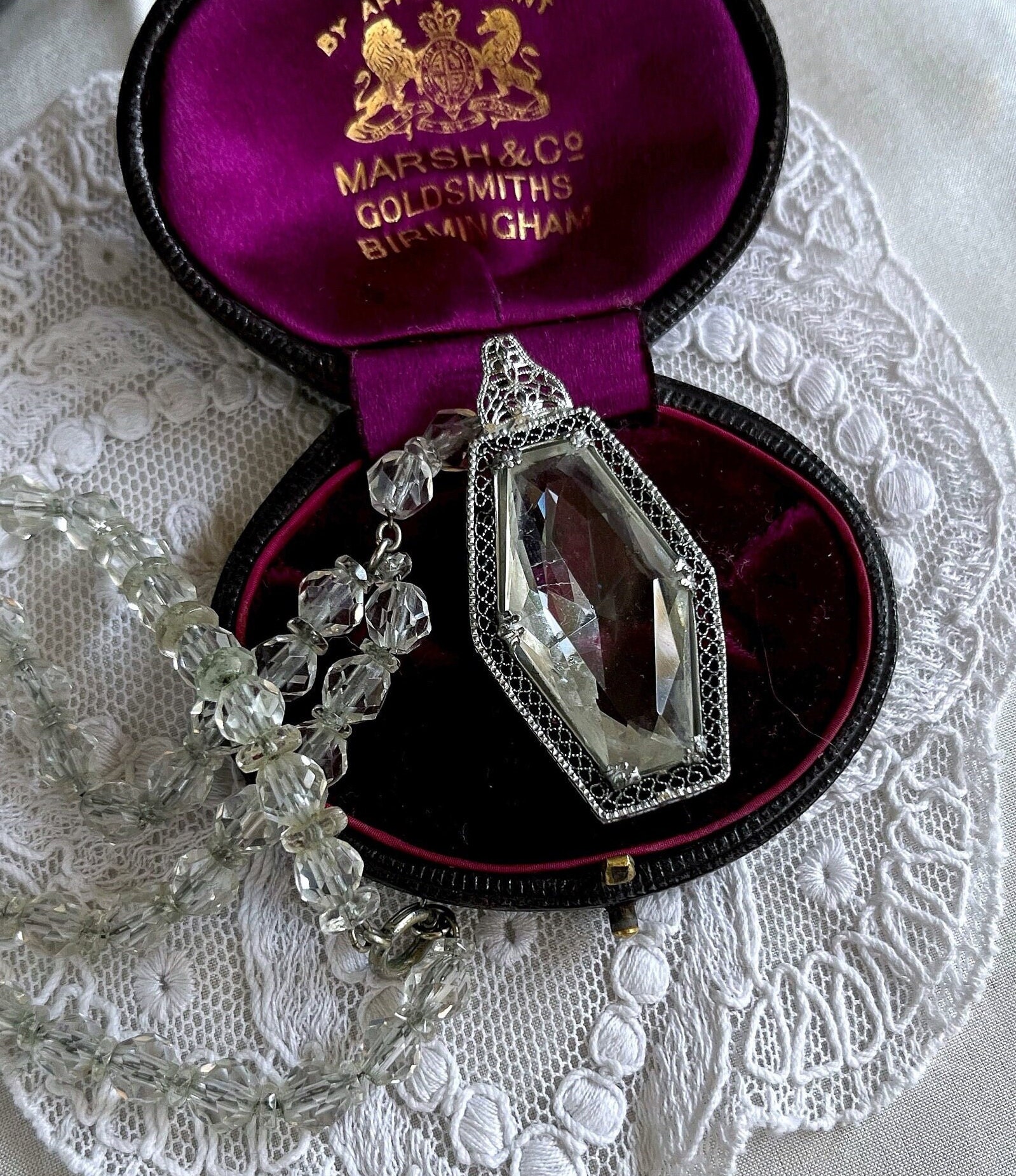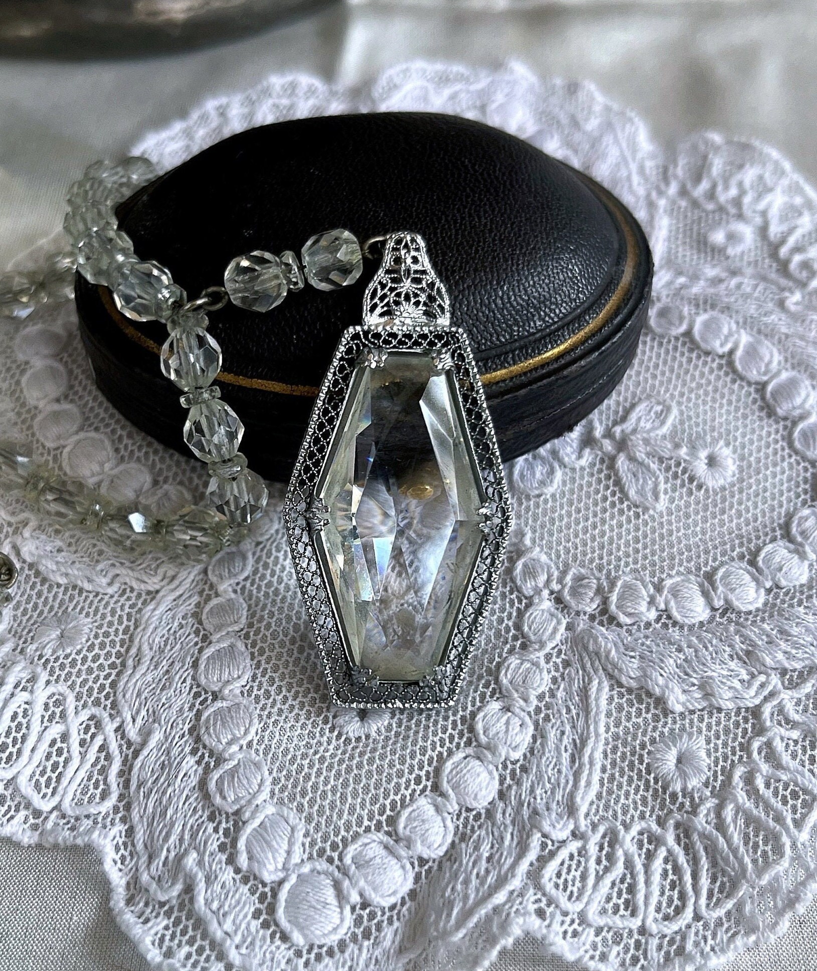 Featuring a spectacular sparkling antique Edwardian Era delicate Rhodium plated filigree necklace adorned with a dazzling faceted bezel set Diamond paste stone accented with brilliant faceted quartz rock crystal beads. This beautiful necklace measures approximately 14 inches around with a 2.9 inch pendant drop at 28.82 grams respectively. In excellent antique condition with a functional c spring clasp, normal wear with stone in pristine condition and is unsigned. Beautifully made over 100 years ago, shines like crazy and is ready to wear!