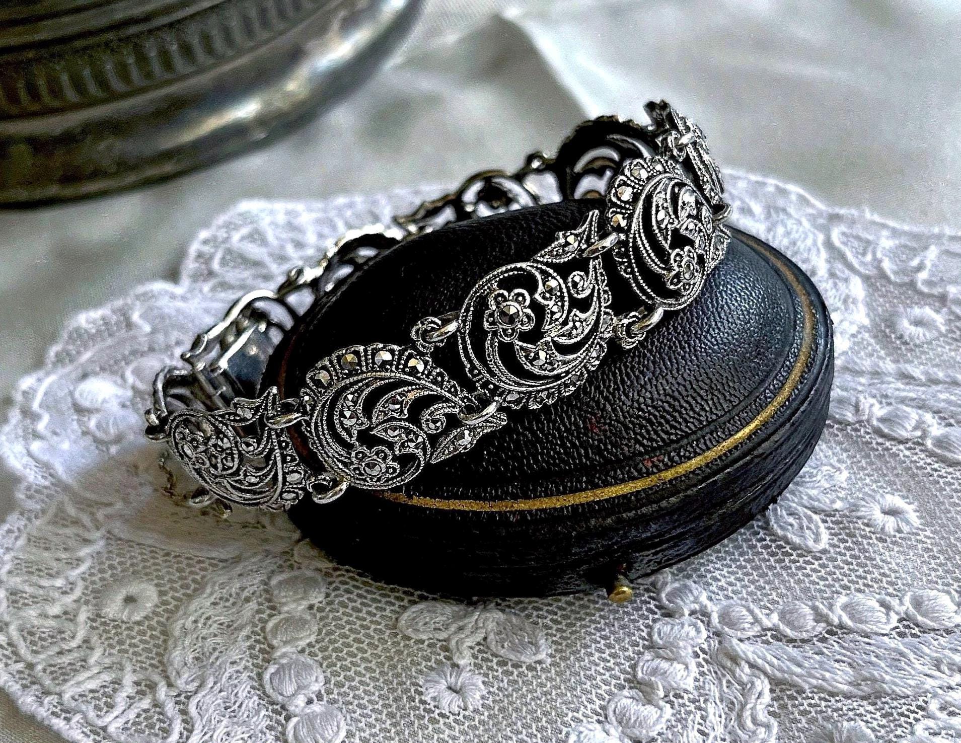 Featuring a lovely pristine Art Deco revival mid century 1940s-50s solid 830 silver hallmarked Swedish Import made in Austria or Germany link bracelet accented with sparkling faceted marcasite crystals set in floral motif settings. Bracelet is in like new condition with virtually no wear with all stones intact and accounted for with a functional clasp and intact safety chain. Bracelet measures approximately 7.5 inches around at 22.4 grams respectively, hallmarked on the inside of clasp. A beautiful piece!