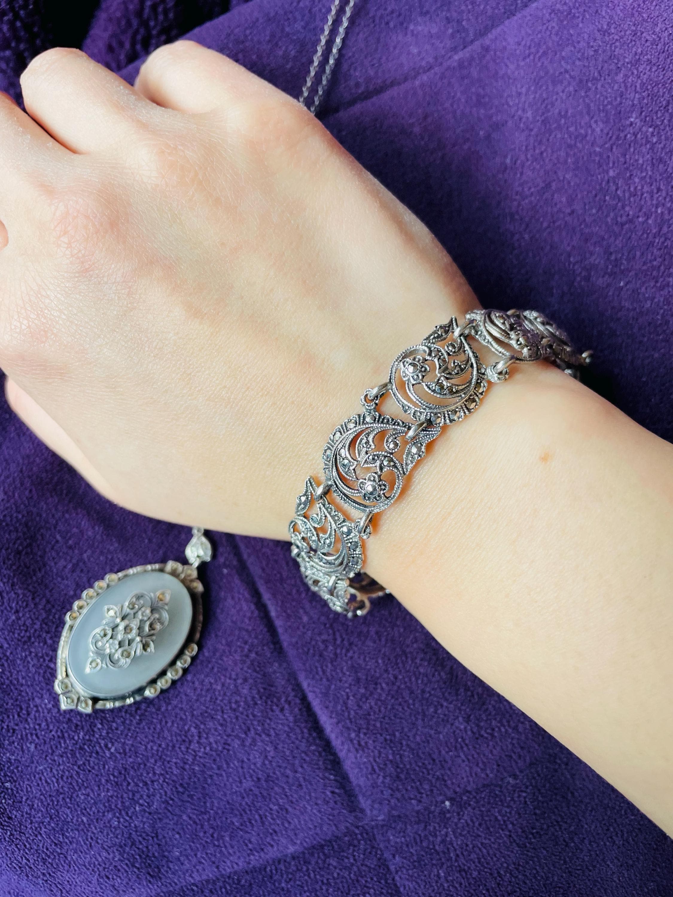 Featuring a lovely pristine Art Deco revival mid century 1940s-50s solid 830 silver hallmarked Swedish Import made in Austria or Germany link bracelet accented with sparkling faceted marcasite crystals set in floral motif settings. Bracelet is in like new condition with virtually no wear with all stones intact and accounted for with a functional clasp and intact safety chain. Bracelet measures approximately 7.5 inches around at 22.4 grams respectively, hallmarked on the inside of clasp. A beautiful piece!