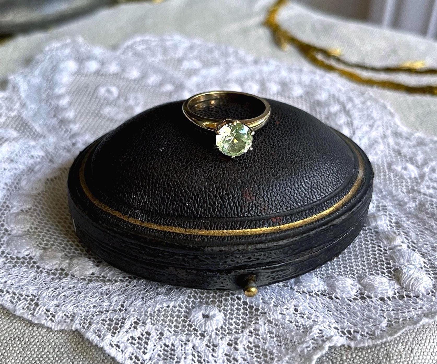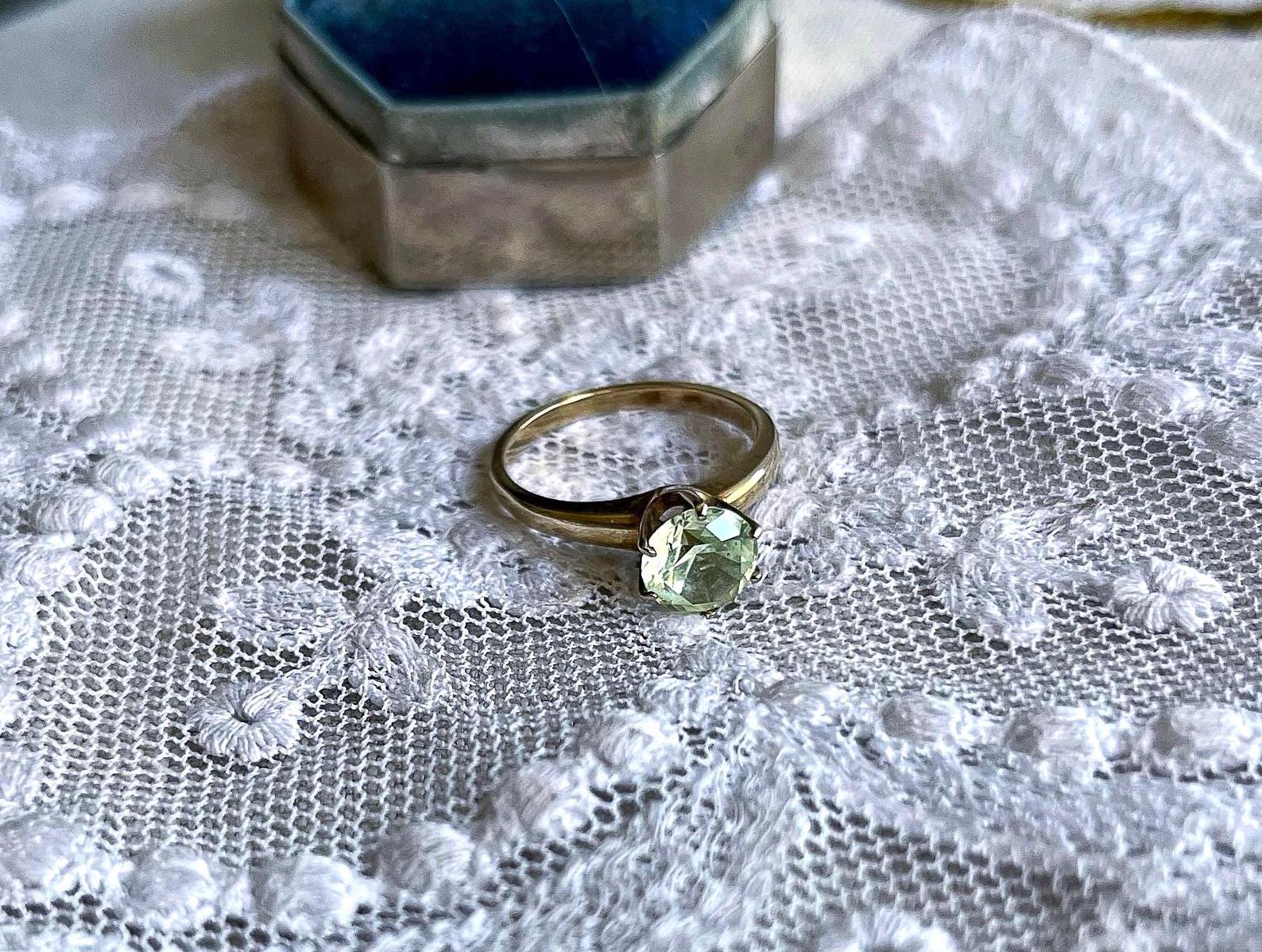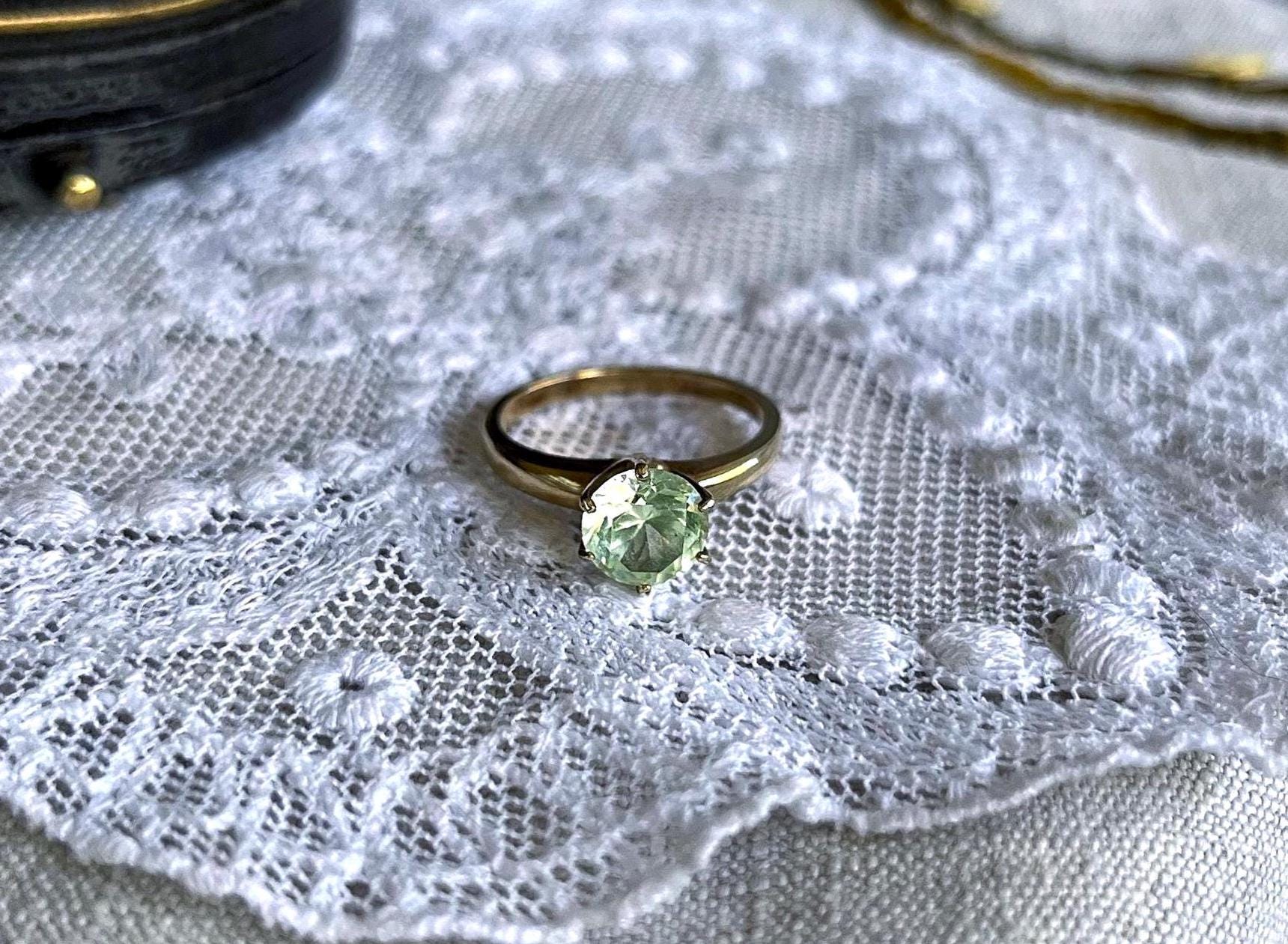 Featuring a brilliant vintage solid 10K yellow gold solitaire ring adorned with a sparkling faceted pronged set genuine Green topaz gemstone . Ring is approximately size 5.75 at 2.4 grams respectively and is in excellent vintage condition with normal wear, intact Stone faintly stamped and tested as 9.96k. I love how the cool of the gold contrasts beautifully with yellow green of the stone, a wonderful wearable unique vintage piece!