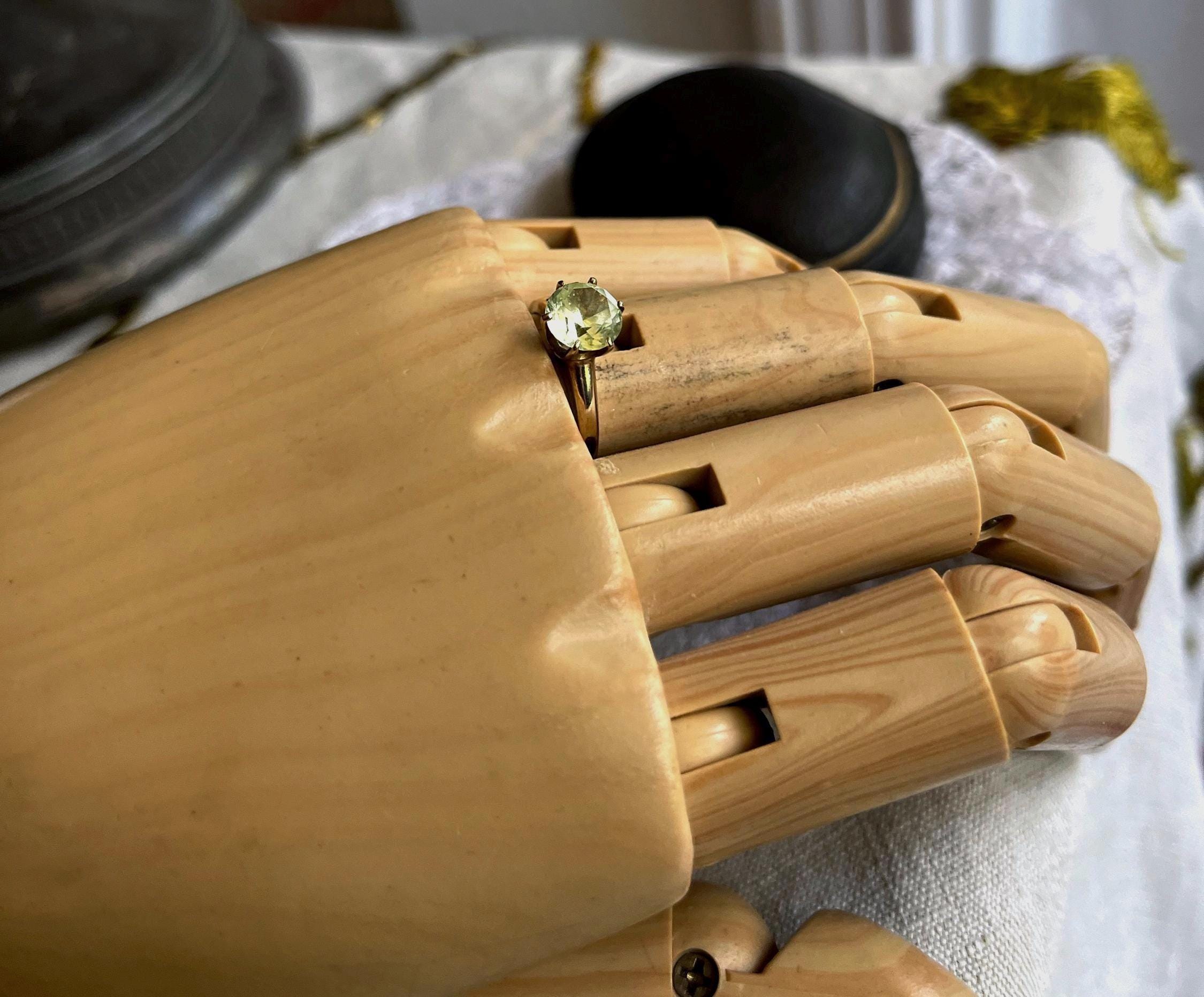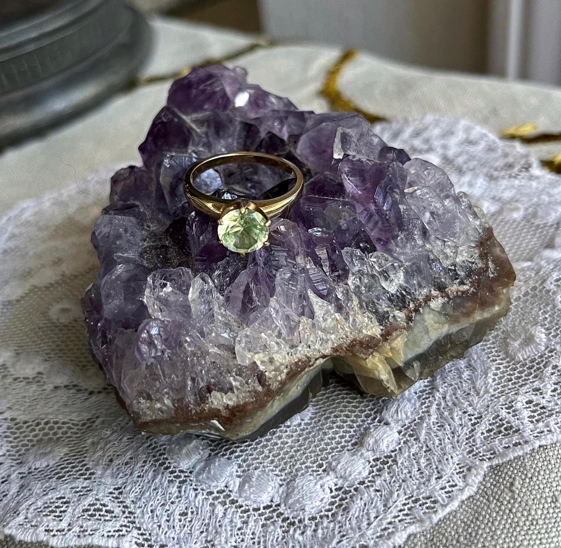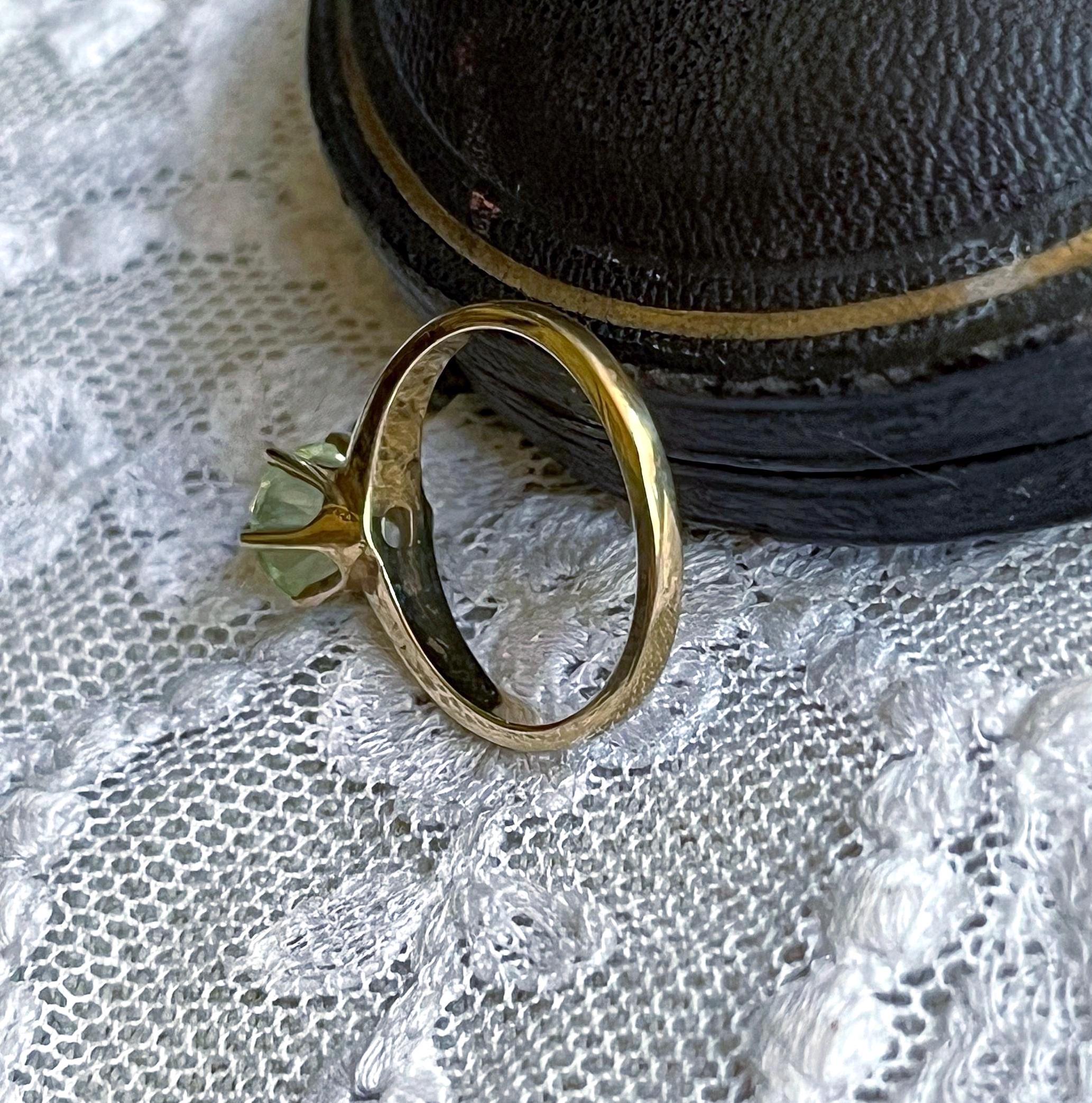 Featuring a brilliant vintage solid 10K yellow gold solitaire ring adorned with a sparkling faceted pronged set genuine Green topaz gemstone . Ring is approximately size 5.75 at 2.4 grams respectively and is in excellent vintage condition with normal wear, intact Stone faintly stamped and tested as 9.96k. I love how the cool of the gold contrasts beautifully with yellow green of the stone, a wonderful wearable unique vintage piece!