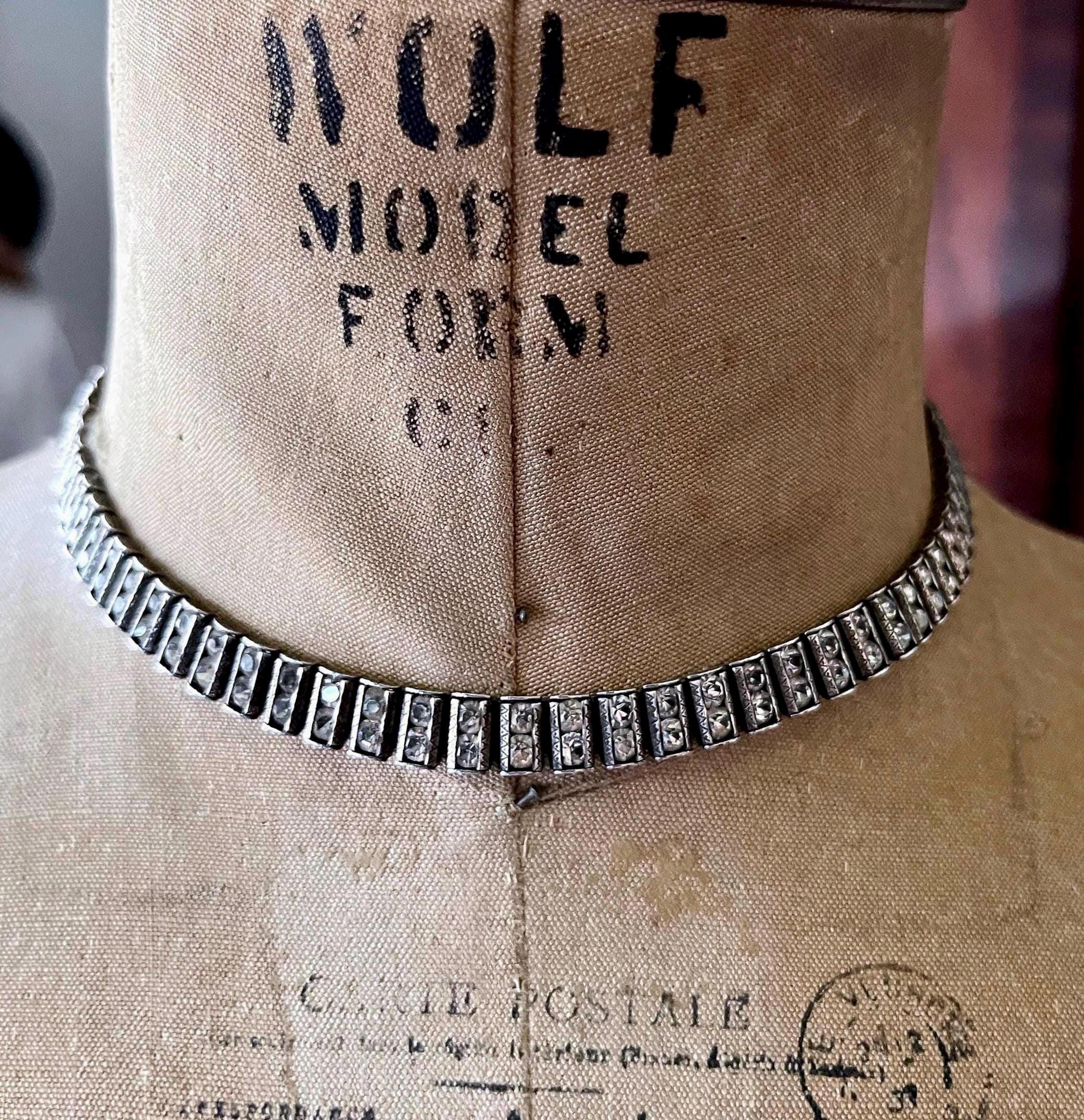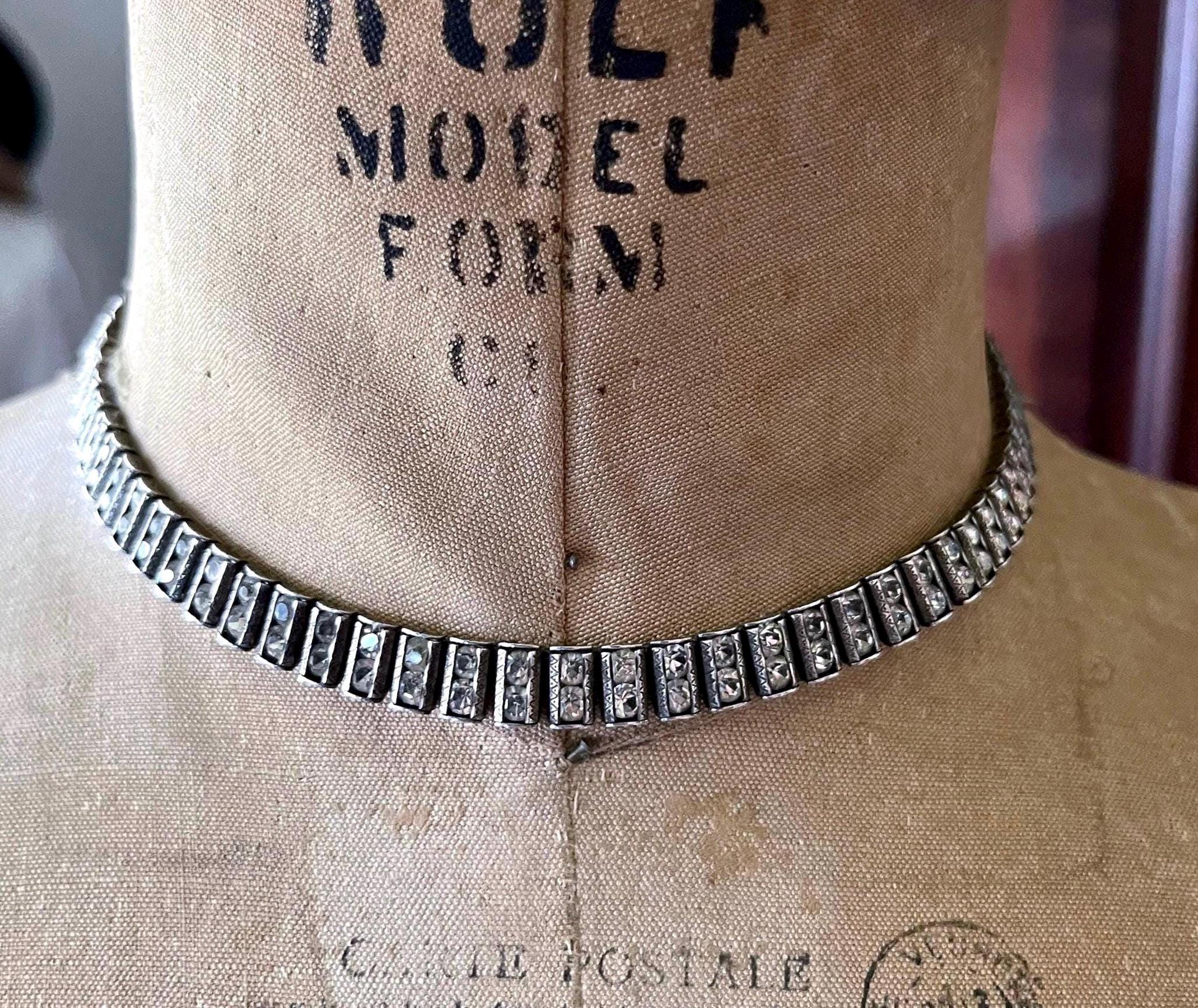 Featuring an exquisite vintage Catamore Enterprises Mid Century Art Deco sterling silver heavy choker necklace adorned with brilliant sparkling faceted diamond paste stones set in decorative sterling channel set settings. Necklace measures approximately 14 inches around at 38 grams respectively and is in excellent vintage condition with a functional slide clasp stamped CATAMORE STERLING with a nice patina, intact safety chain with all stones intact and accounted for.