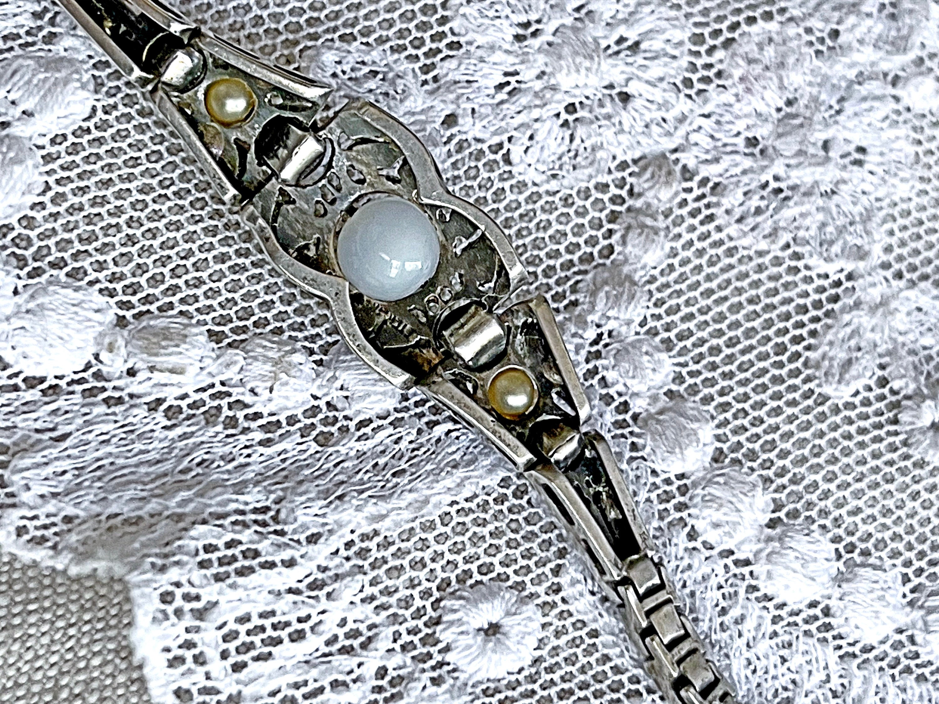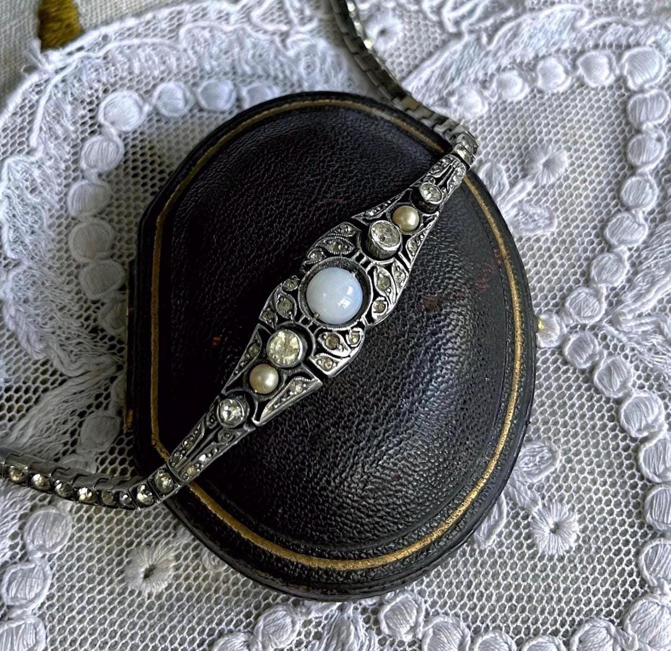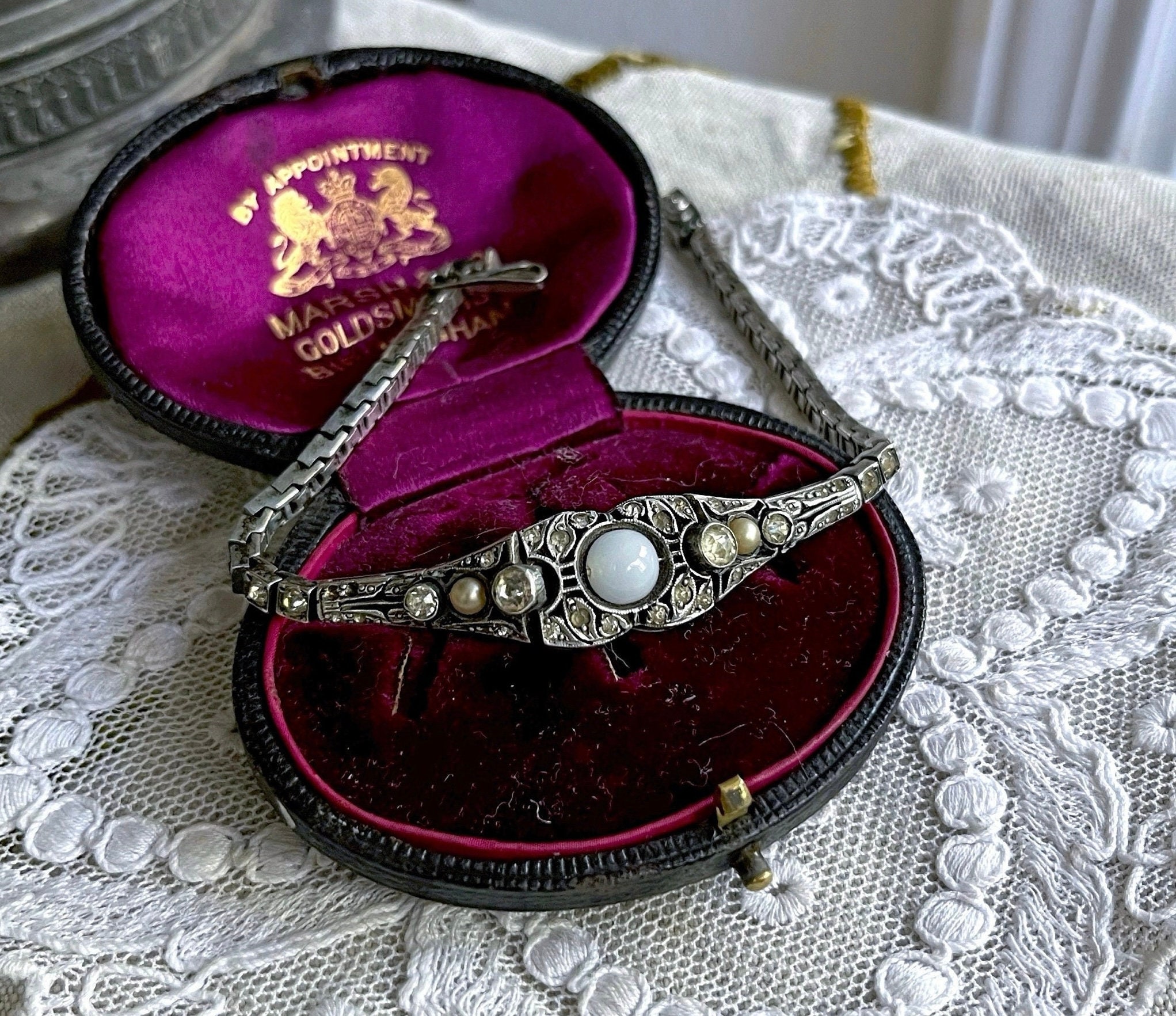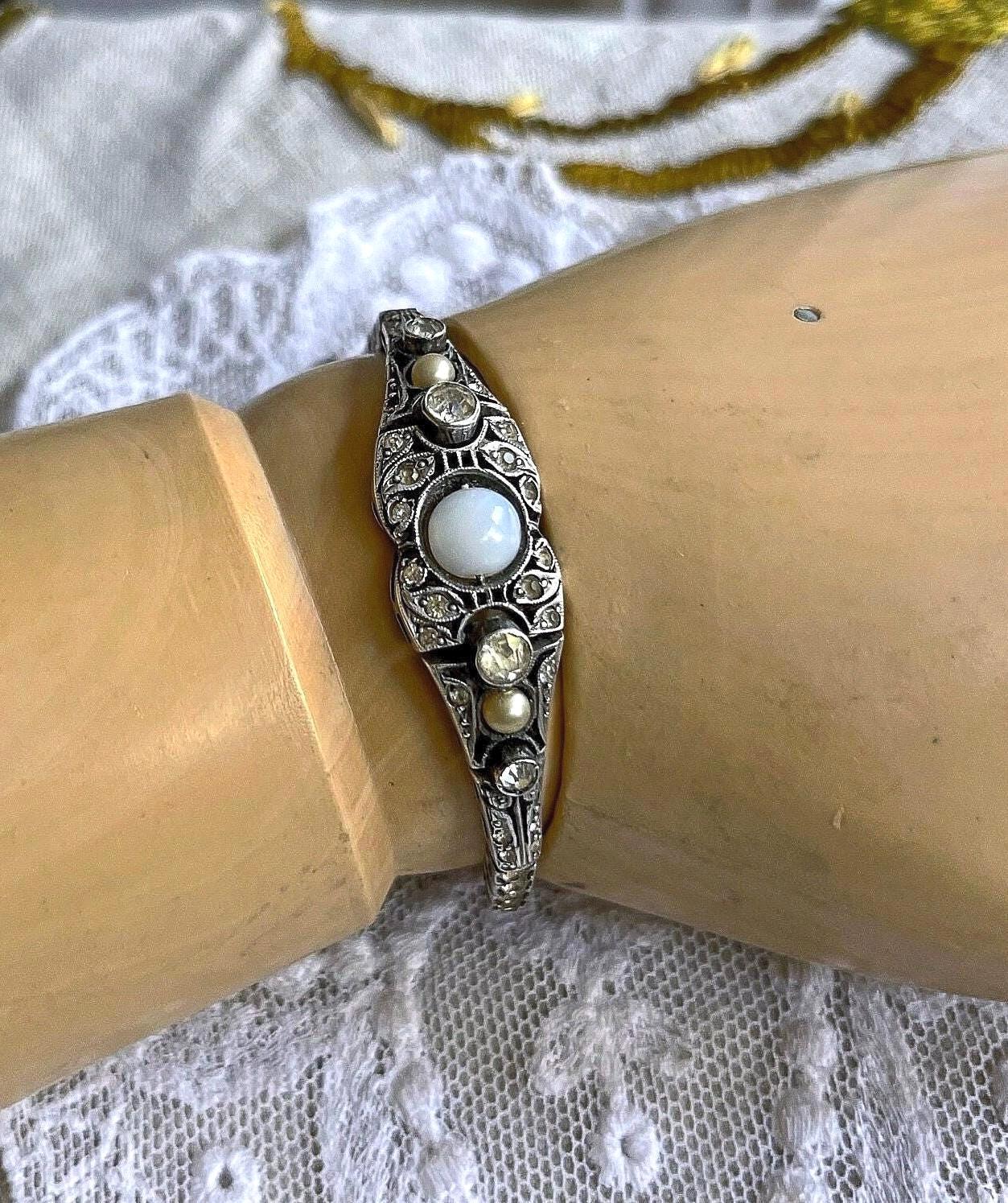 Featuring a rare vintage Art Deco circa 1930s sterling silver decorative Haute Couture link bracelet adorned with a luminous glass Opalite spinning bead accented with brilliant sparkling diamond paste stones all set in closed bezel set settings. Bracelet is in excellent vintage condition with a functional slide clasp, a beautiful patina with all stones intact and accounted for. Bracelet measures approximately 7 inches around at 15 grams respectively. Faintly marked near clasp and reverse of center, tested as STERLING. Beautifully made, ready to wear this is an investment worth wearing.