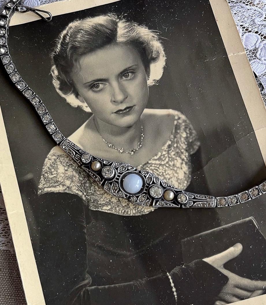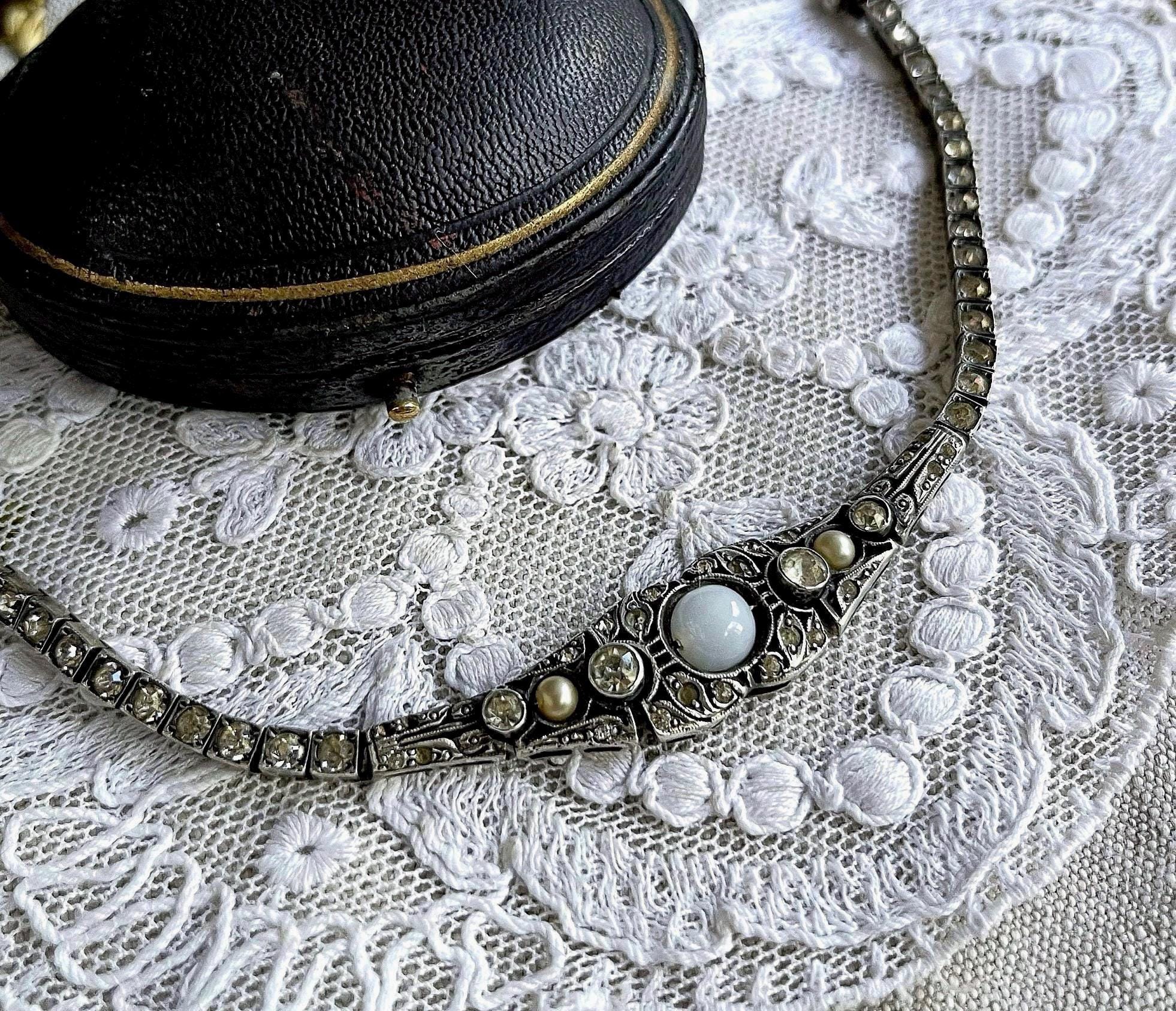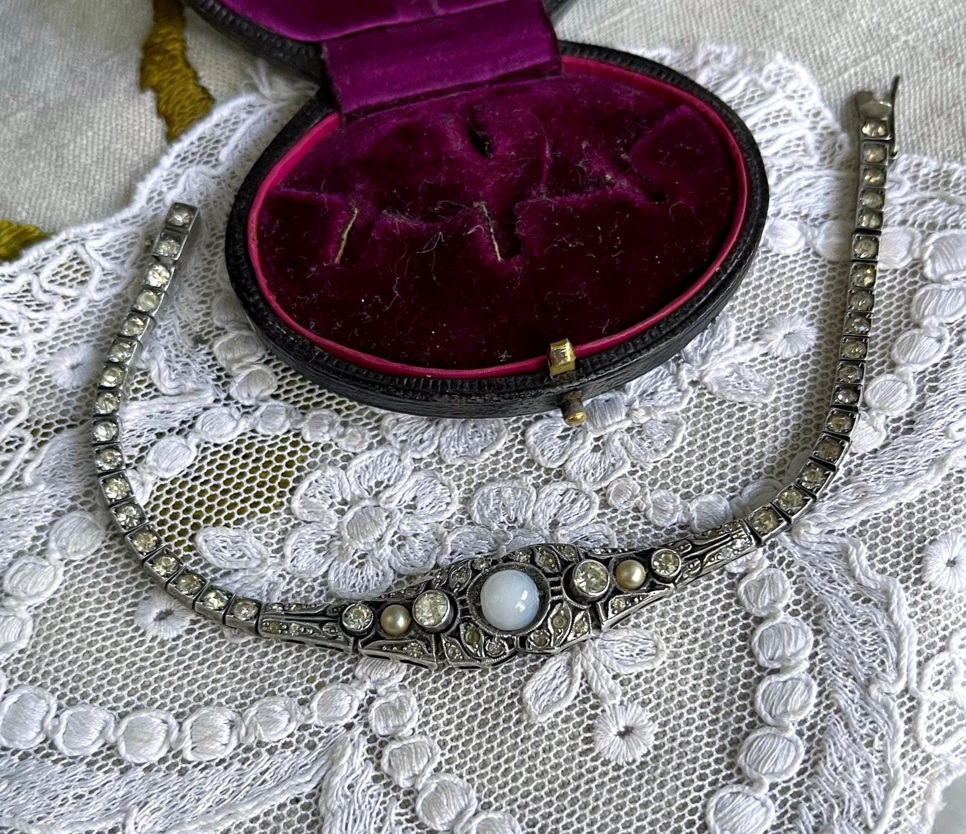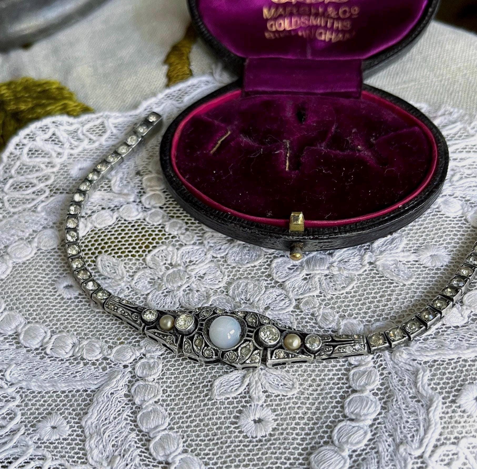 Featuring a rare vintage Art Deco circa 1930s sterling silver decorative Haute Couture link bracelet adorned with a luminous glass Opalite spinning bead accented with brilliant sparkling diamond paste stones all set in closed bezel set settings. Bracelet is in excellent vintage condition with a functional slide clasp, a beautiful patina with all stones intact and accounted for. Bracelet measures approximately 7 inches around at 15 grams respectively. Faintly marked near clasp and reverse of center, tested as STERLING. Beautifully made, ready to wear this is an investment worth wearing.