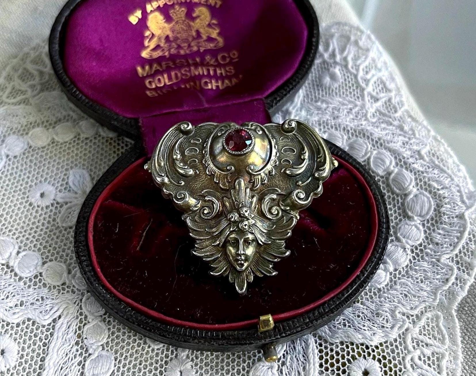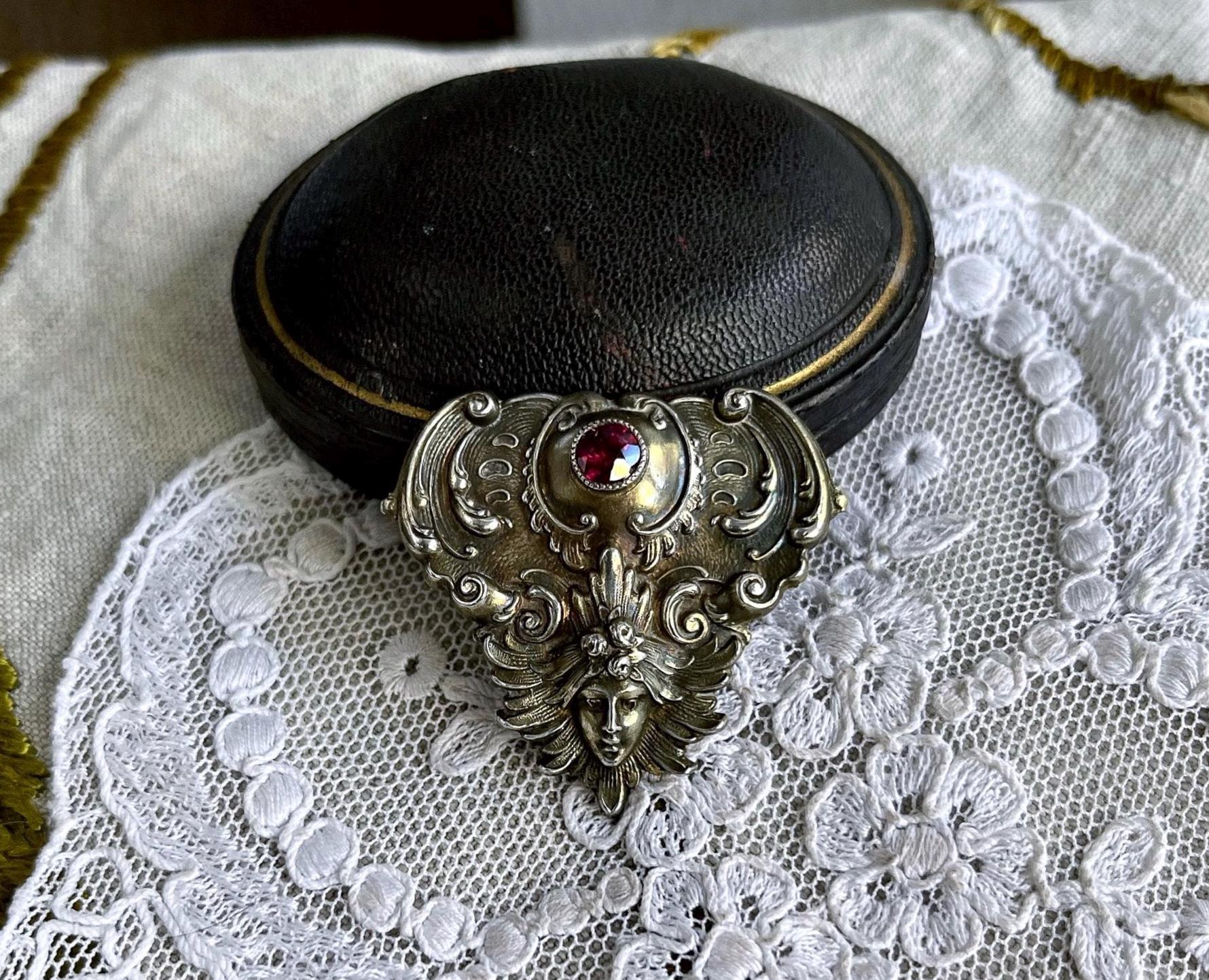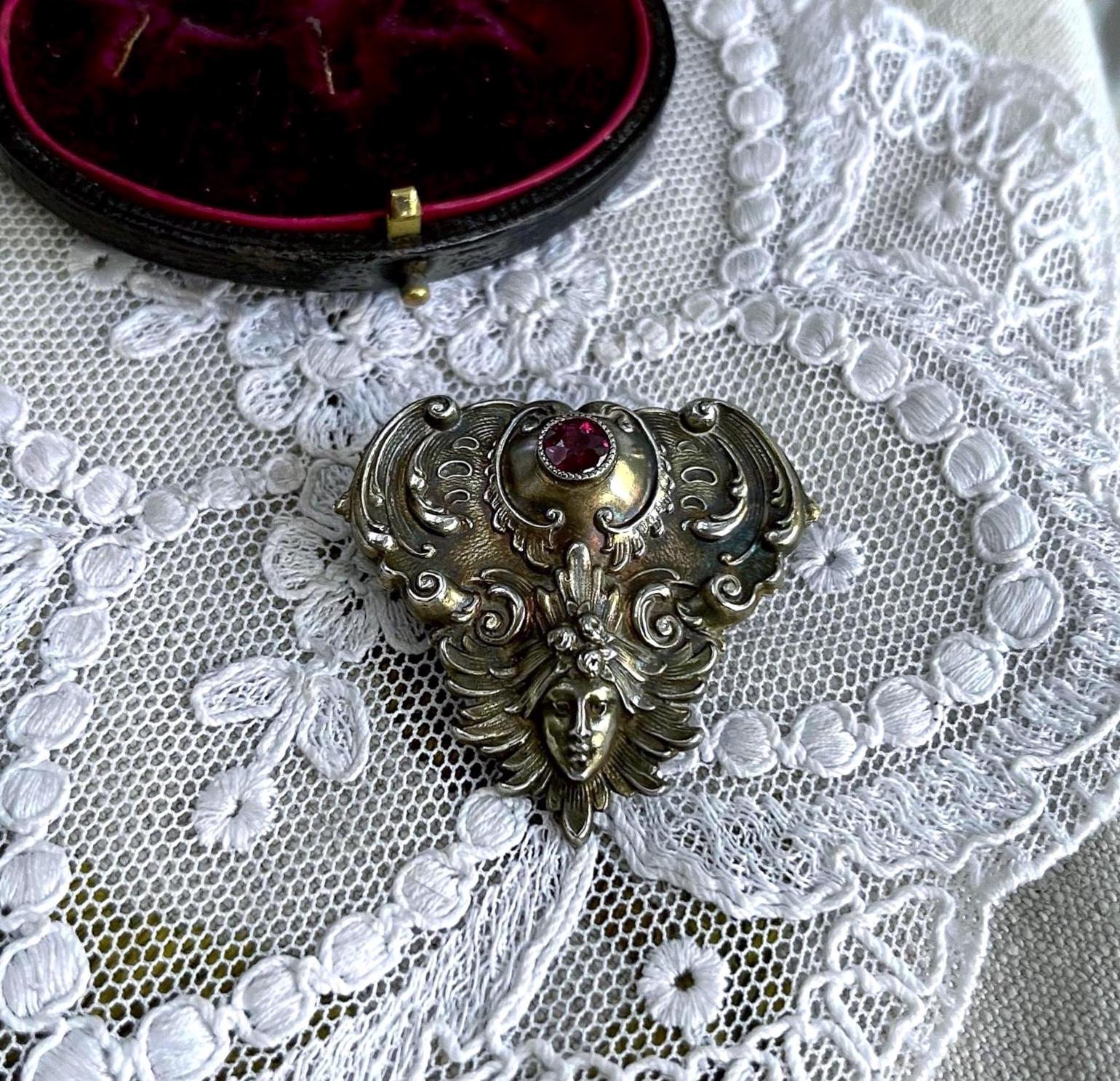 Featuring a rare one of a kind antique German Jugendstil Art Nouveau 800 silver gold rolled brooch accented with a luminous genuine faceted garnet gemstone . This unique piece measures approximately 1.5 by 1.75 at 6.93 grams respectively, is in excellent antique condition with a functional clasp. Faintly hallmarked on the reverse, beautifully designed, highly collectible. A wonderful wearable antique piece!