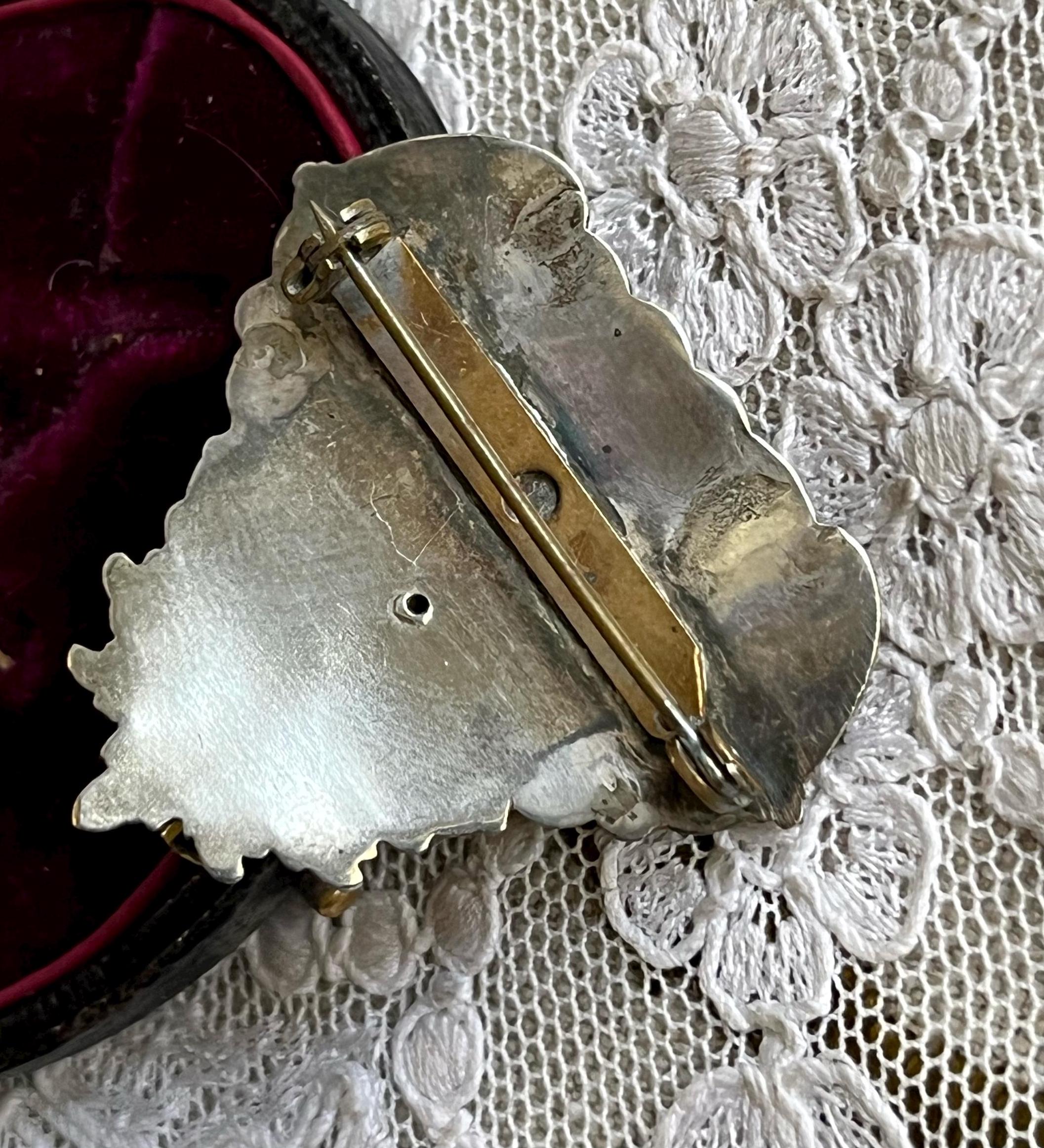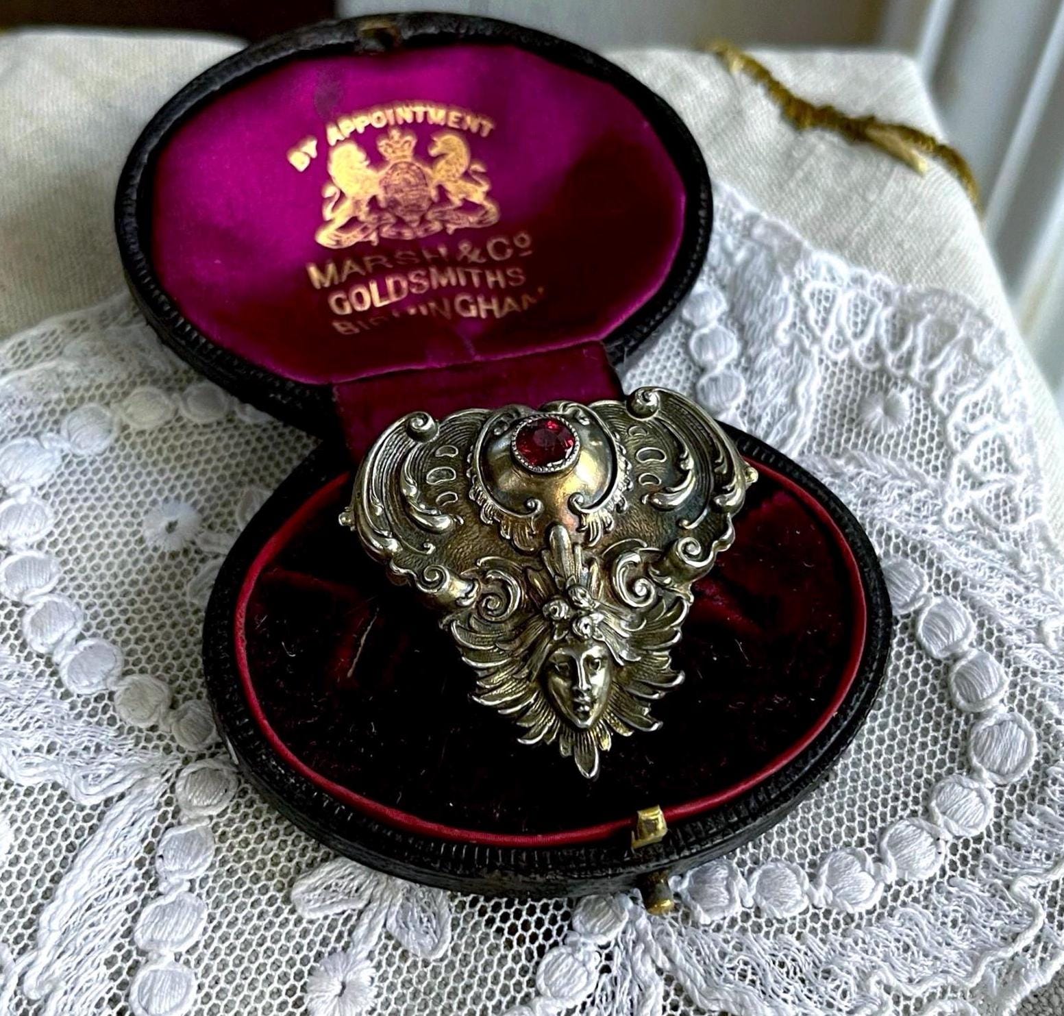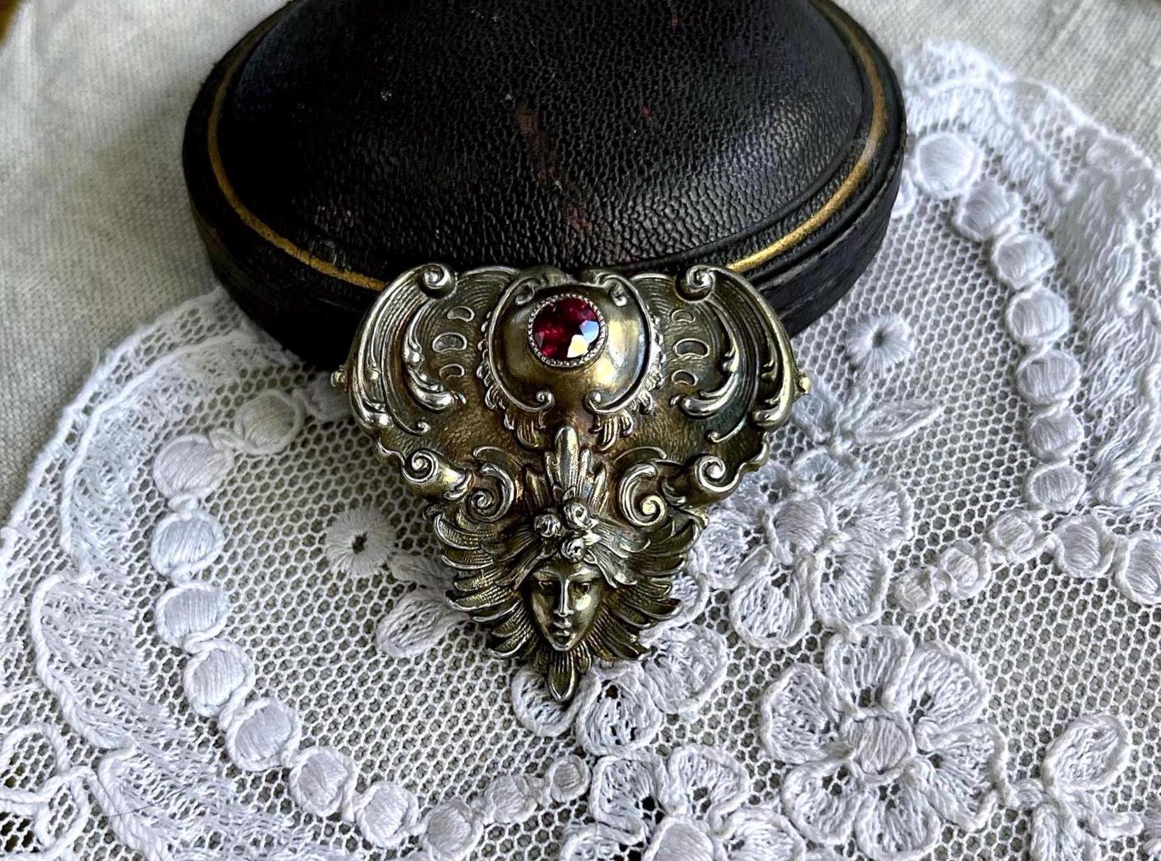 Featuring a rare one of a kind antique German Jugendstil Art Nouveau 800 silver gold rolled brooch accented with a luminous genuine faceted garnet gemstone . This unique piece measures approximately 1.5 by 1.75 at 6.93 grams respectively, is in excellent antique condition with a functional clasp. Faintly hallmarked on the reverse, beautifully designed, highly collectible. A wonderful wearable antique piece!