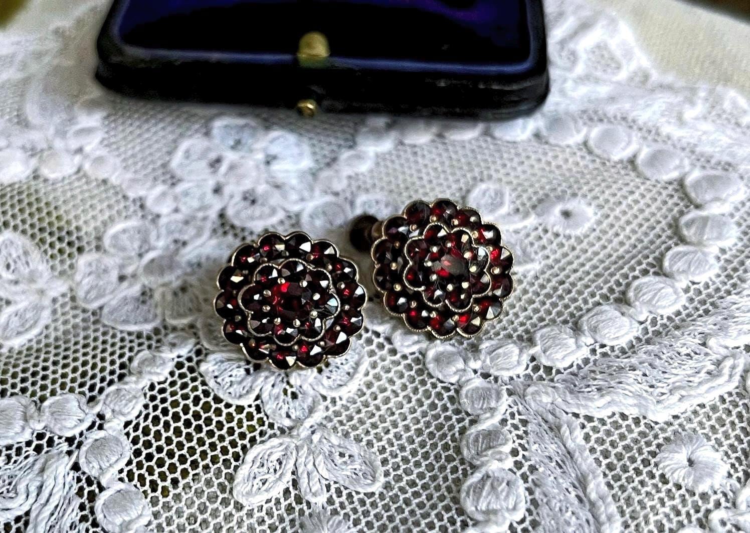 Featuring a beautiful pair of vintage Bohemian Victorian Revival 900 silver Gold Plated screw back cluster Earrings adorned with luminous genuine faceted Rose Cut Georgian style Garnets. Earrings measure approximately 15mm at 4.31 grams respectively. These beauties are in excellent vintage condition with a nice patina. Functional screw back clasps hallmarked 900 with all stones intact and accounted for. These are just so beautiful, perfect anytime of year and will appreciate over time!