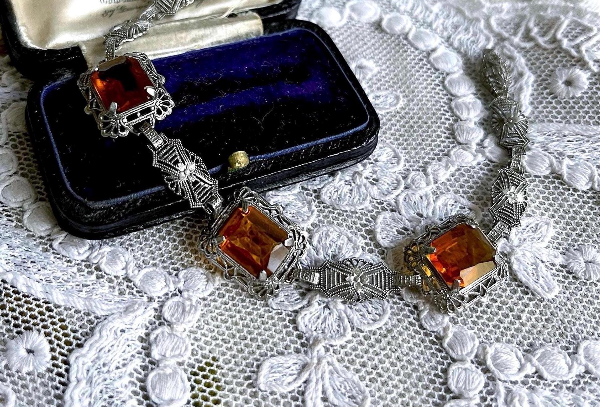 Featuring a beautiful delicate antique Belle Époque Edwardian sterling silver filigree link bracelet adorned with dazzling faceted yellow Topaz paste stones set in decorative pronged open back settings. Bracelet measures approximately 7 inches around at 5.07 grams respectively and is in excellent antique condition with a functional clasp, minimal wear with all stones intact, stamped STERLING on the clasp. A wonderful piece, beautifully made and ready to pass in for generations!