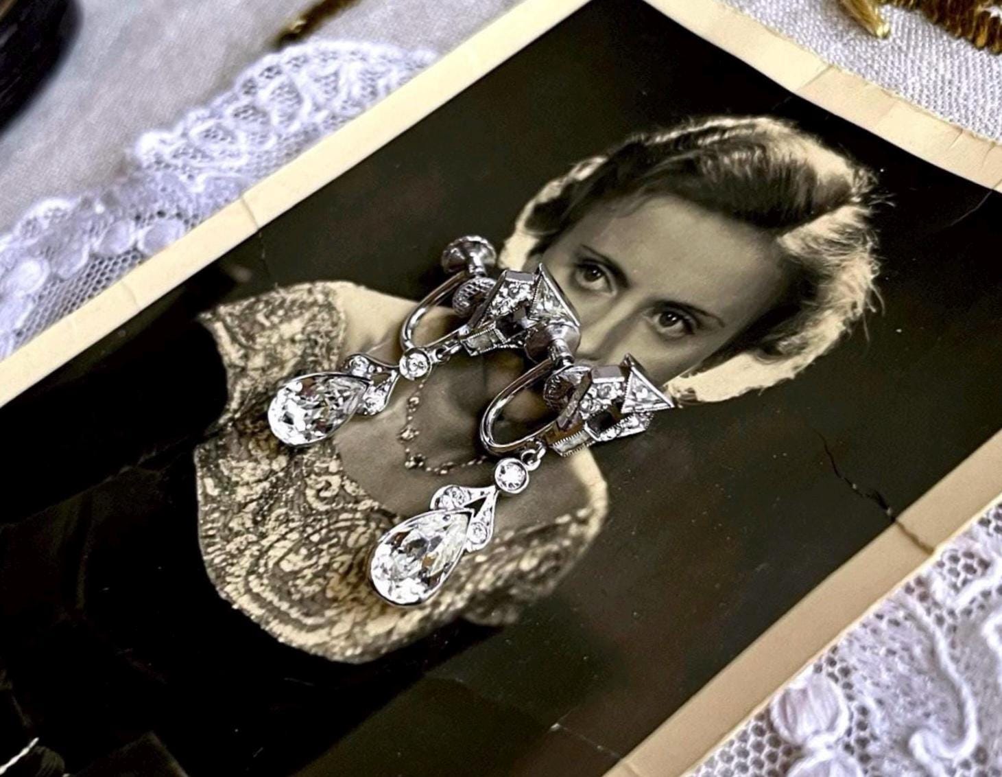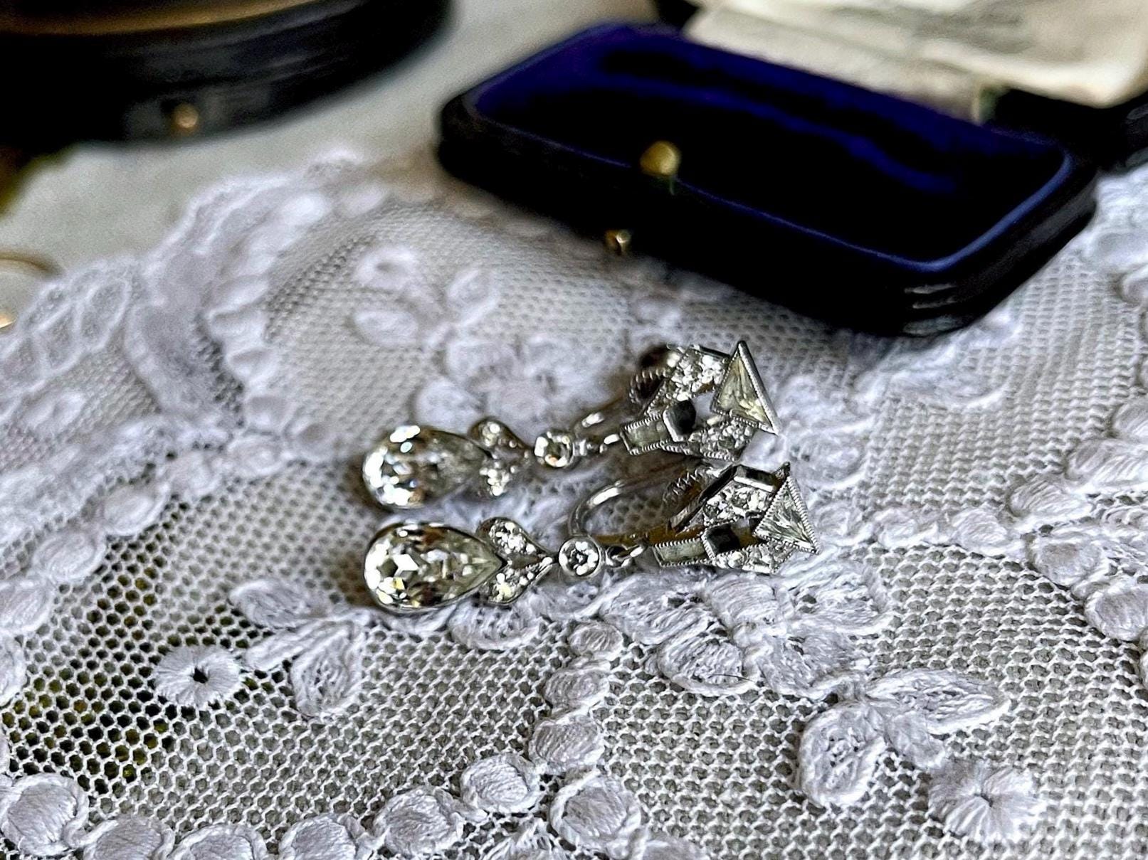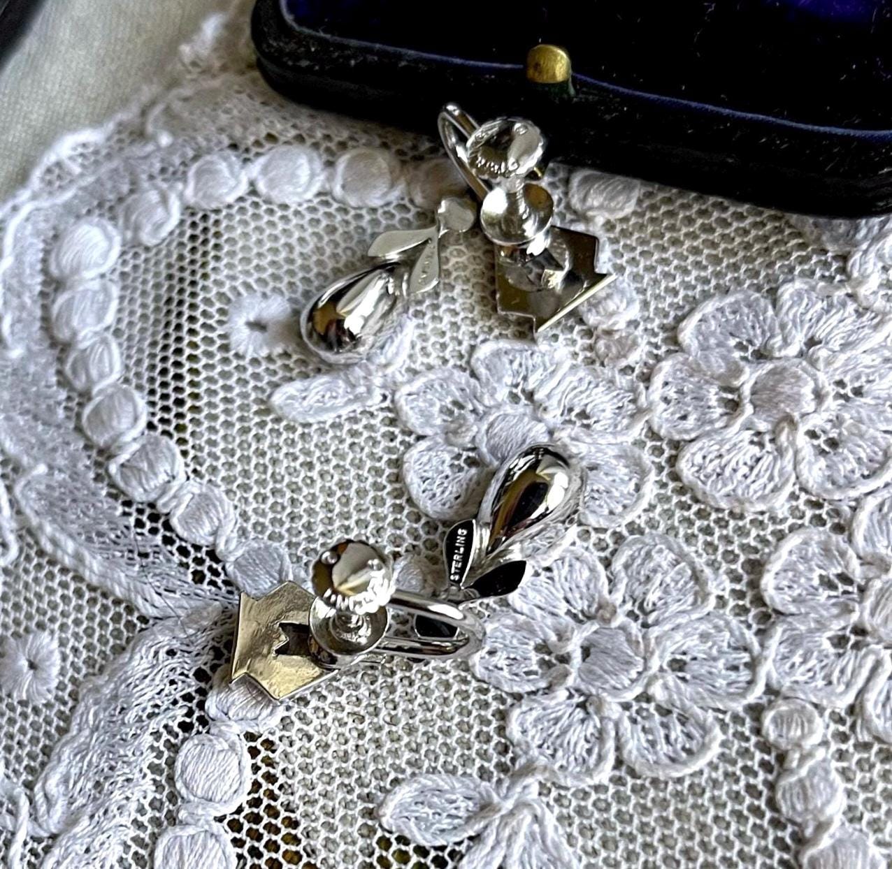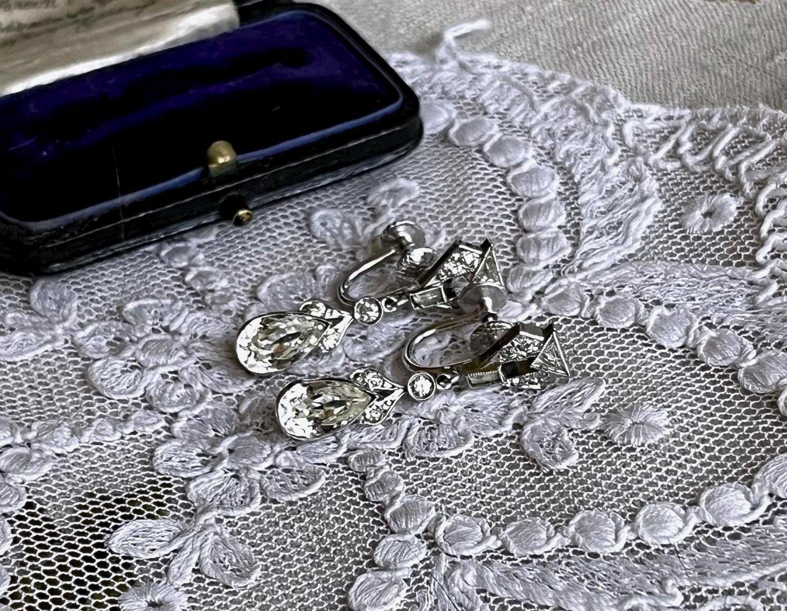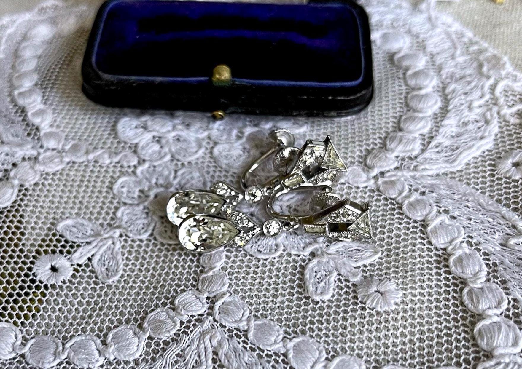 Featuring a lovely feminine antique Art Deco stamped sterling silver Rhodium plated sparkling Screw back earrings adorned with a luminous faceted foil back Paste stones set in closed back settings. Earrings measure approximately 1.2 inches long at 6.1 grams respectively. This elegant pair of antique earrings are in excellent antique condition with functional stamped STERLING clasps, minimal wear to plating with all stones intact and accounted for. Stones are brilliant and clear and sparkle like crazy! A beautiful wearable investment piece!