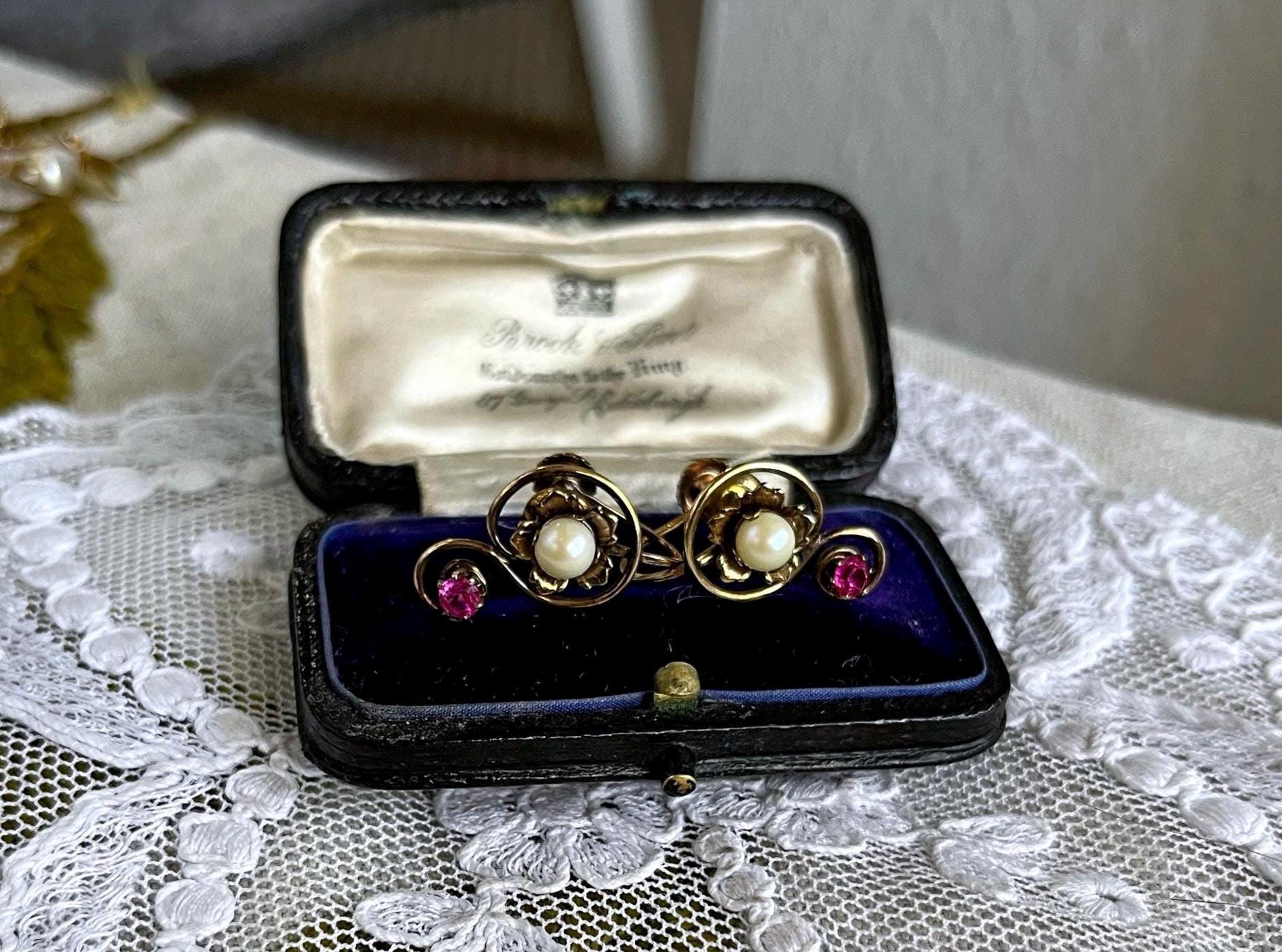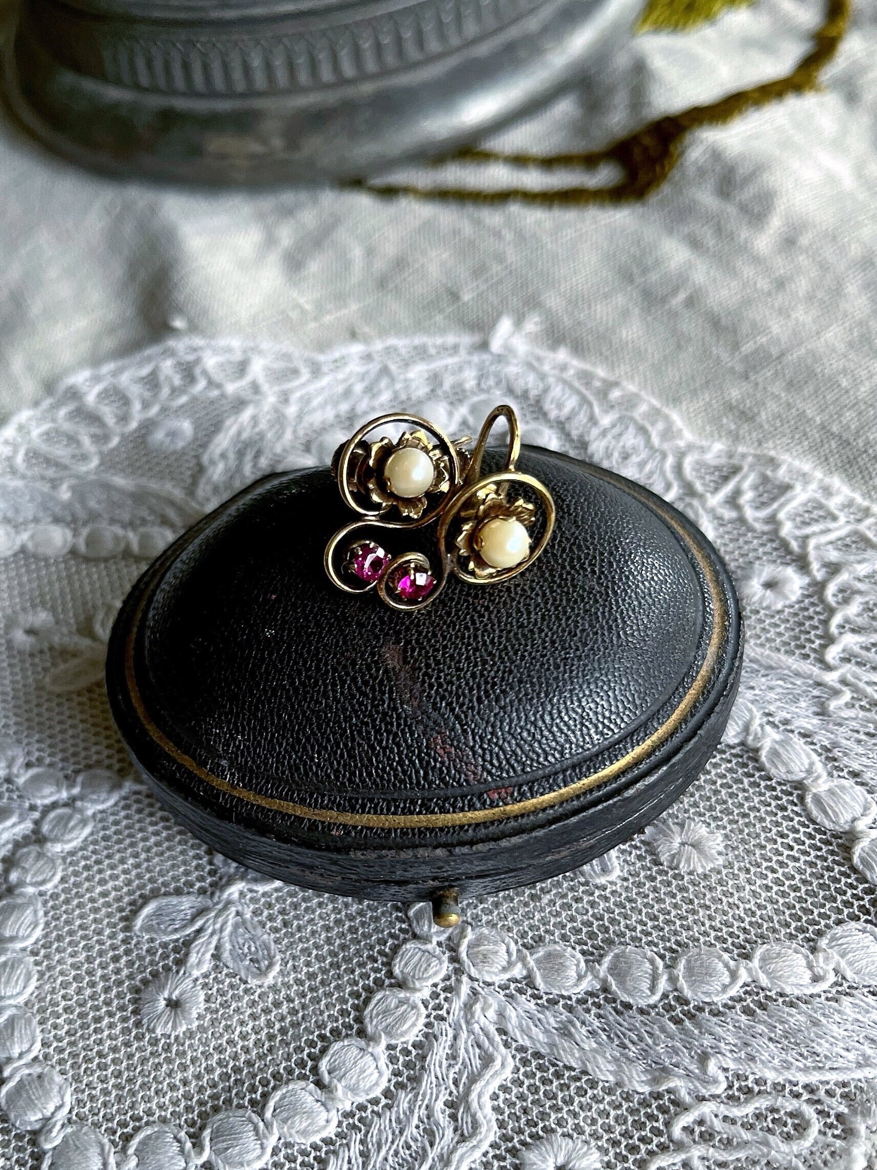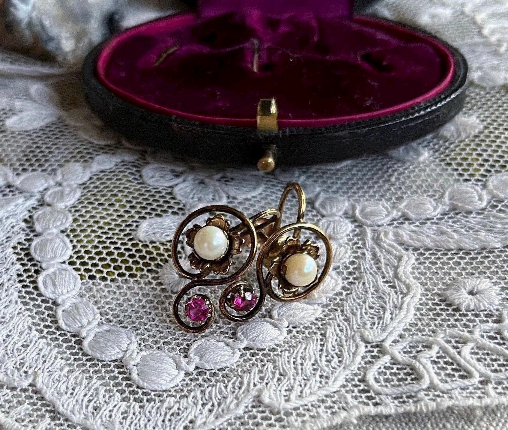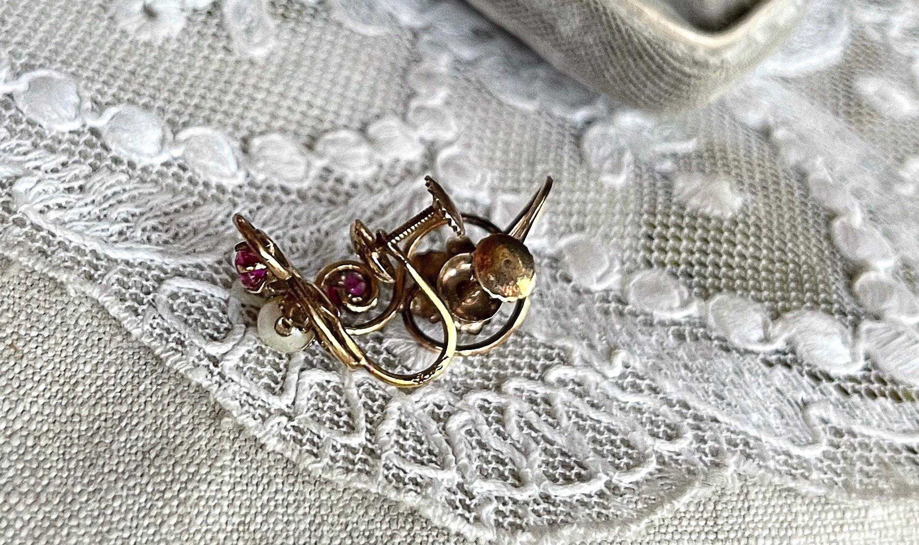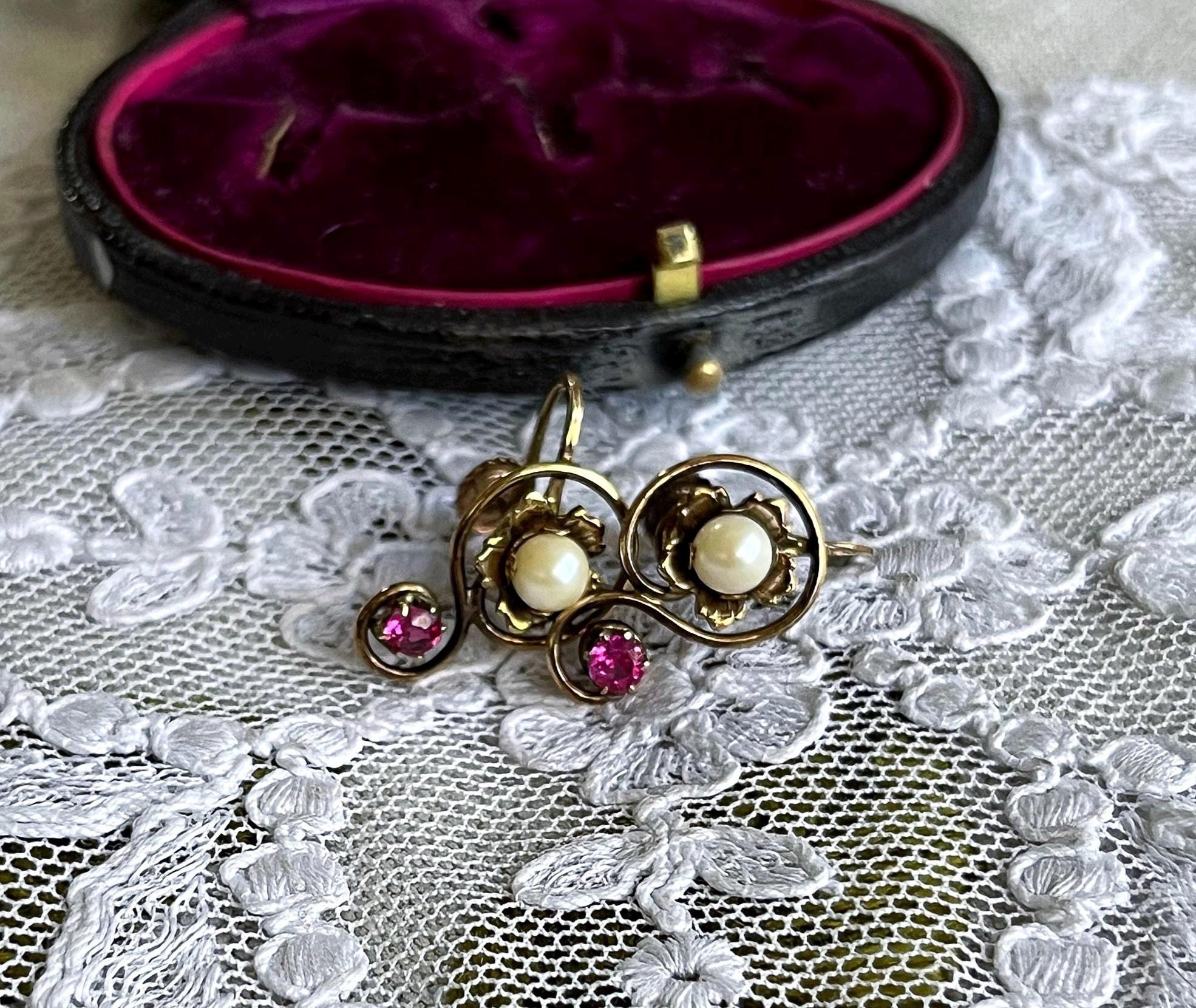 Featuring a lovely pair of antique 1910s Edwardian Belle Époque solid 10k gold delicate screw back earrings, beautifully designed 10k gold pendant accented with genuine faceted Ruby stones and a genuine luminous cultured Pearl. Earrings are in excellent antique condition with a functional stamped 10k on both pieces , with all stones intact and accounted for. Measuring approximately 1.2 inches long with a 1.2 inch long at 2.8 grams respectively this is a truly impressive piece, over 100 years old and still wearable for generations. Pair them with matching necklace, and contact me if you’re interested in the set!