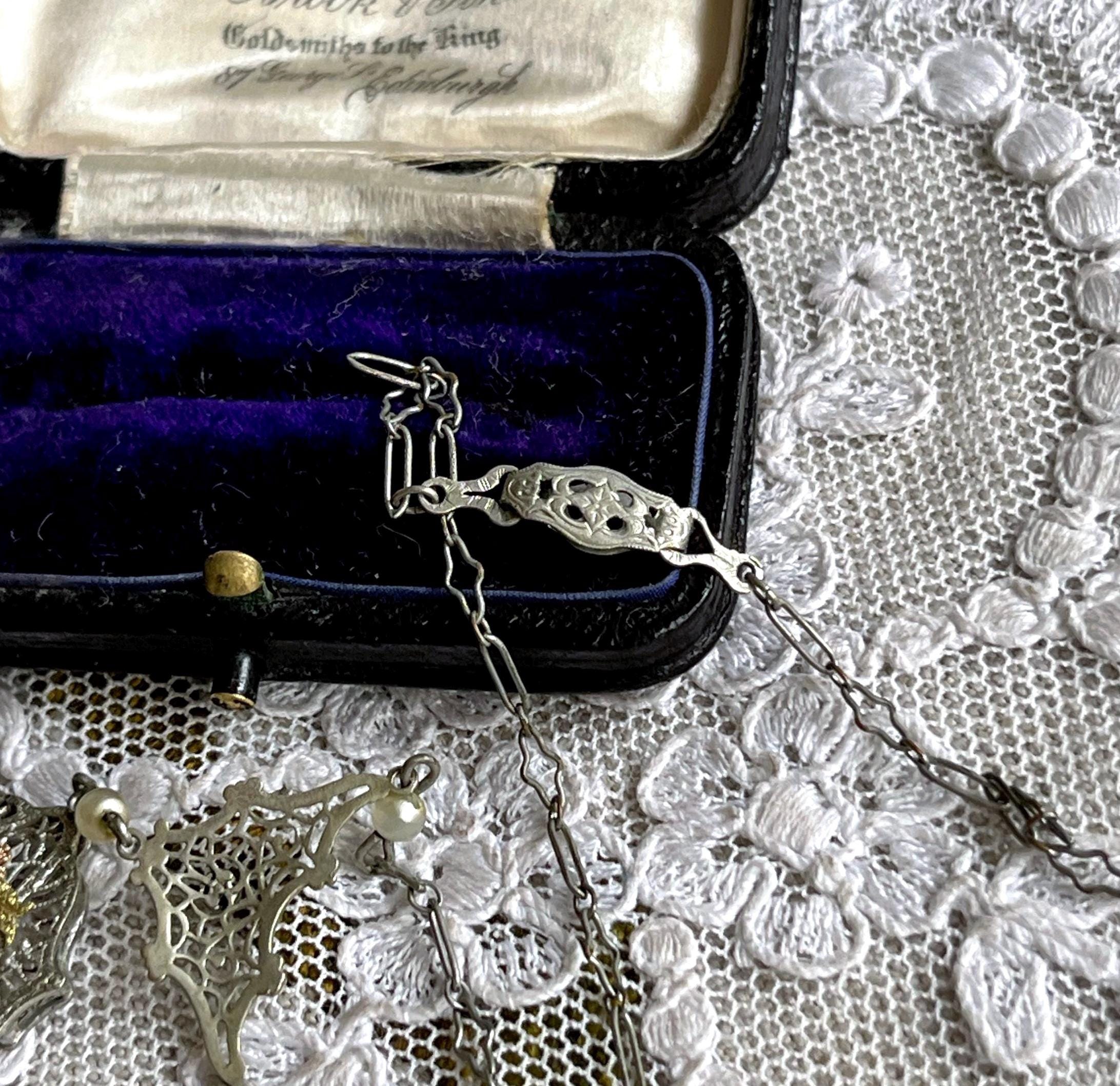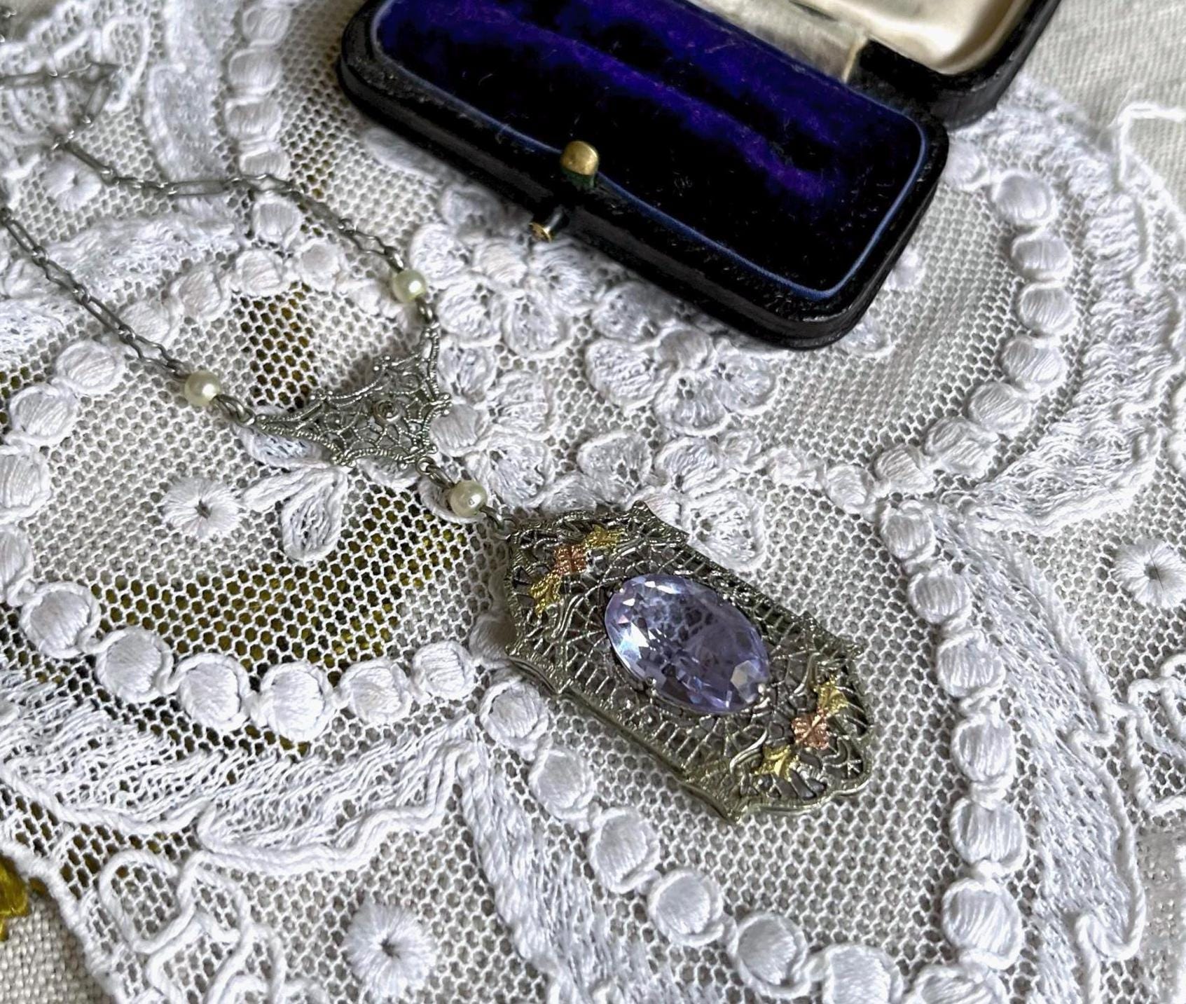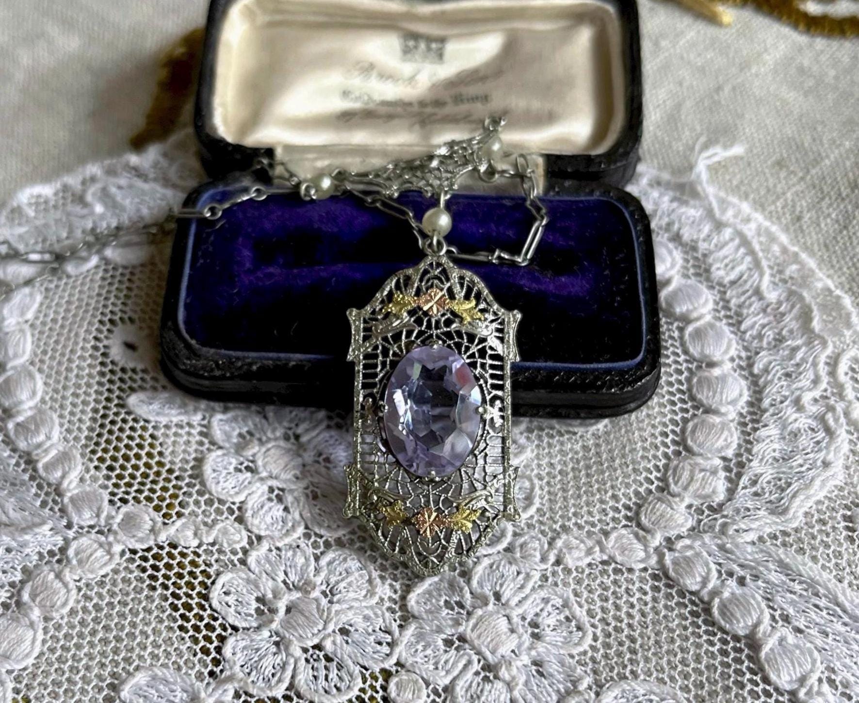 Featuring a sophisticated antique Edwardian Era delicate Rhodium plated gold rolled filigree Lavaliere Necklace adorned with a gorgeous faceted alexandrite purple paste stone accented with luminous glass seed pearls. Necklace measures approximately 16 inches around with a 2.1 inch pendant drop at 4.4 grams respectively. Necklace is in superb antique condition with functional antique fold over clasp, minimal wear with all stones intact and accounted for, is unsigned. Highly collectible this delicate necklace is beautifully designed and handcrafted over 100 years ago! Ready to wear!