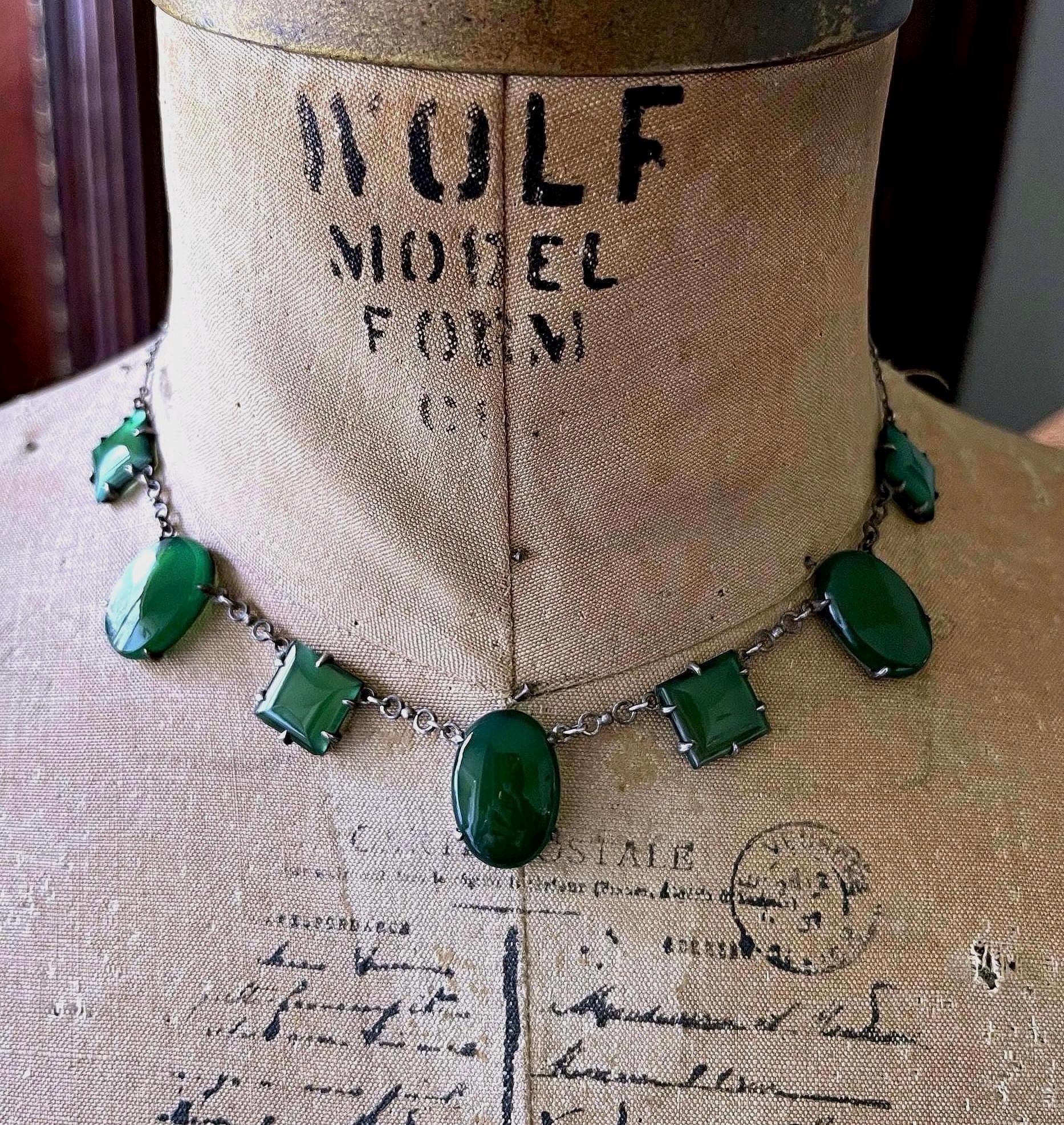Featuring a superb antique Art Deco circa hallmarked sterling silver collar necklace adorned with a pristine luminous Chrysoprase green Chalcedony cabochons set in beautiful open back pronged settings. Necklace measures approximately 15 inches around at 14.34 grams respectively. Necklace is in excellent antique condition with a functional stamped C spring clasp hallmarked STERLING, a beautiful patina with stones intact and accounted for. A gorgeous investment, beautifully designed and handcrafted over 100 years ago!