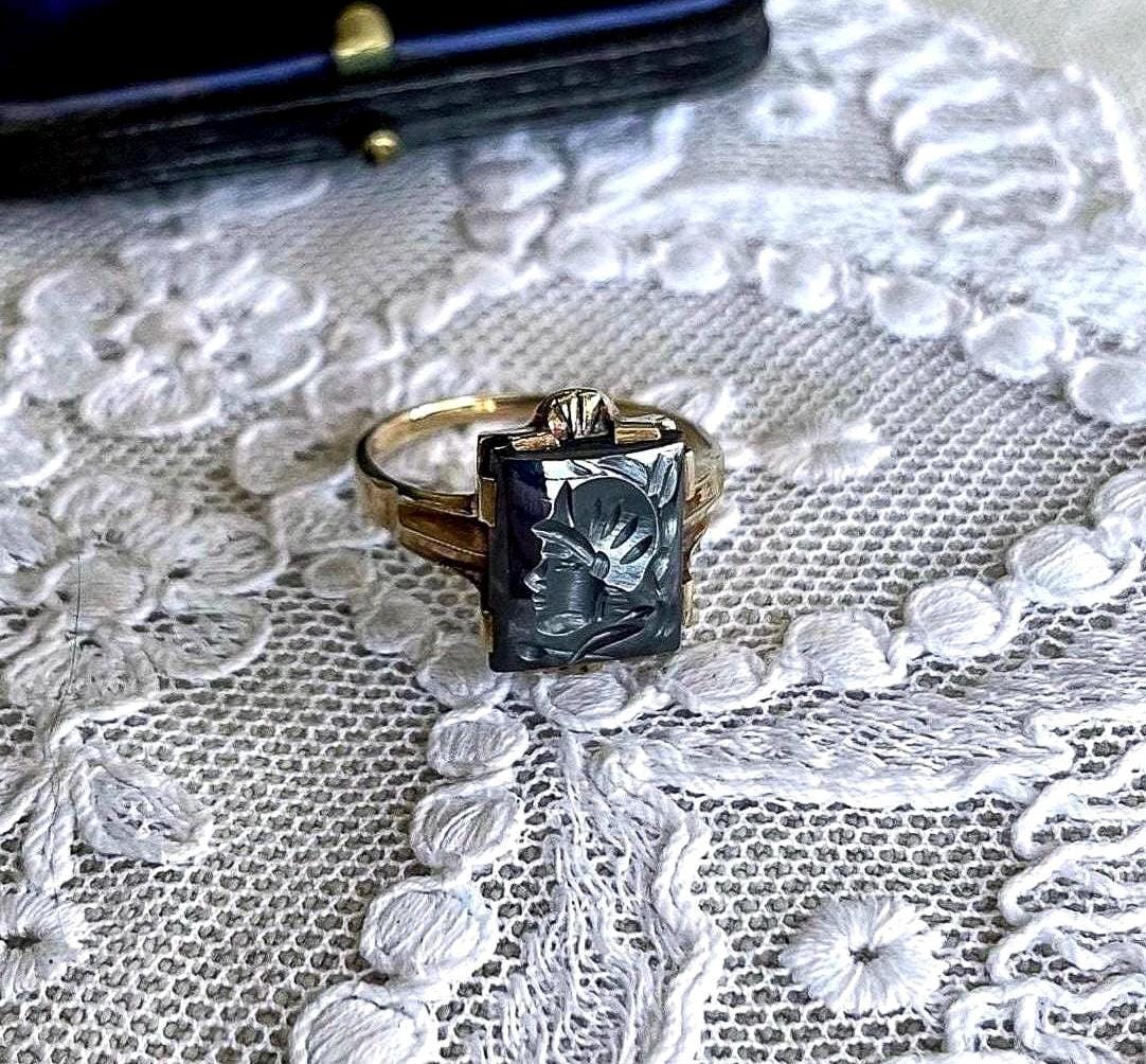 Featuring a fine vintage Art deco solid 10k yellow gold Roman Soldier Intaglio statement ring adorned with a luminous Hematite stone set in an open back setting. Hallmarked 10K on the inside of band ring is approximately size 7.5 at 3.2 grams respectively. Ring is in excellent vintage condition with minimal wear with all components intact and accounted for. beautifully designed, collectible and ready to pass on for generations.