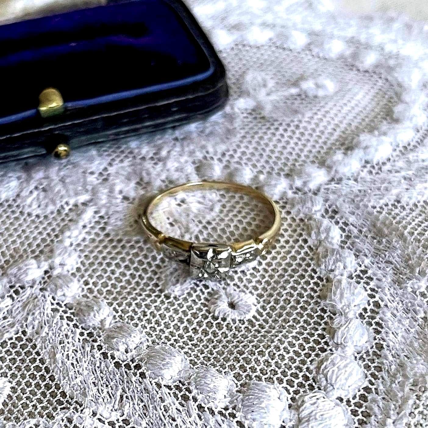 Gorgeous vintage Victorian Aesthetic 10k White and yellow gold genuine faceted Diamond accented beautiful stamped size 6.5 Solitaire Engagement Ring. Ring is in excellent antique condition with normal wear, beautifully designed with all components intact and accounted for. Approximately size 6.2 at 1.3 grams this is a gorgeous piece, stamped 10k JB on the inside of band. A definite appreciating heirloom engagement ring.