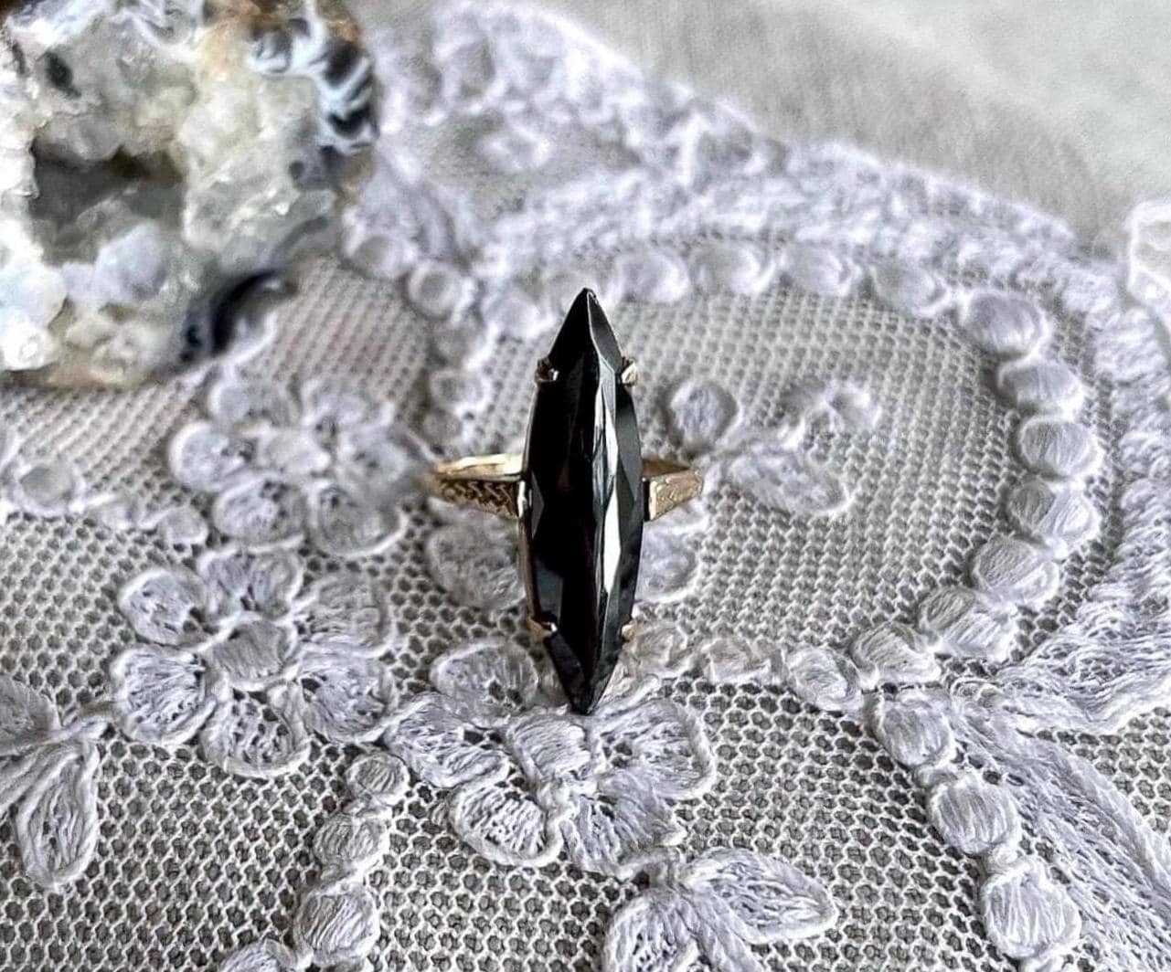Featuring a fine vintage Art deco solid 10k yellow gold cocktail ring adorned with a luminous faceted Marquis cut navette Hematite stone. Hallmarked 10K on the inside of band ring is approximately size 5.5 at 2.8 grams with stone measuring 25mm by 6mm respectively. Ring is in excellent vintage condition with minimal wear with all components intact and accounted for. beautifully designed, collectible and ready to pass on for generations.