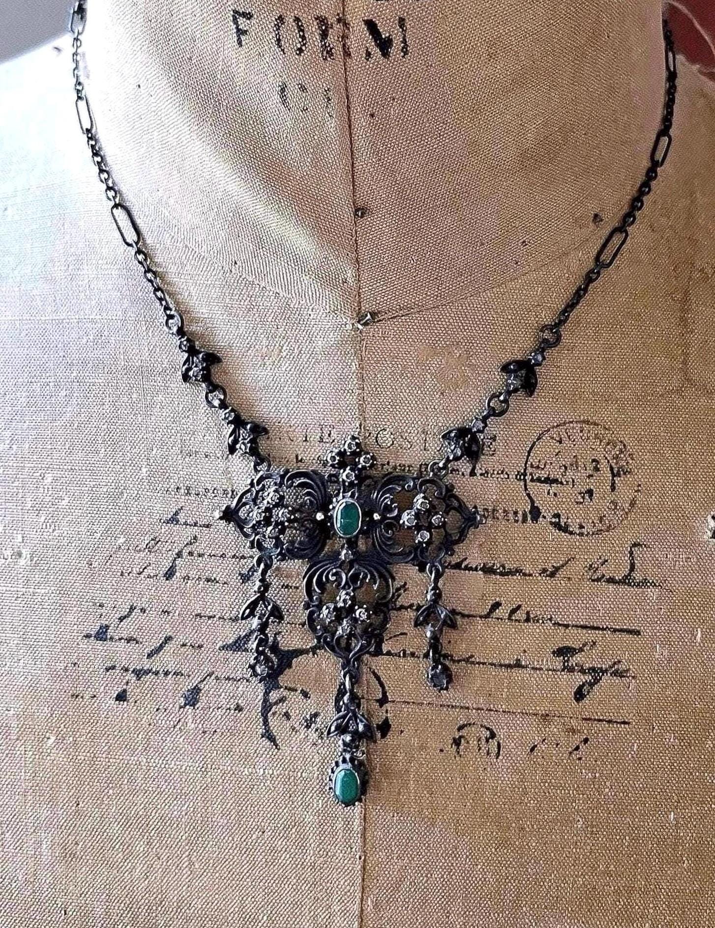 Featuring a truly stunning vintage Astro Hungarian Revival sterling silver festoon necklace adorned with genuine Moissanite accented with brilliant prong set open back simulated Emerald stones. Necklace measures approximately 16 inches around with a 2.5 inch pendant drop at 12.69 grams respectively. With a lovely oxidized sterling patina this necklace is in excellent vintage condition with a functional C spring clasp hallmarked 925 with all stones intact and accounted for. A wonderful way to invest in yourself and generations!