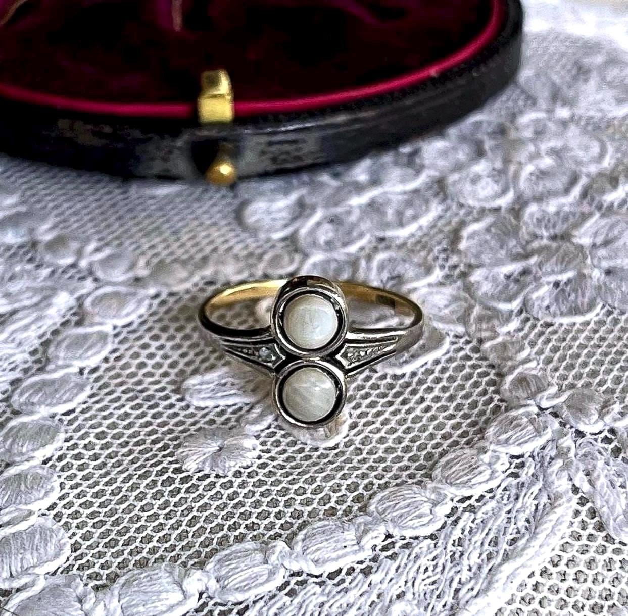 Featuring a sophisticated antique Edwardian Belle Époque delicate 14K yellow and white gold decorative filigree dinner ring adorned with two luminous natural pearls set in white gold settings accented with genuine Diamonds. Ring is approximately size 6 at 2.59 grams respectively and is hallmarked 585 on the inside of band. This fine dinner ring is in excellent antique condition with all stones intact. This timeless piece is beautifully crafted, ready to wear.