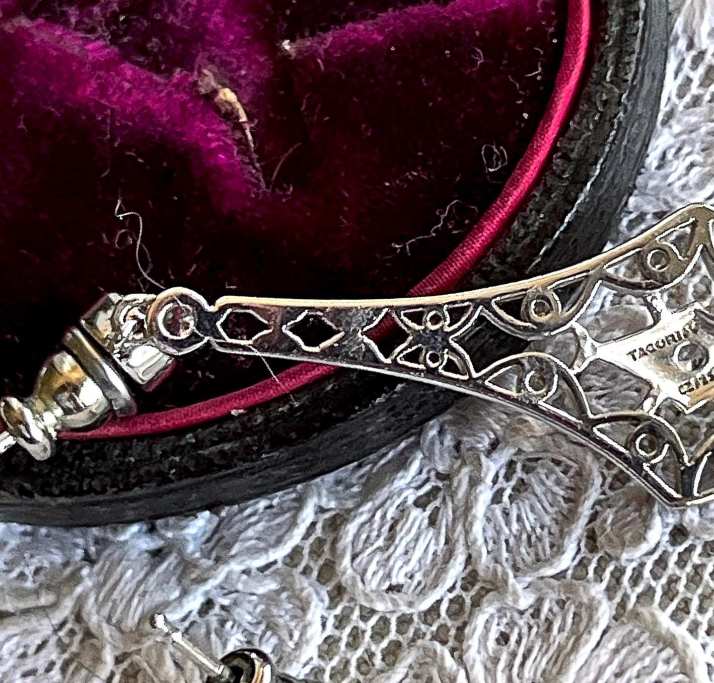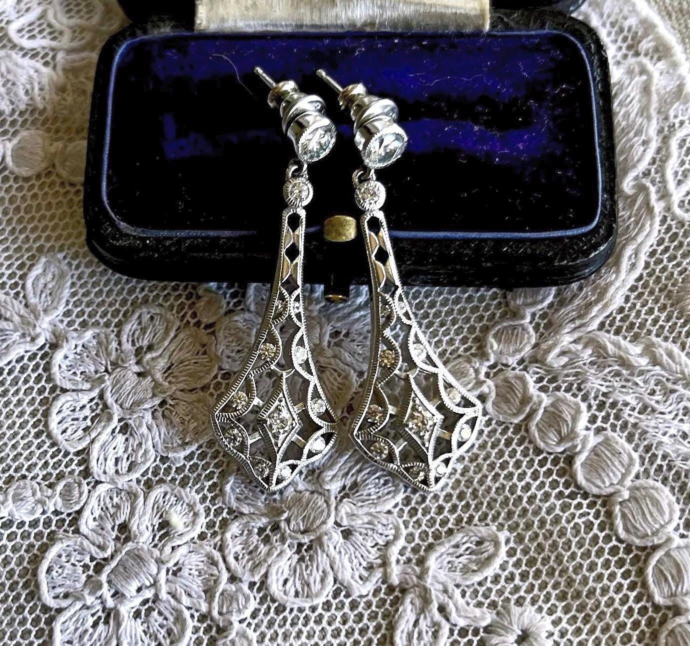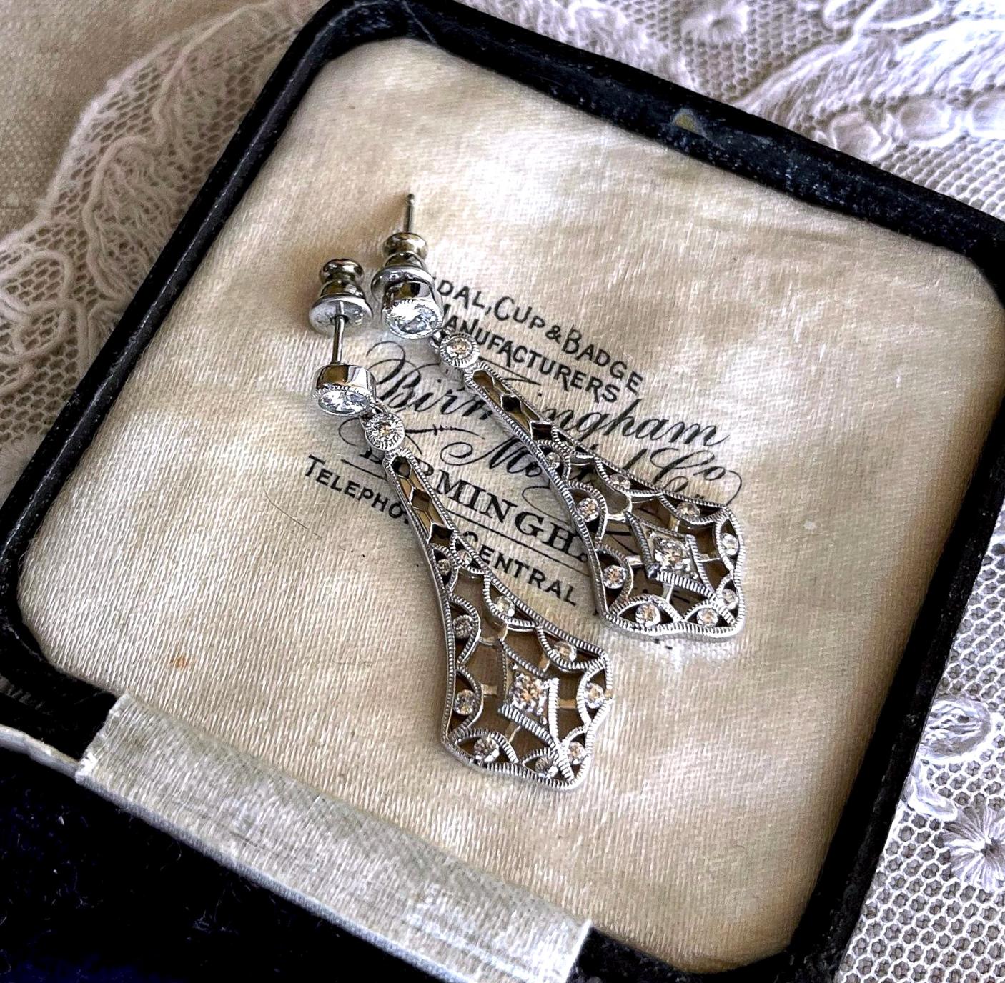 Featuring a beautiful pair of Tacori Art Deco styled sterling silver 925 pierced drop earrings adorned with brilliant faceted CZ crystals. Earrings are in pristine condition with all stones accounted for. Earrings measure approximately 1.5 inch long at 5.8 grams respectively and are stamped 925 TACORIIV on both pieces. Elegant and ready to wear!