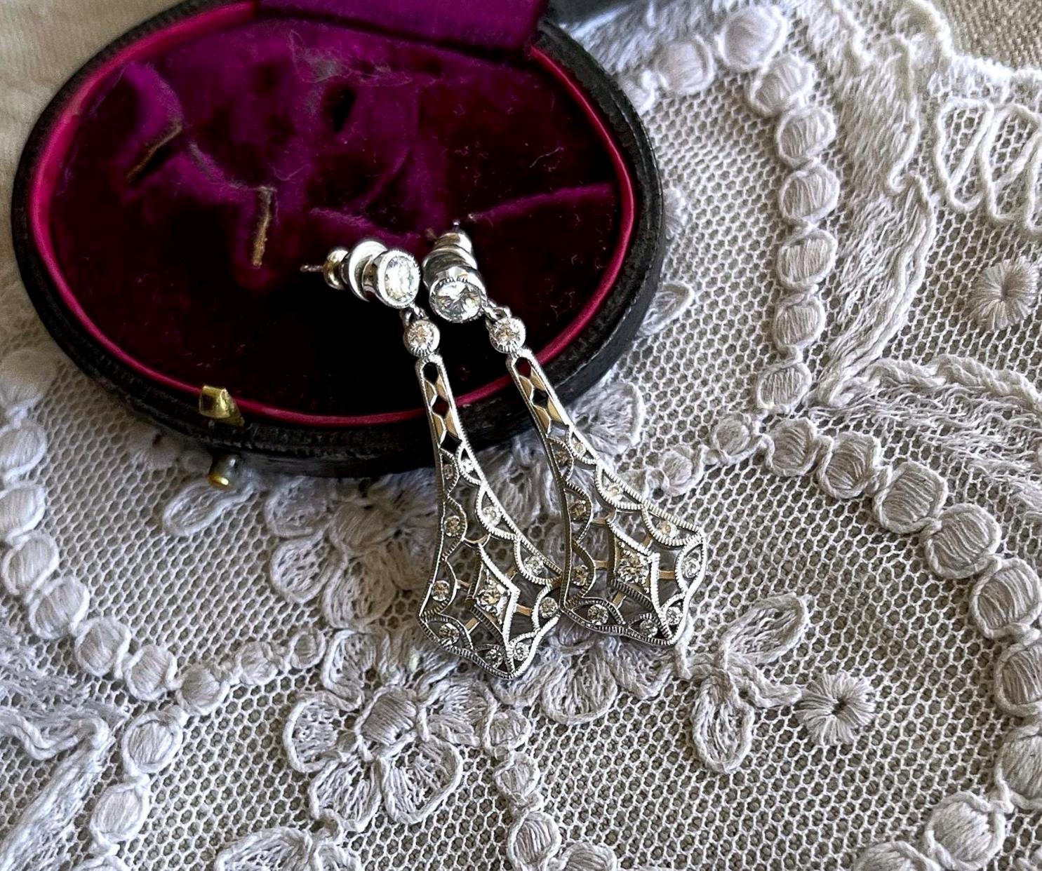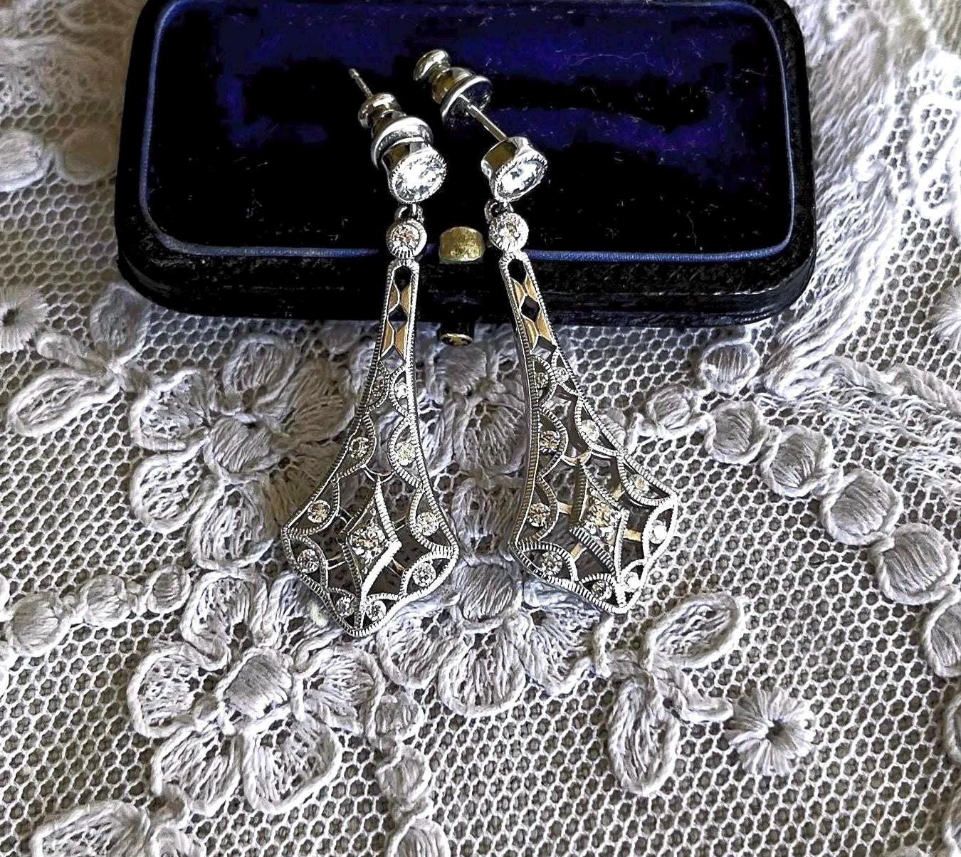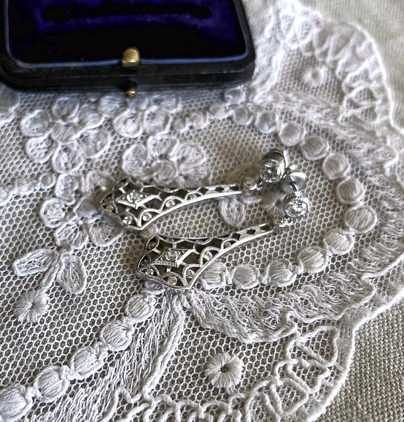 Featuring a beautiful pair of Tacori Art Deco styled sterling silver 925 pierced drop earrings adorned with brilliant faceted CZ crystals. Earrings are in pristine condition with all stones accounted for. Earrings measure approximately 1.5 inch long at 5.8 grams respectively and are stamped 925 TACORIIV on both pieces. Elegant and ready to wear!