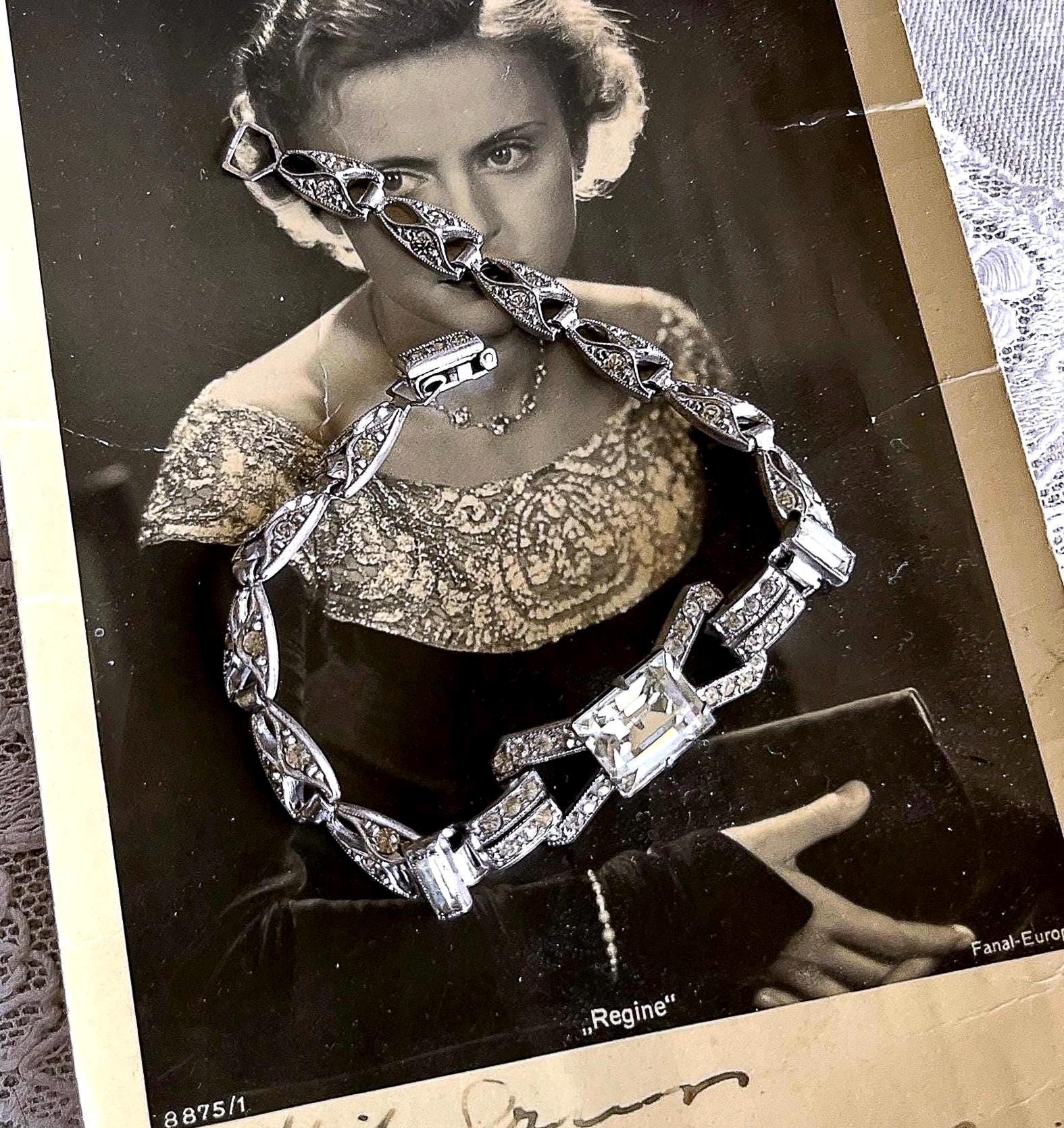 Featuring a dazzling 1930s Art Deco sterling silver hallmarked link bracelet adorned with brilliant faceted paste stones. Bracelet is in excellent antique condition with a functional fold over clasp, normal wear with all stones intact and accounted for. This collectible bracelet measures approximately 7 inches around at 11 grams respectively and is stamped STERLING on the reverse. Beautifully designed, a gorgeous collectible wearable piece!