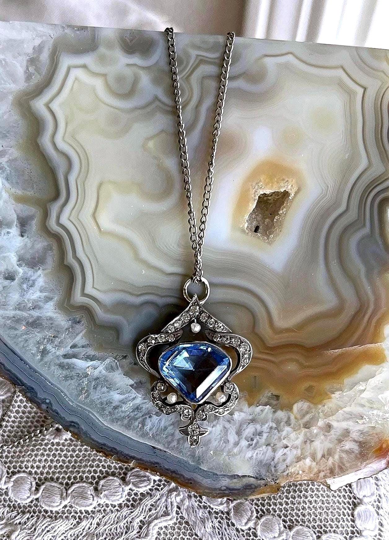 Featuring a lovely antique 1910s-20s Edwardian Era delicate sterling silver pendant necklace adorned with a beautiful sapphire blue and white faceted Paste Stones set in a decorative Sterling setting. Necklace measures approximately 18 inches around with pendant measuring approximately 2.1 inches at 7.95 grams respectively. This lovely collectible necklace is in excellent antique condition with a functional stamped C spring clasp, a slight patina with all stones intact and accounted for, stamped STERLING on the reverse of pendant. Elegant, collectible and wearable, this is a beautifully designed and elegant antique necklace!