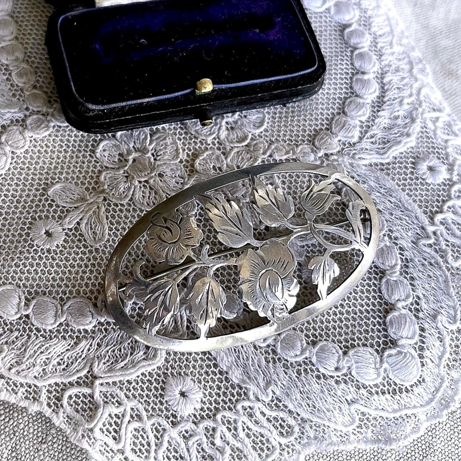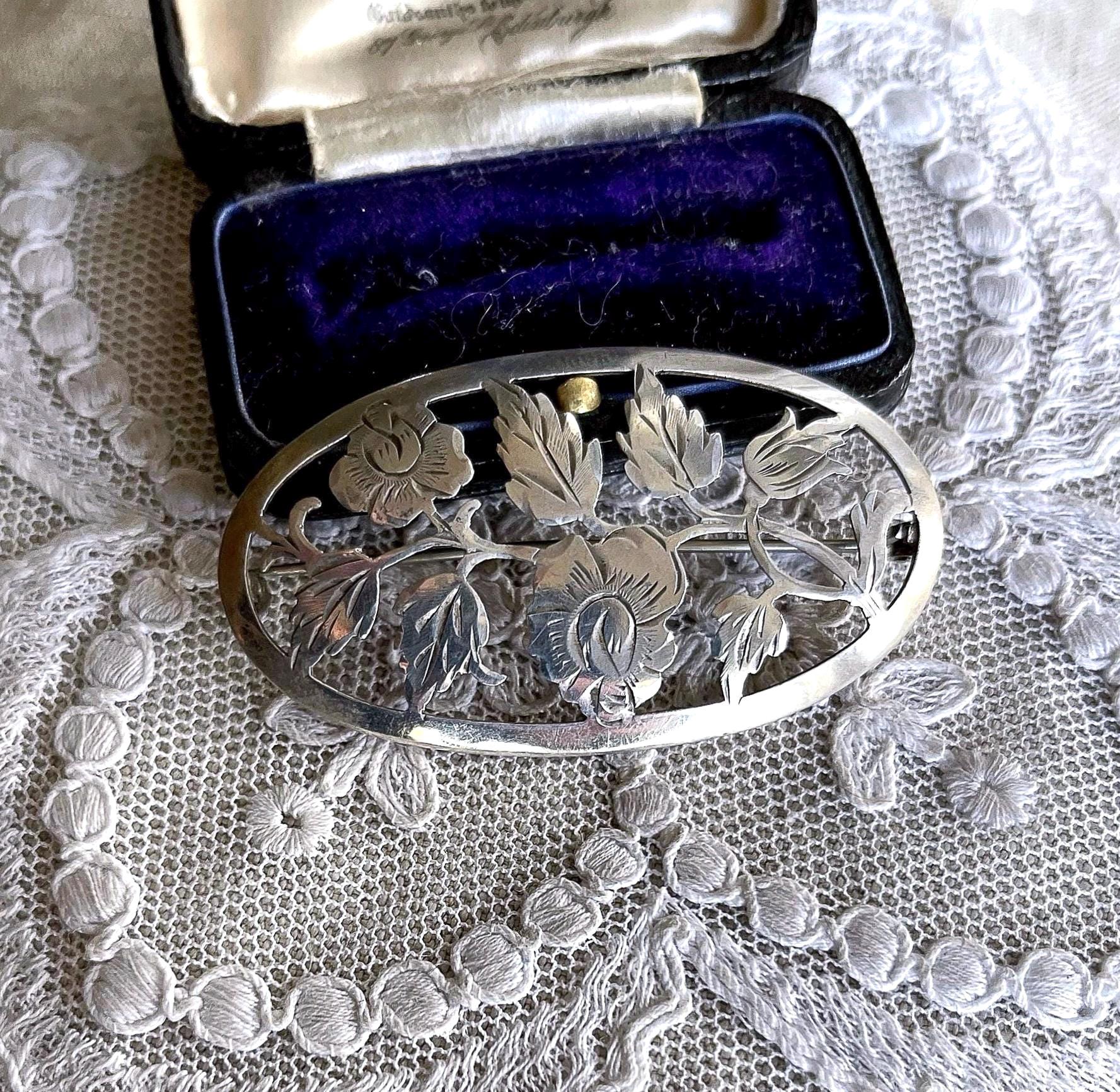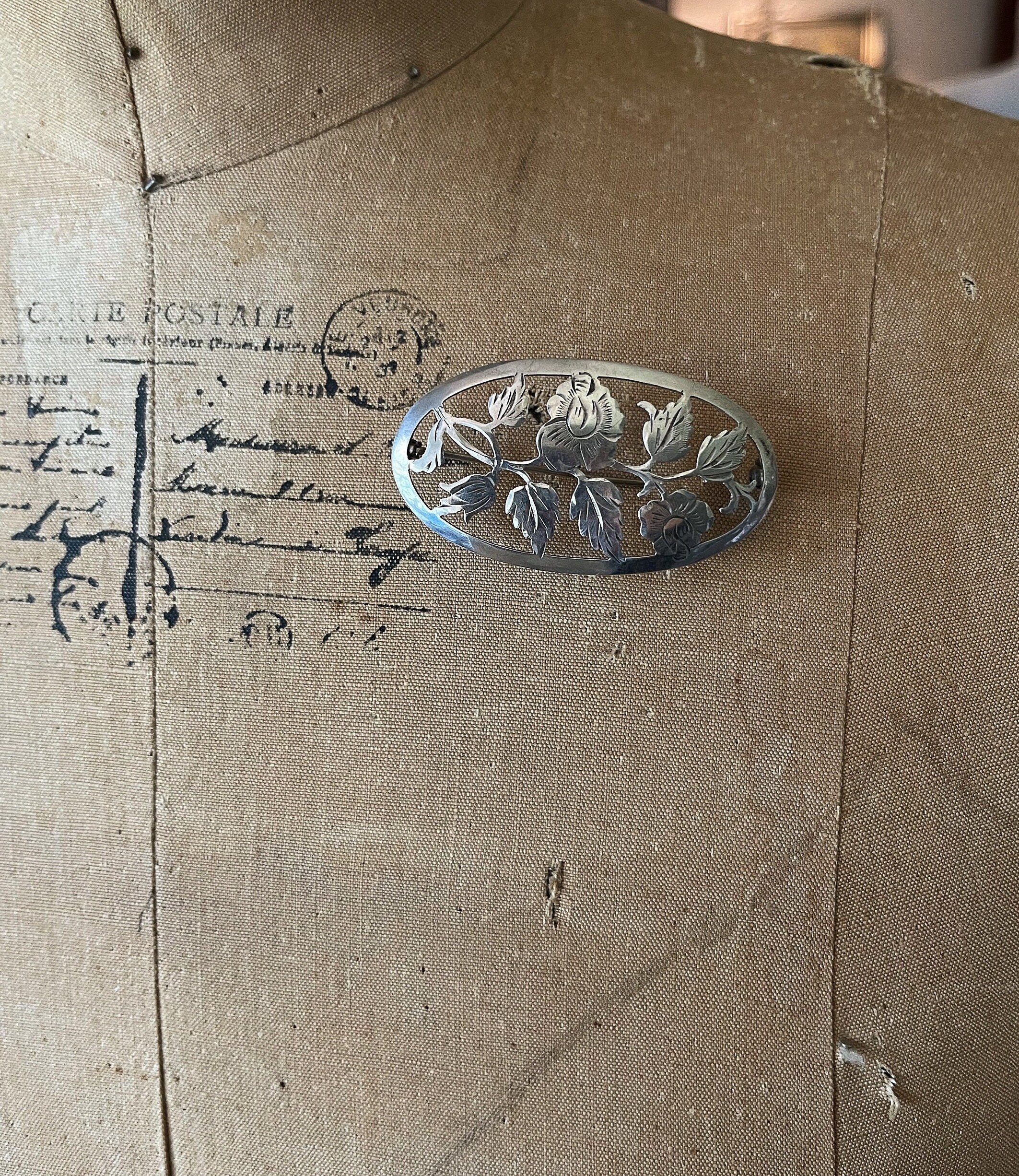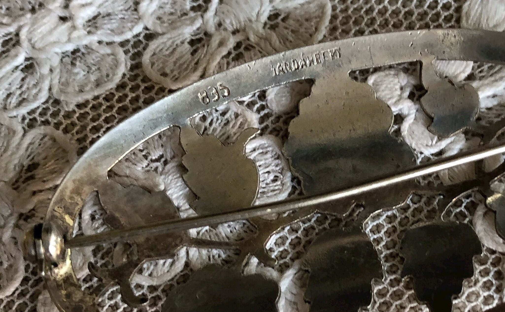 Featuring a beautiful handcrafted vintage 1940s Austrian/German Handarbeit floral motif oval statement brooch stamped 835 HANDARBEIT on the reverse. Brooch measures approximately 2 by 1 inch at 6.6 grams respectively. This rare beautifully designed and handcrafted piece is completely wearable!