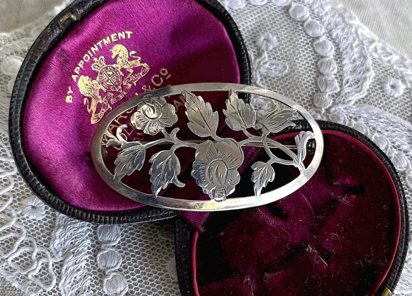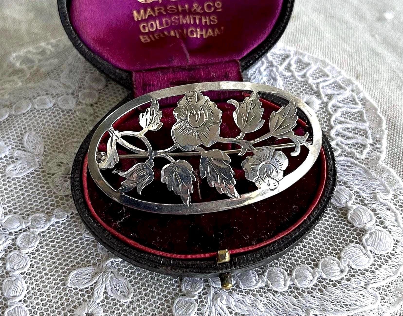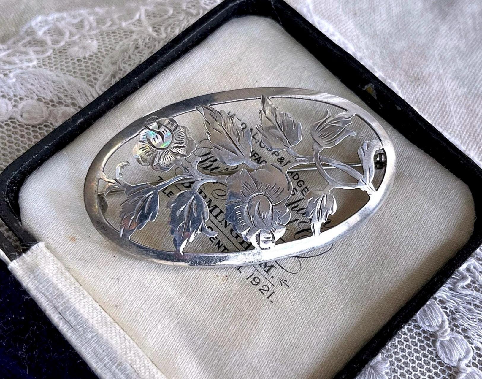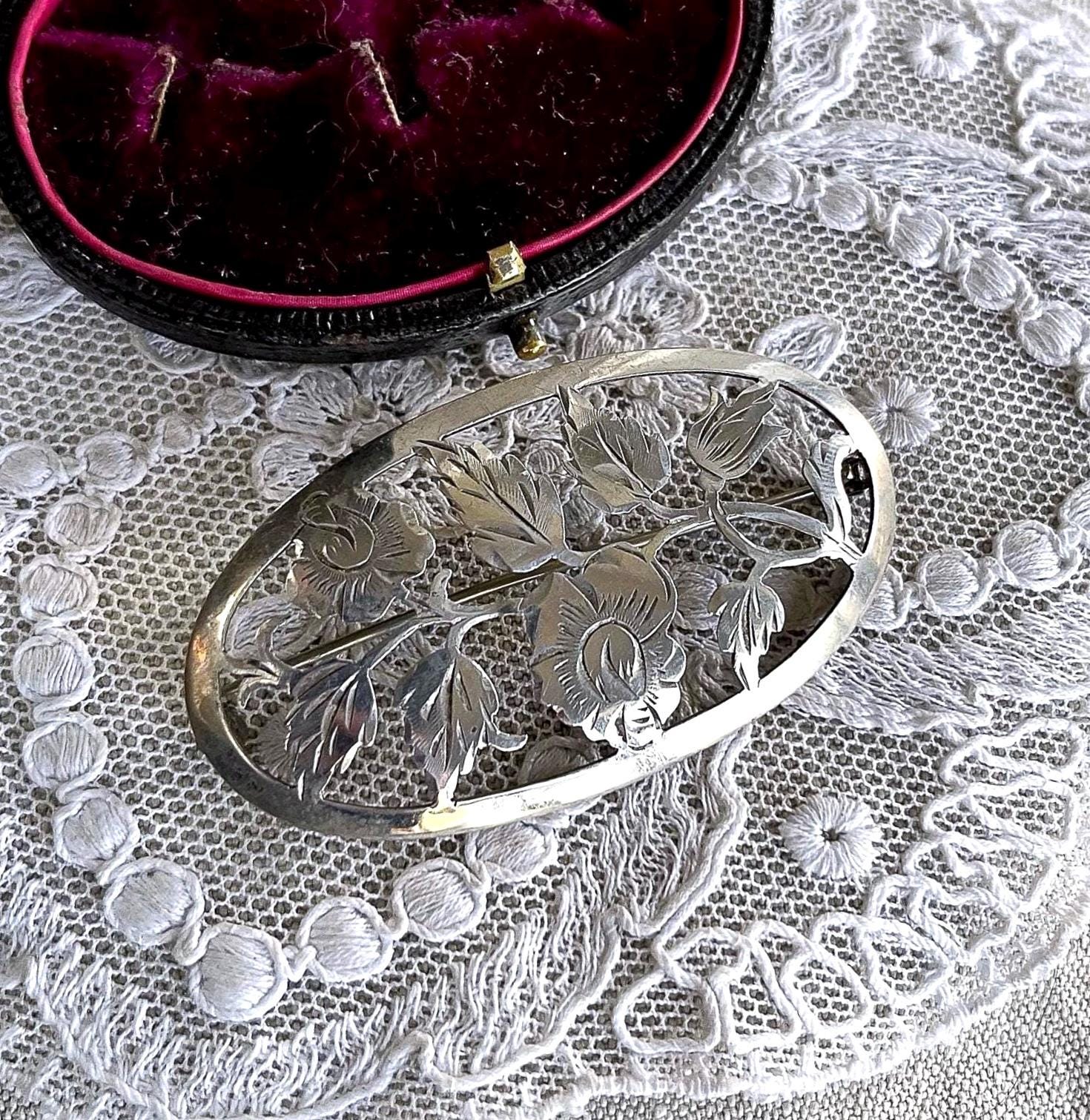 Featuring a beautiful handcrafted vintage 1940s Austrian/German Handarbeit floral motif oval statement brooch stamped 835 HANDARBEIT on the reverse. Brooch measures approximately 2 by 1 inch at 6.6 grams respectively. This rare beautifully designed and handcrafted piece is completely wearable!