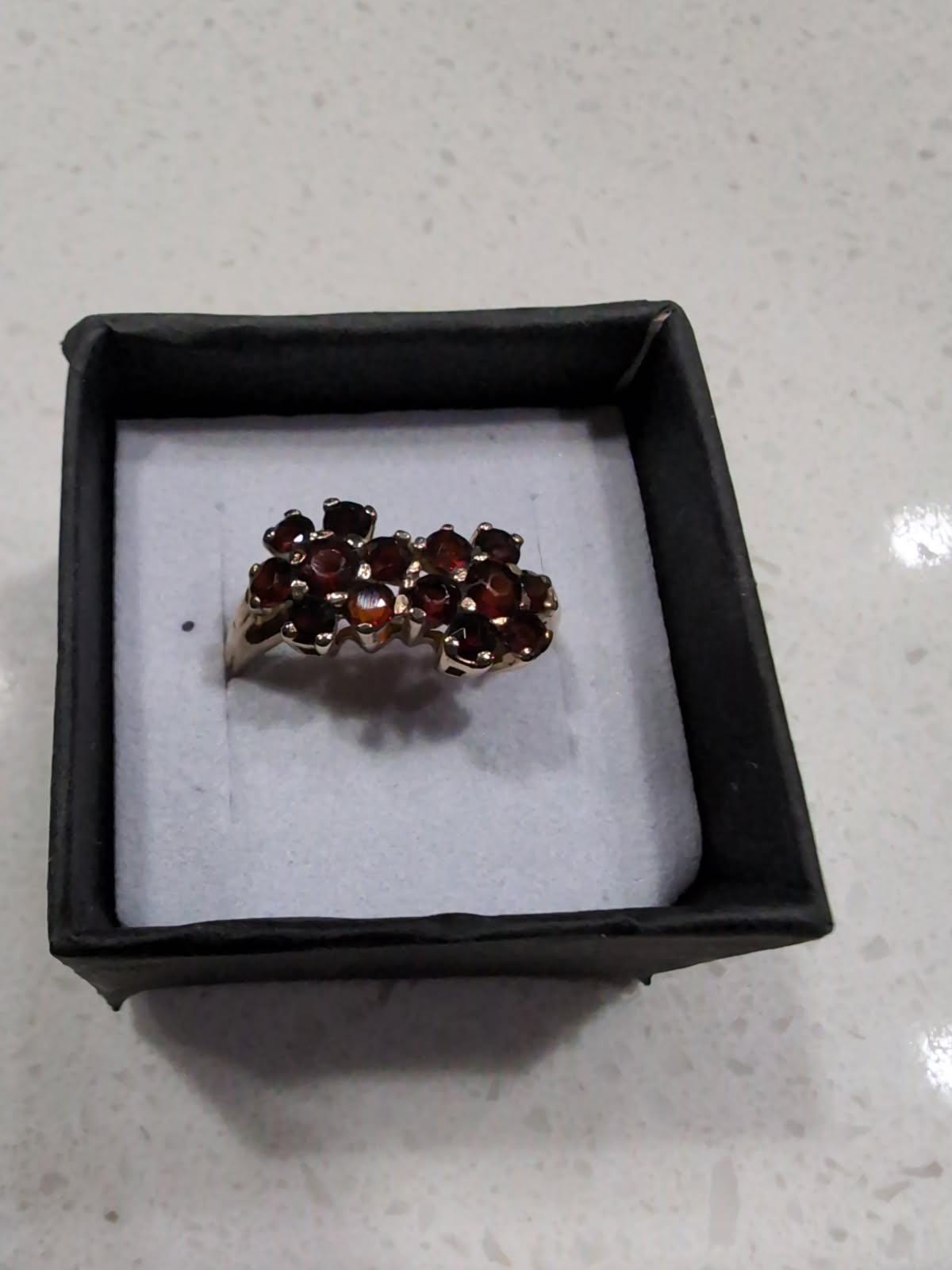 Featuring a beautiful demure vintage size 7 10k yellow gold cluster ring adorned with brilliant faceted genuine Garnets set in a cluster setting. Ring is in excellent vintage condition with minimal wear with all stones intact and accounted for. Approximately size 7 at 2.24 grams respectively, faintly stamped tested as 10K this is an elegant vintage ring, beautifully designed and ready to wear!