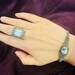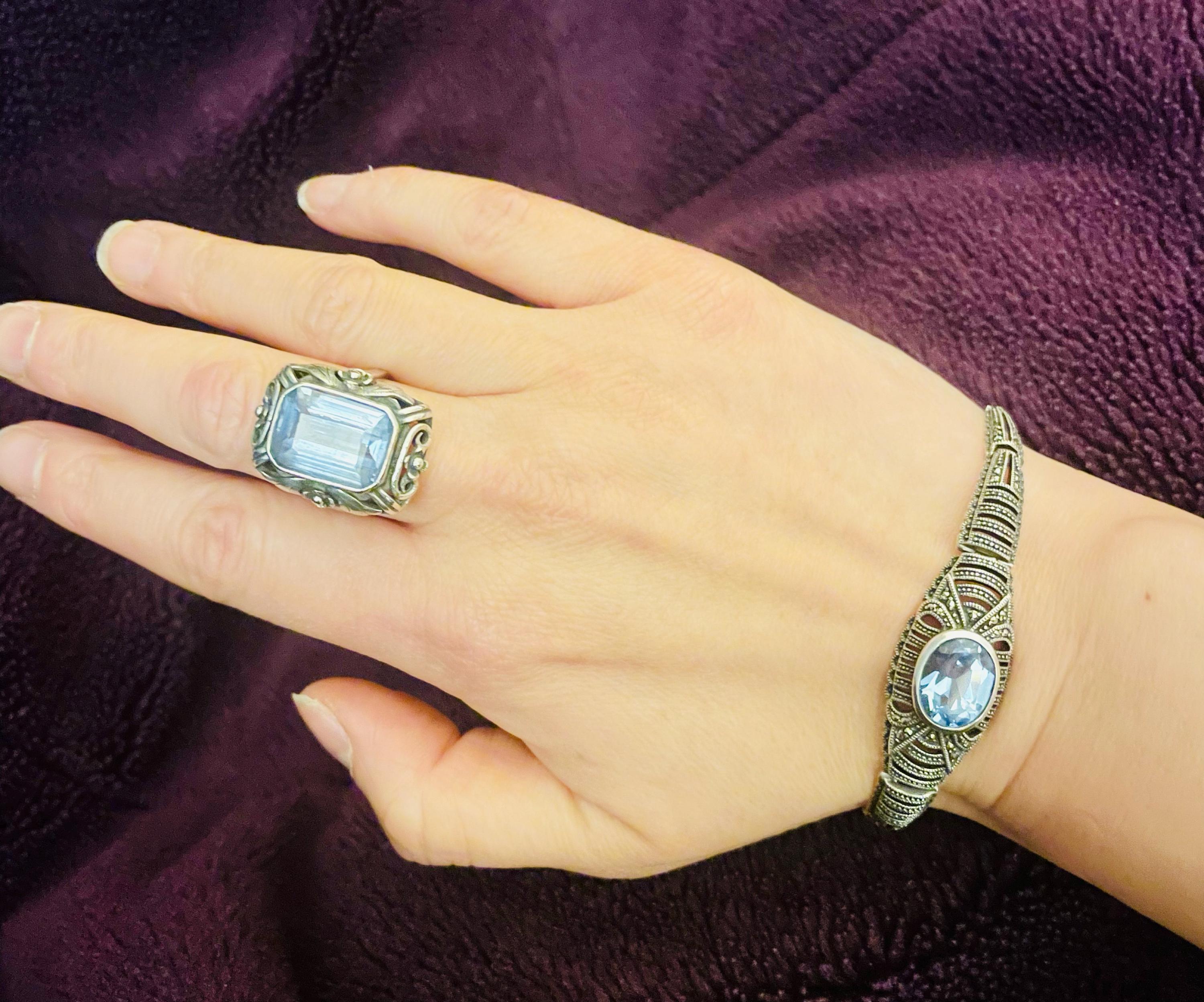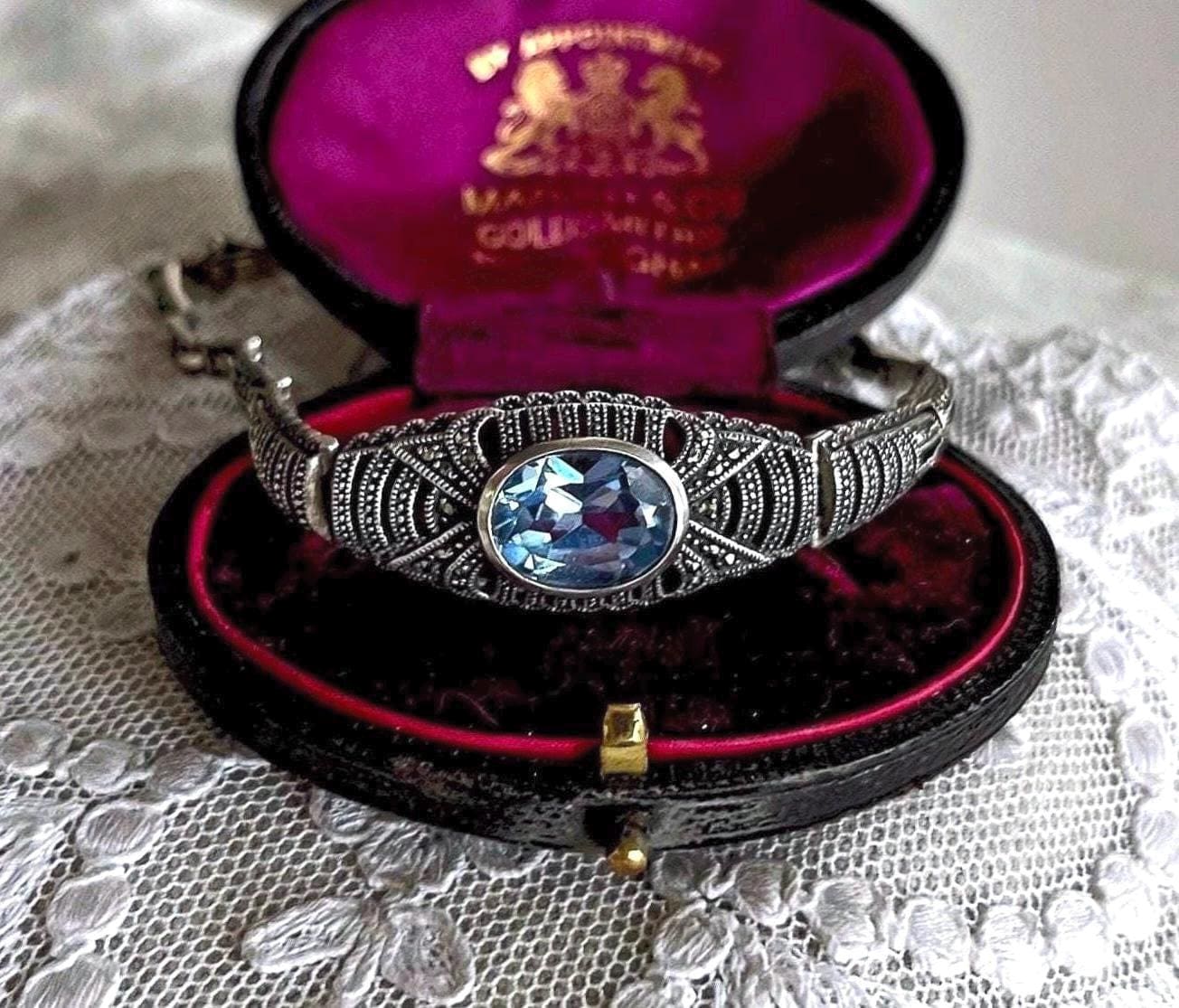 Featuring a gorgeous vintage Art Deco hallmarked sterling silver 925 link bracelet adorned with a radiant faceted genuine Topaz gemstone accented with sparkling faceted marcasite crystals. Bracelet is in excellent antique condition with a functional slide clasp stamped 925 , with all stones intact and accounted for. This spectacular piece is beautifully made measuring approximately 6.5 inches long at 15.6 grams respectively. A perfect “something blue” heirloom bracelet.