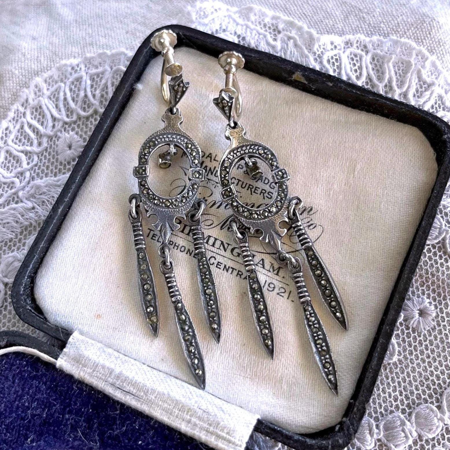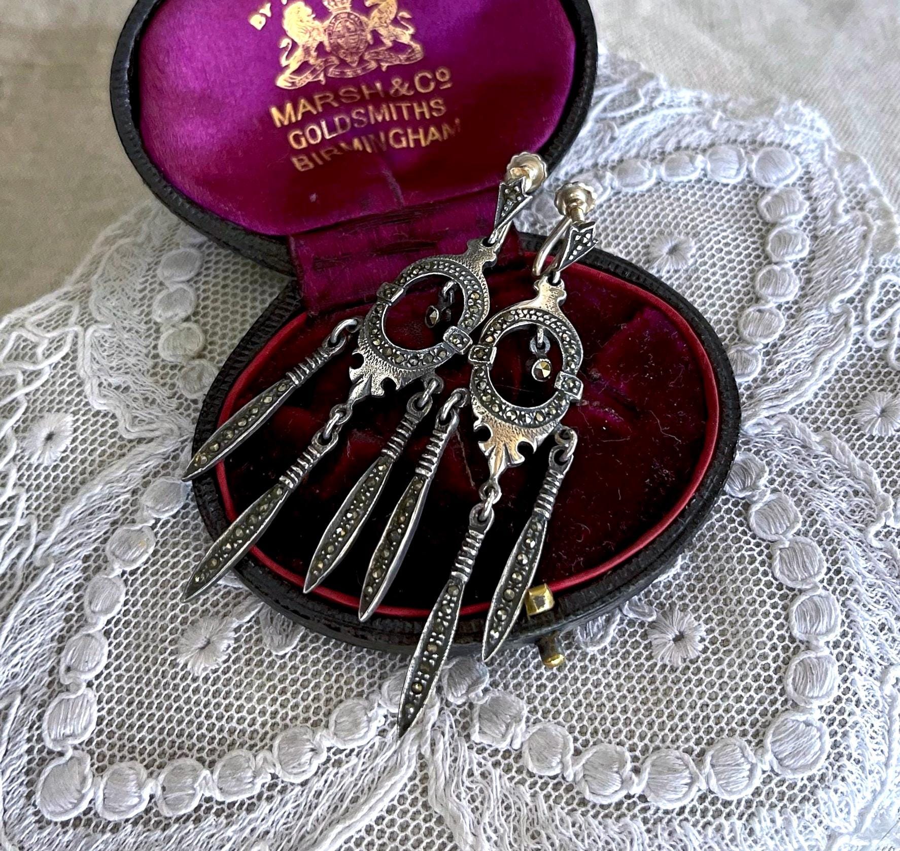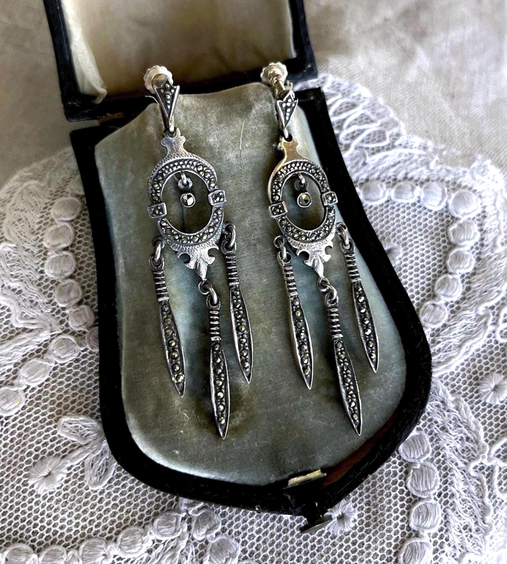 Featuring a wonderful pair of vintage Art Deco solid sterling silver beautiful screw back drop earrings accented with brilliant sparkling faceted marcasite crystals set in closed settings. Earrings are in excellent antique condition with functional clasp hallmarked STERLING and 925 on the reverse of dangles, a beautiful patina with all stones intact and accounted for. Measuring approximately 2.5 inches long at 11:15 grams respectively this beauties are completely wearable, collectible and always appreciating!