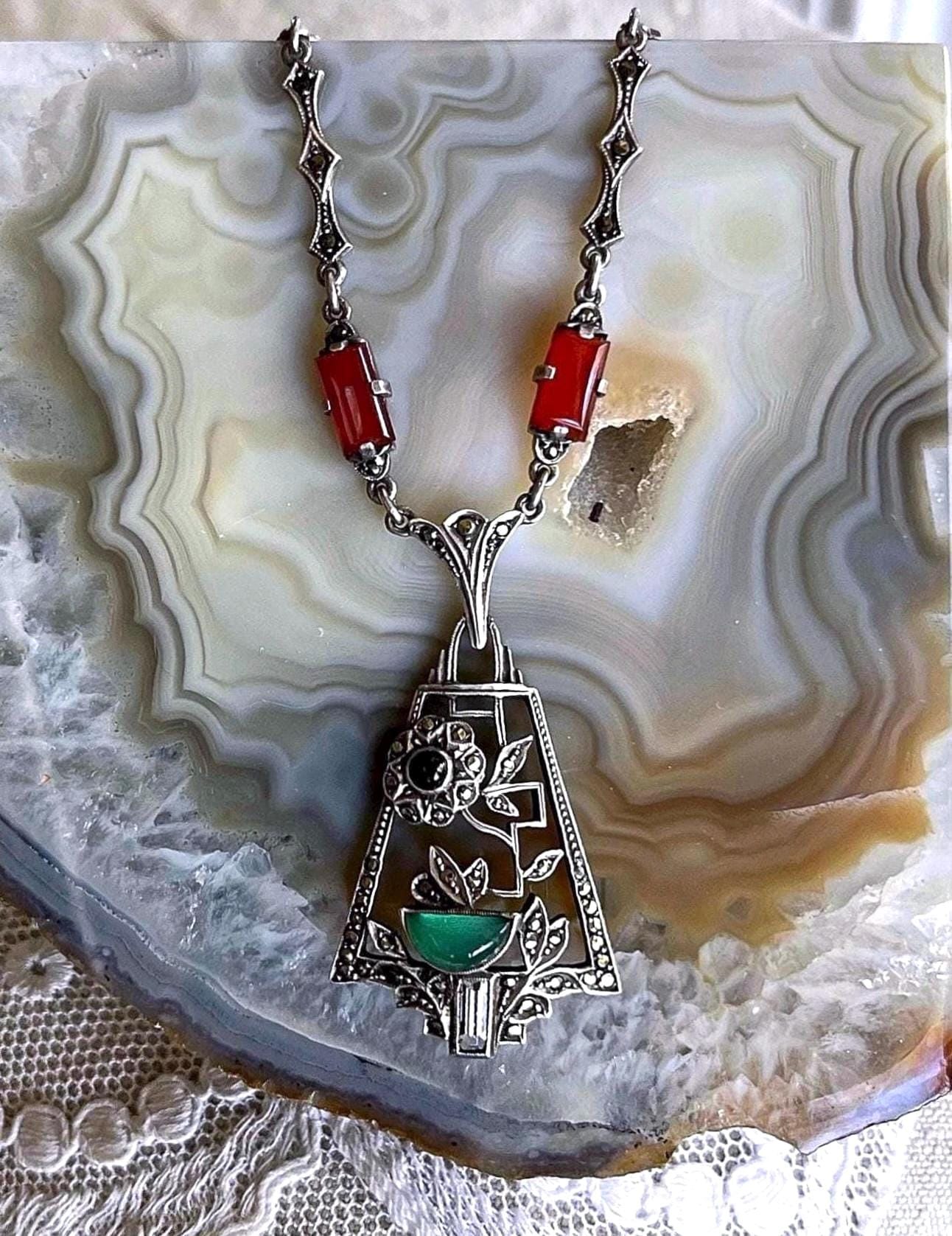 Featuring an outstanding antique 1920s German Art Deco solid sterling silver Negligée Y necklace adorned with absolutely beautiful genuine Carnelian, Chrysoprase and onyx gemstones accented with brilliant faceted marcasite crystals set in a delightful setting. Necklace is in excellent antique condition with a lovely oxidized patina, a stamped GERMANY STERLING functional stamped slide clasp with all stones intact and accounted for. Measuring approximately 15.5 inches around with a 2 inch pendant drop at 12.91 grams respectively. This piece is just so elegant, sophisticated and wearable. These pieces always appreciate and are investments worth wearing!