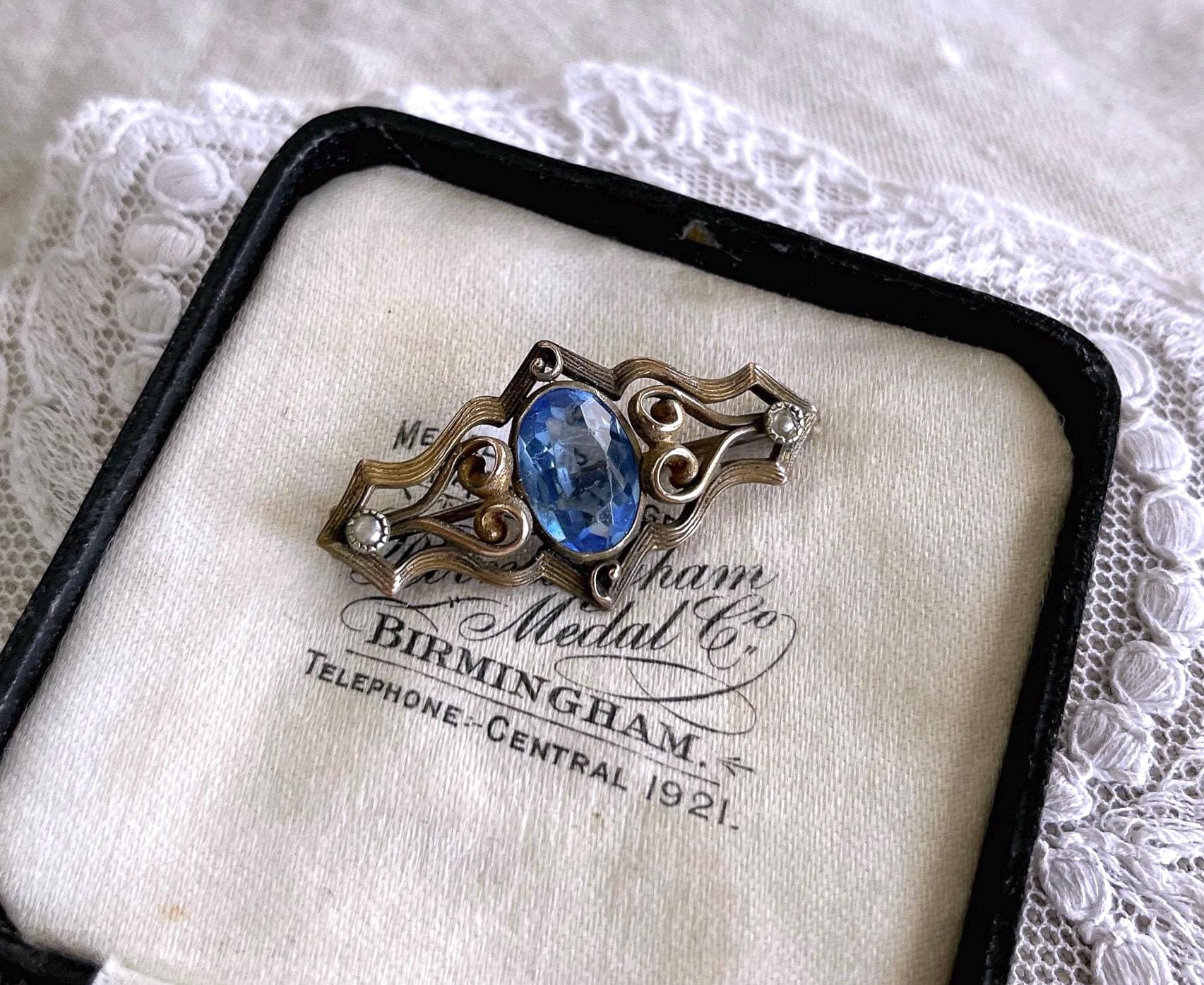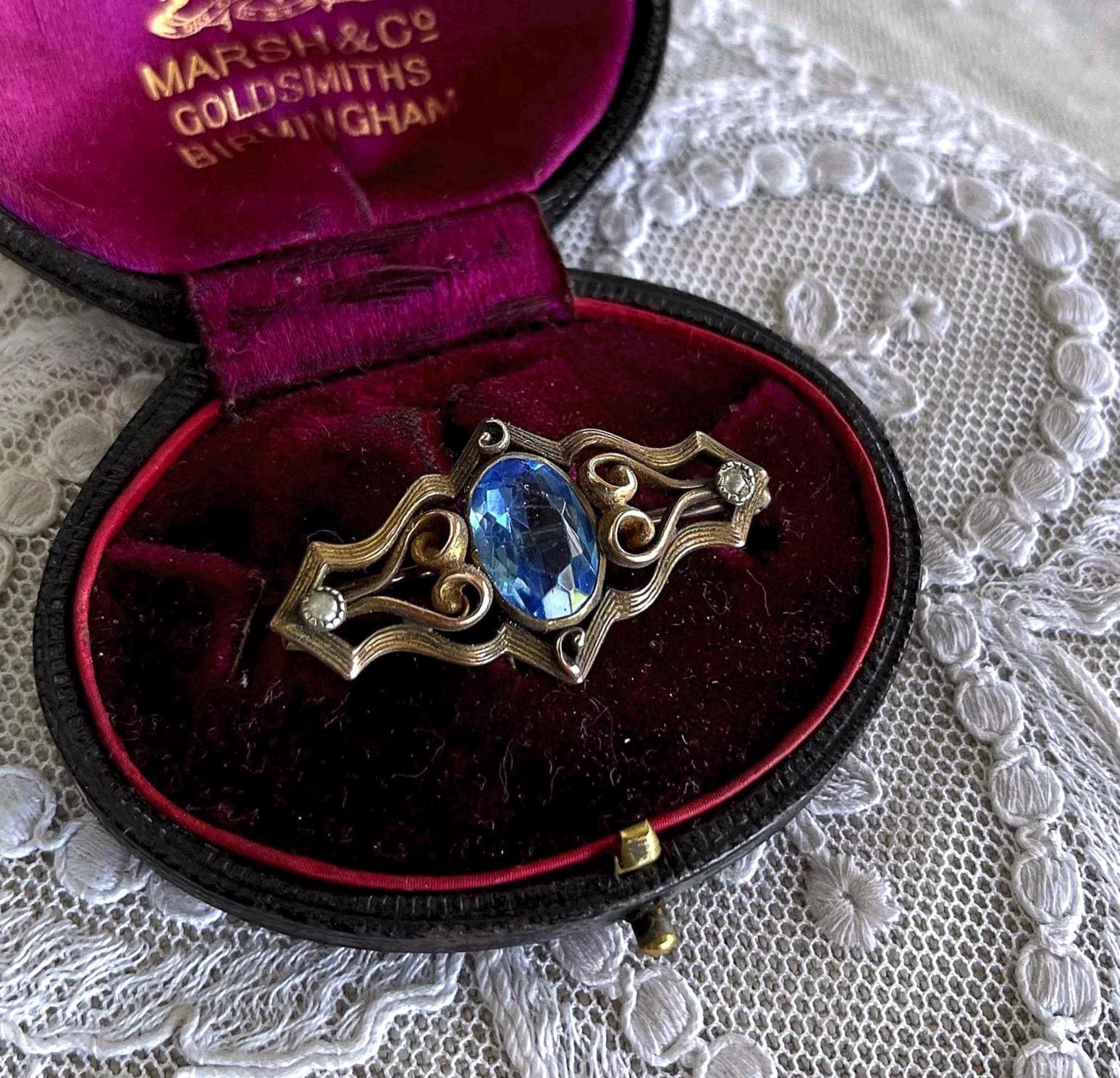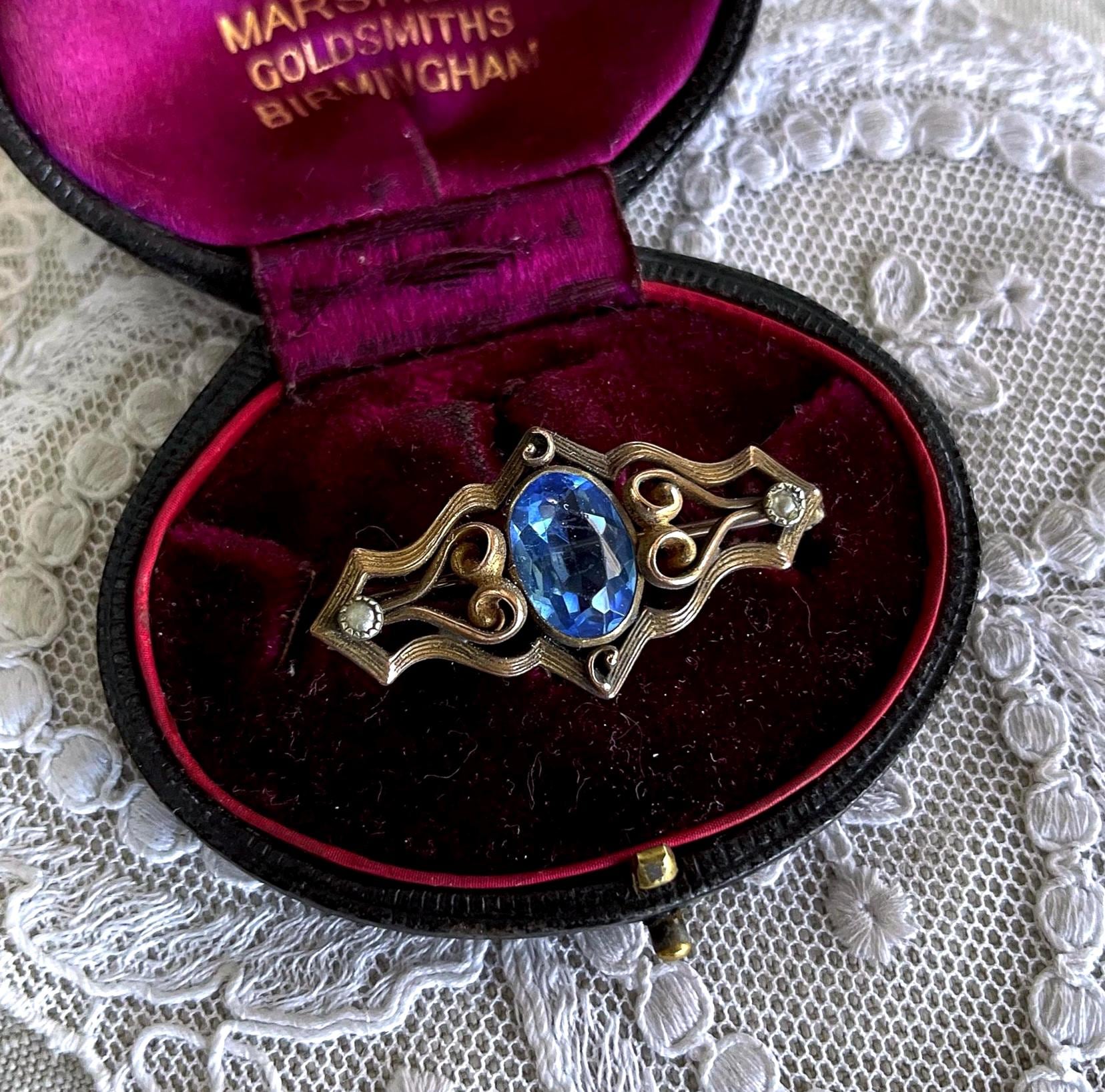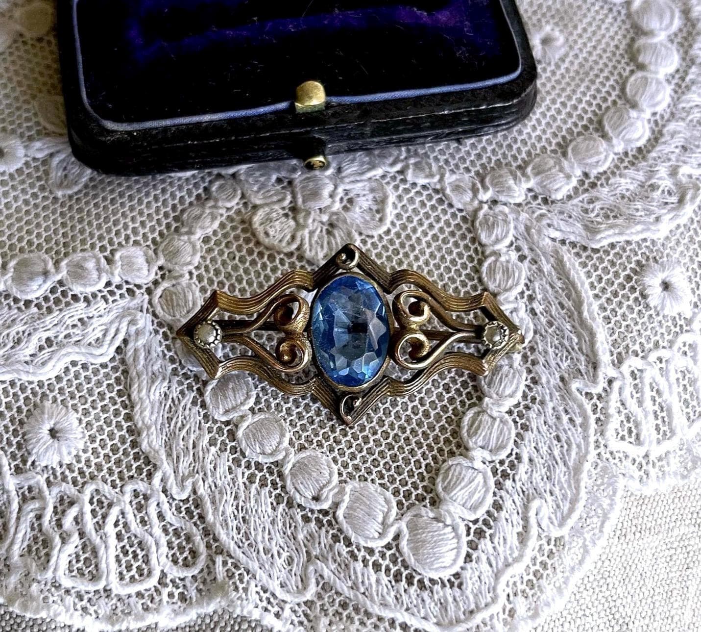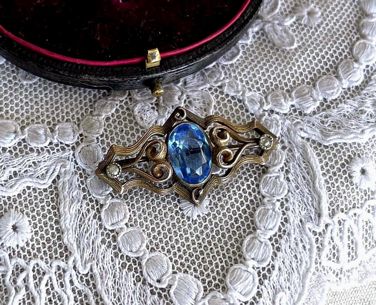 Featuring a classic antique Edwardian E.I. Franklin & Co. 1910-1920s beautiful Gold Pinchbeck lapel brooch adorned with a fabulous bright blue bezel set faceted paste stone accented with genuine seed pearls. Bracelet measures approximately 1.5 inches around at 3.89 grams respectively. This elegant bracelet is in excellent antique condition with a functional antique C clasp, with all stones intact and is stamped E.F.F. & Co with patent number on the bale of clasp. A wonderful collectible piece, beautifully handcrafted and designed! Collectible and wearable!