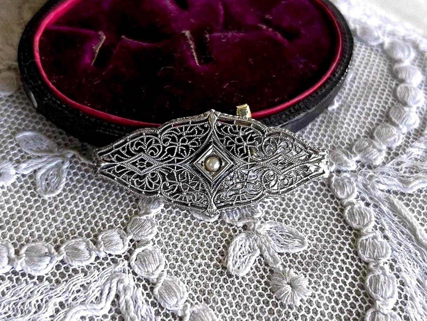 Featuring a lovely vintage 1930s Art Deco Edwardian design delicate rhodium plated sterling silver filigree lapel brooch accented with a luminous genuine seed pearl. Brooch measures approximately 1.8 inches long at 2.52 grams respectively and is in excellent antique condition with virtually no wear, a functional Clasp with all stones intact and accounted for. Brooch is unsigned, beautifully made and wonderful collectible piece!